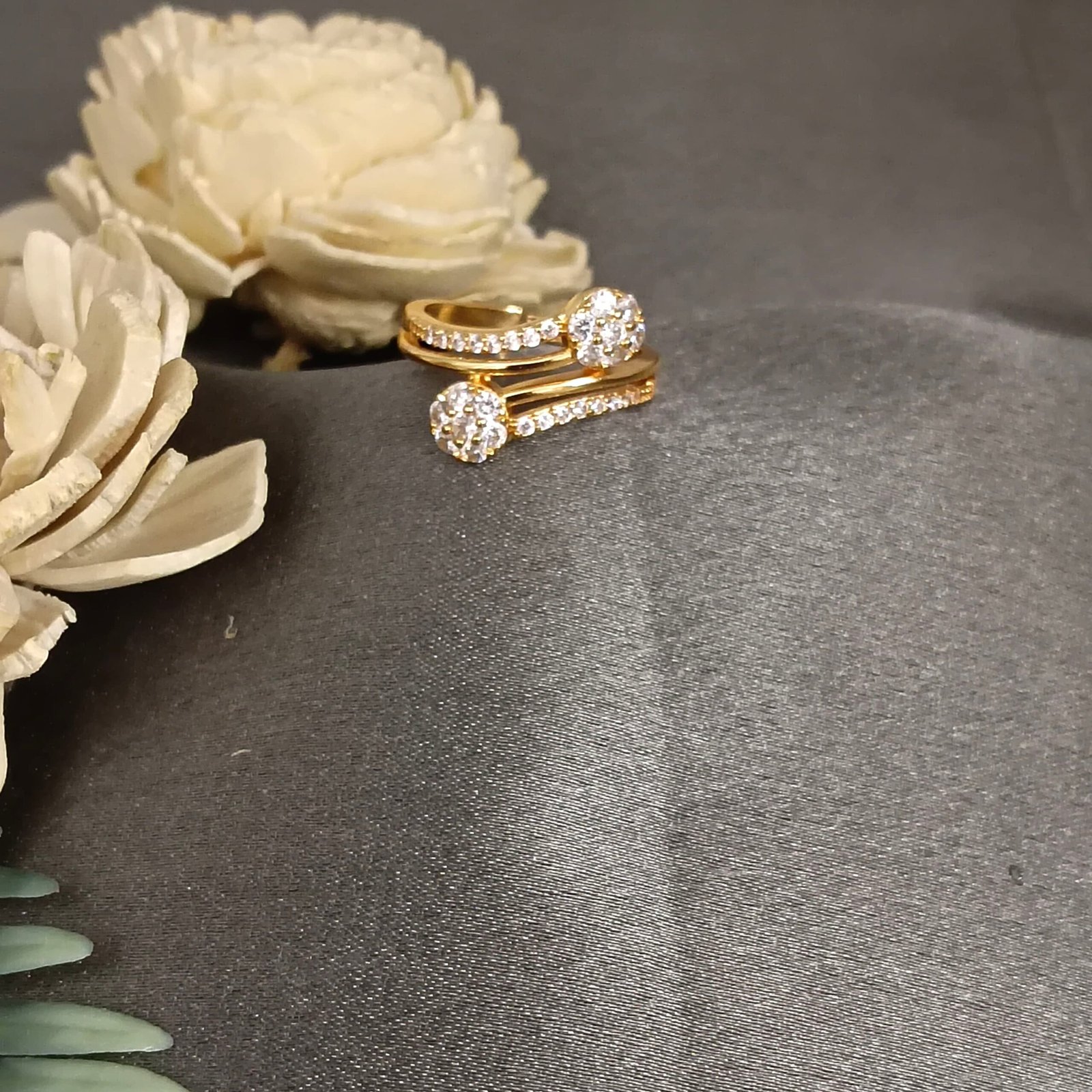 - PRODUCT DETAILS: This modern gold-tone ring is all about sleek style with a hint of sparkle. Featuring a unique double-band design, it wraps elegantly around the finger for a look that’s both minimal and eye-catching. Two circular elements sit at the top, each beautifully studded with tiny, sparkling stones that catch the light just right. The adjustable fit makes it as practical as it is pretty—no stress about sizing. Whether you’re dressing up for a night out or adding a polished touch to a casual look, this ring offers a perfect balance of contemporary design and timeless elegance.