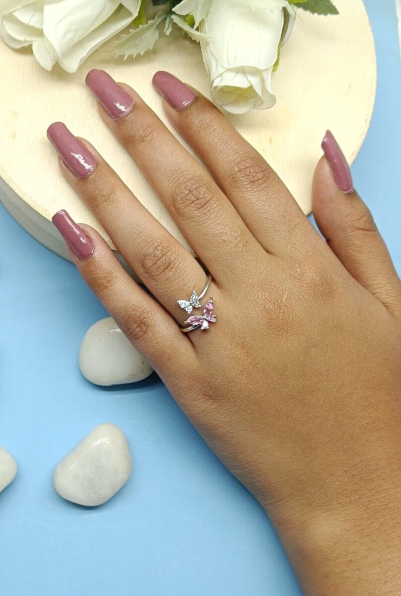 - PRODUCT DETAILS: Delicate and enchanting, this ring features a beautiful open design with two butterfly motifs gracefully perched on a sleek silver-toned band. One butterfly showcases a sleek dark silver-tone finish for a bold contrast, while the other sparkles with pink crystal stones, adding a soft, feminine touch. The smooth, polished band completes the look with subtle elegance. Nature-inspired and full of charm, this piece is perfect for anyone who loves whimsical jewelry with a hint of shimmer.