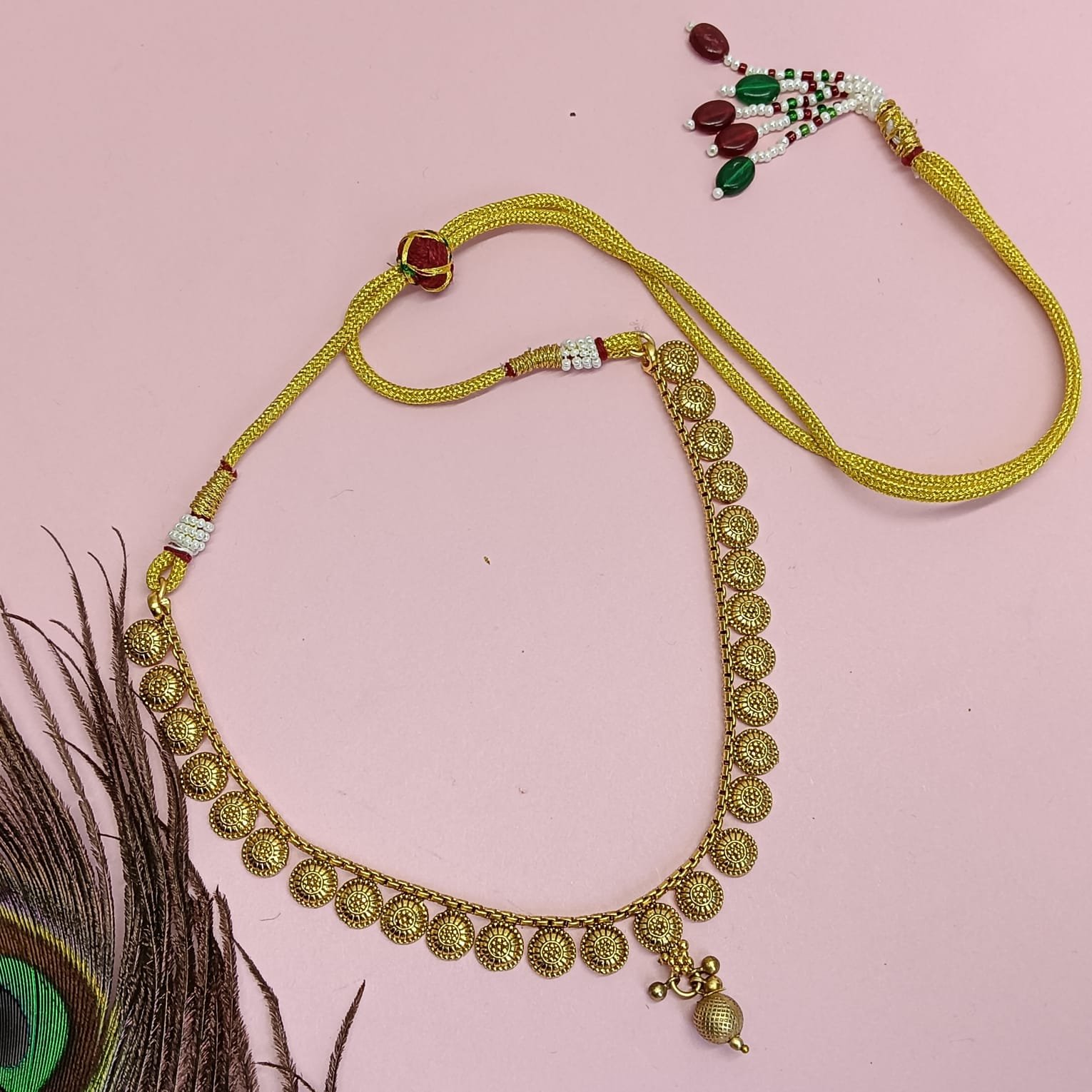 The matching earrings complement the necklace with layered textured discs and a coordinating bead drop, creating a balanced and cohesive look. Finished in an antique matte gold tone, the set offers a refined appearance that pairs effortlessly with both traditional ethnic wear and modern fusion outfits. Lightweight and comfortable, it is designed with an adjustable thread closure to ensure a secure and customizable fit, making it suitable for extended wear during weddings, festivals, and special occasions. - PACKAGING & CARE INSTRUCTIONS: To maintain the beauty and longevity of your jewelry, it’s important to handle it with care. Shield your pieces from potential damage by avoiding contact with substances like perfume, lotion, and sunscreen. Harsh chemicals can also harm delicate materials, so it’s best to steer clear of them during cleaning. Remember to remove your jewelry before engaging in activities that involve water, such as swimming or showering, and it’s also a good practice to take it off before sleeping. When cleaning is needed, gently wipe your jewelry with a soft cloth. Lastly, when your cherished pieces are not being worn, ensure they are safely stored in their designated box to protect them from scratches and the elements.