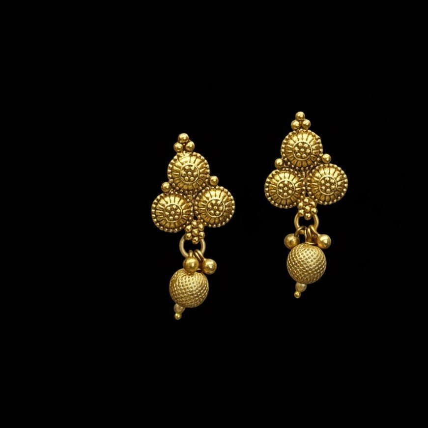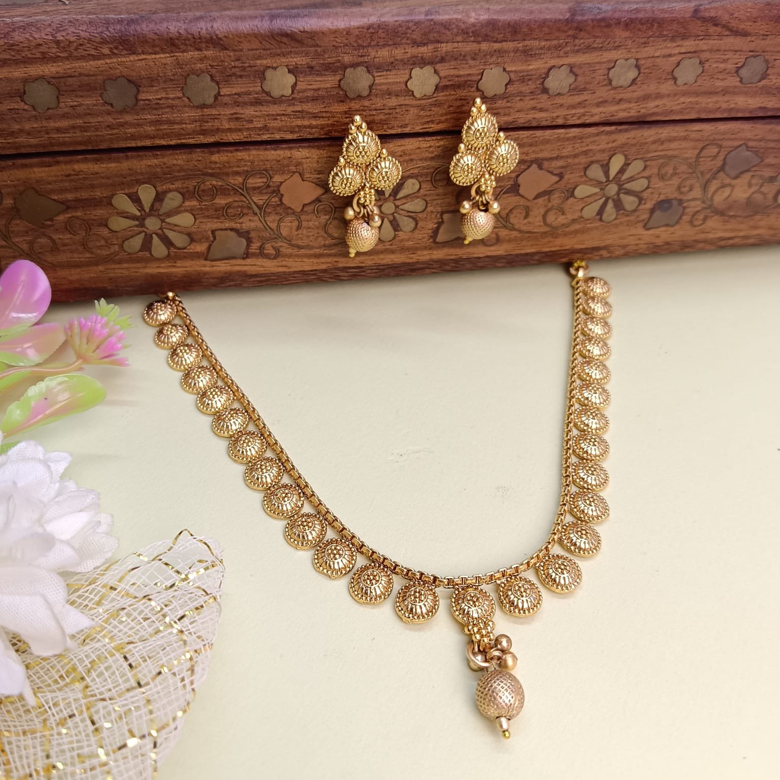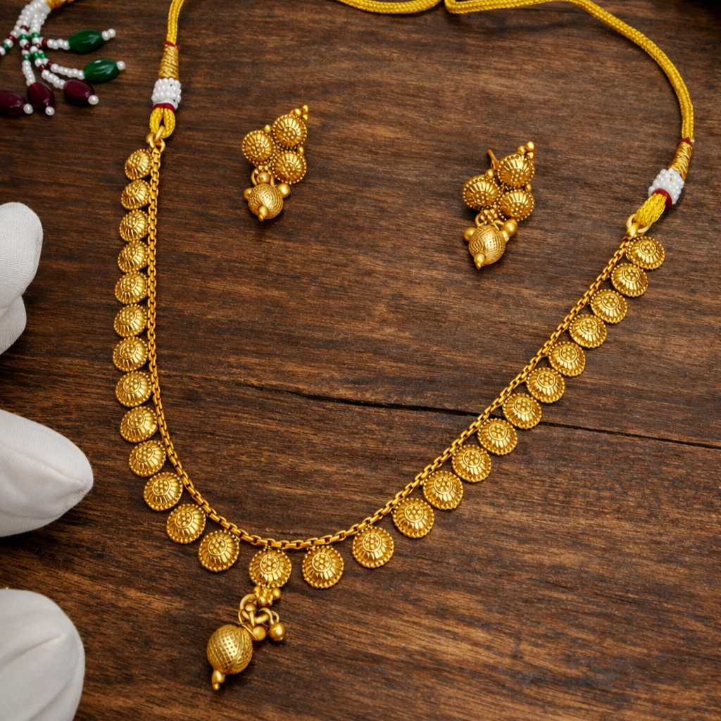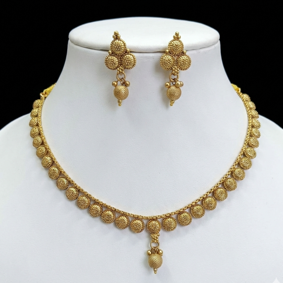 - PRODUCT DETAILS: This antique gold-tone jewelry set includes a structured necklace and matching stud-style drop earrings, crafted with a focus on geometric design and detailed metalwork. The necklace features a continuous row of uniform circular motifs, each embossed with a sunburst-inspired texture that enhances the depth and richness of the gold-tone finish without the use of stones. A single textured bead drop at the center adds a subtle focal element and traditional appeal.