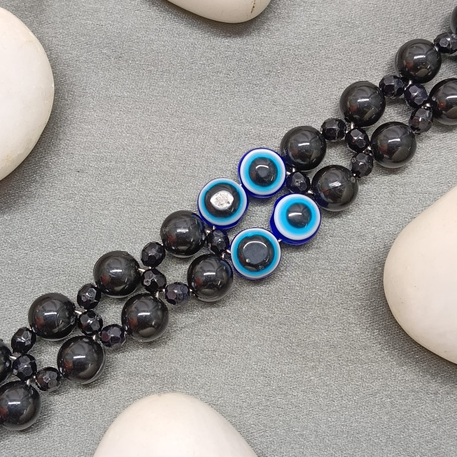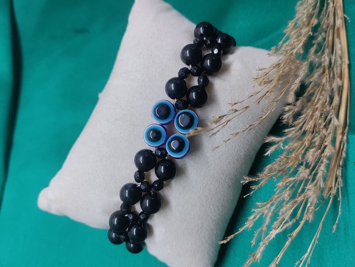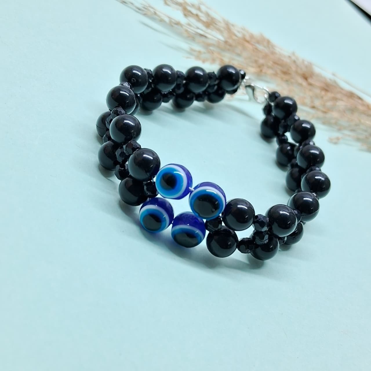 - PRODUCT DETAILS: This handcrafted bracelet beautifully blends tradition and style. Designed with glossy black beads and a central blue evil eye bead, it carries deep symbolism—believed to protect from negativity while bringing positivity and balance. The double-strand design adds texture and sophistication, making it a versatile accessory for both men and women. Finished with a secure lobster clasp, it ensures comfort and durability for everyday use. Perfect for daily styling, casual outings, or as a thoughtful gift, this bracelet is both meaningful and fashionable.
