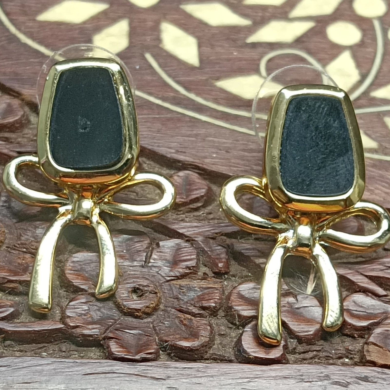 Black Stone and Gold-Toned Bow Earrings