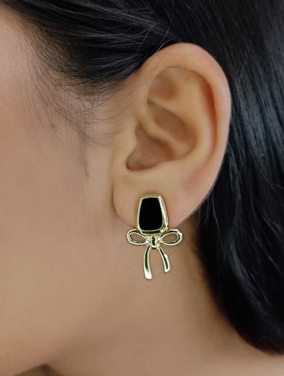 - PRODUCT DETAILS: Chic and sophisticated, these earrings showcase a striking combination of bold contrast and delicate detail. Each piece features a rectangular black stone set in a gleaming gold-toned frame, creating a refined, contemporary silhouette. Suspended just below, a dainty bow element adds a touch of softness and femininity, enhancing the overall charm. Designed with a standard post and back closure for pierced ears, these earrings offer comfort and security. Whether paired with everyday outfits or evening ensembles, their versatile style and thoughtful craftsmanship make them a standout addition to any jewelry collection.