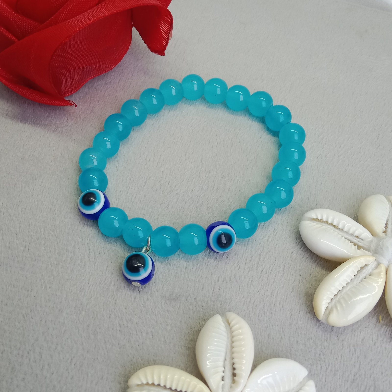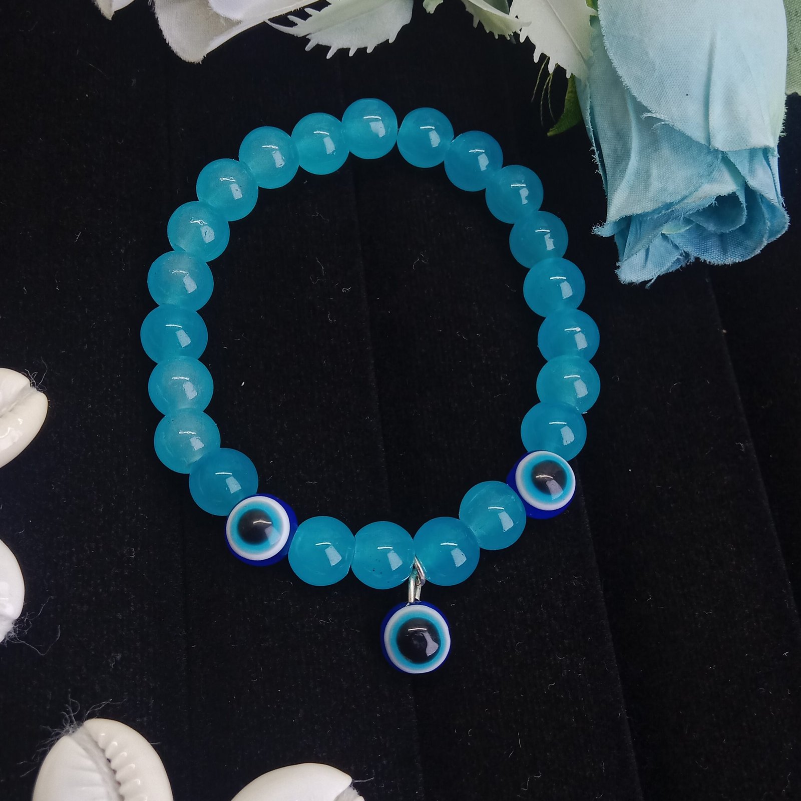 - PRODUCT DETAILS: This stylish blue beaded bracelet features a sleek arrangement of small round beads arranged with three prominent evil eye charms. Designed for both meaning and fashion, the evil eye is traditionally associated with protection and warding off negative energy. The elastic design ensures a comfortable fit for most wrist sizes, making it perfect for everyday