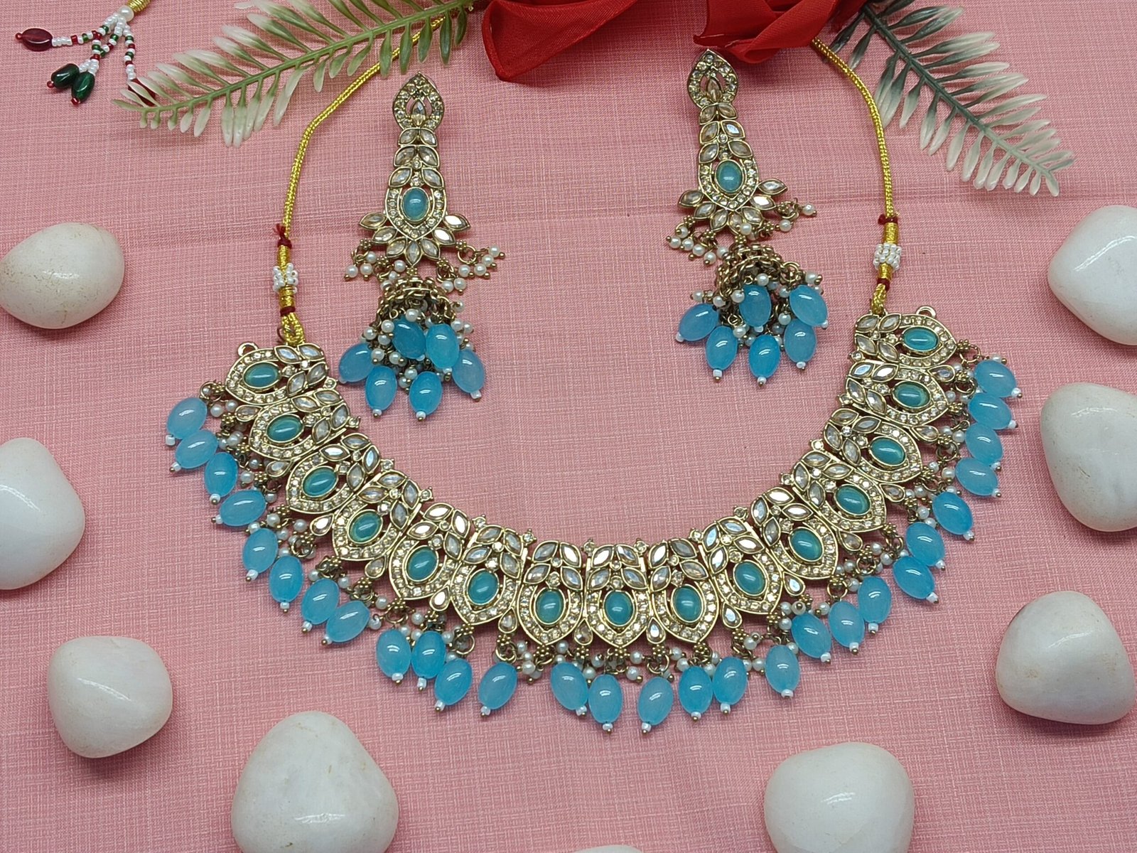 Blue Beaded Necklace and Earring Set for Women with Gold-Tone Detailing | Elegant, Adjustable Jewelry for Weddings, Parties, Gifting & Everyday Glamour