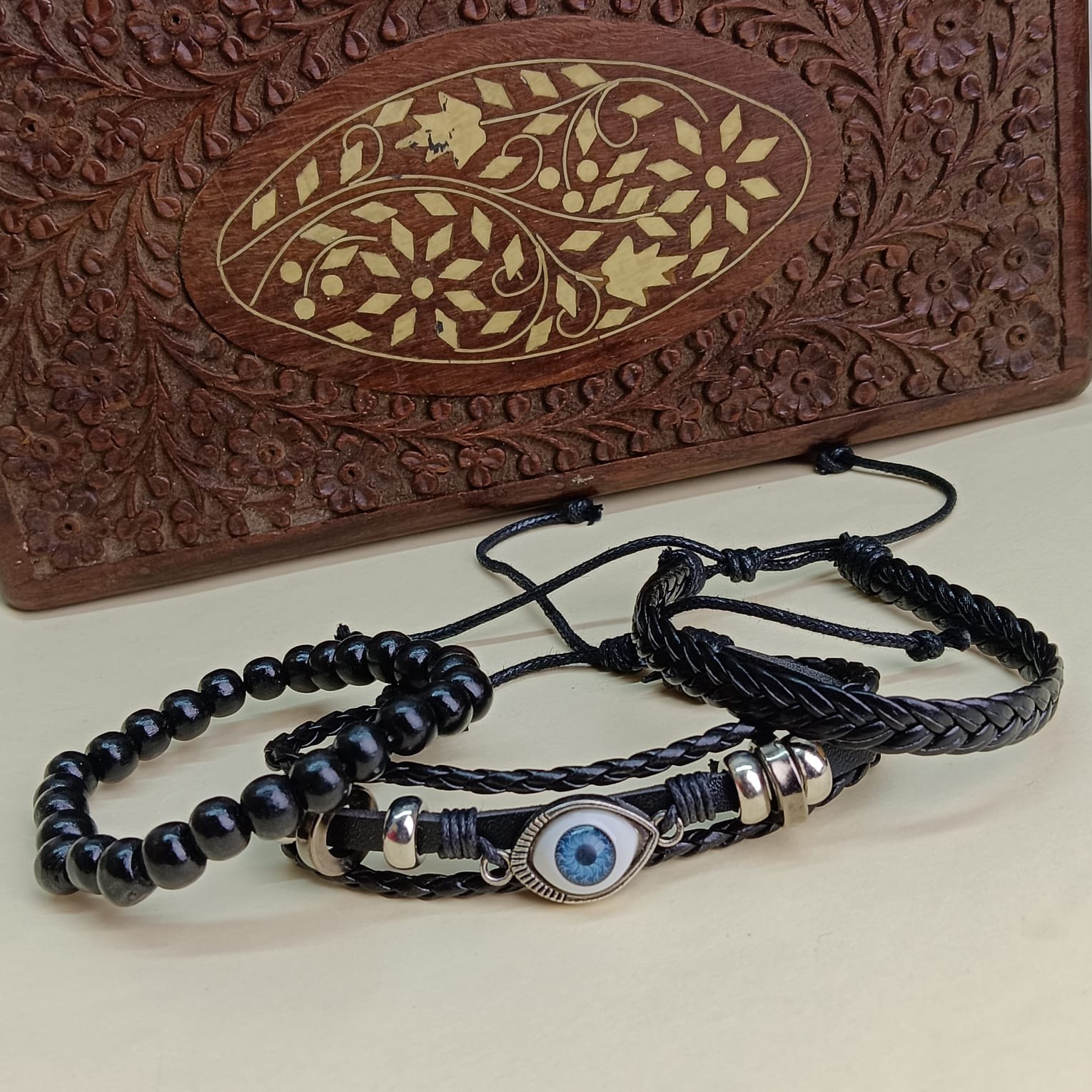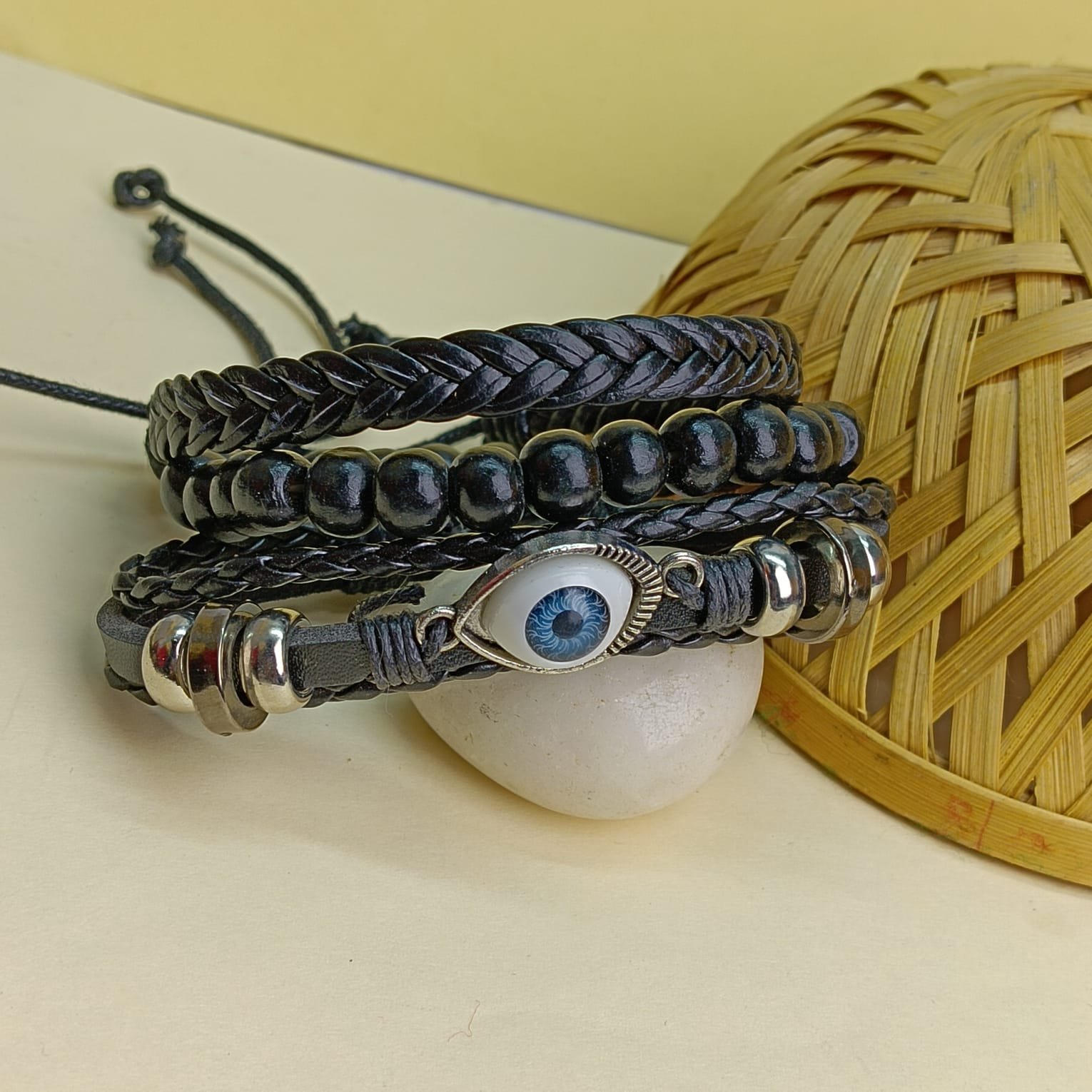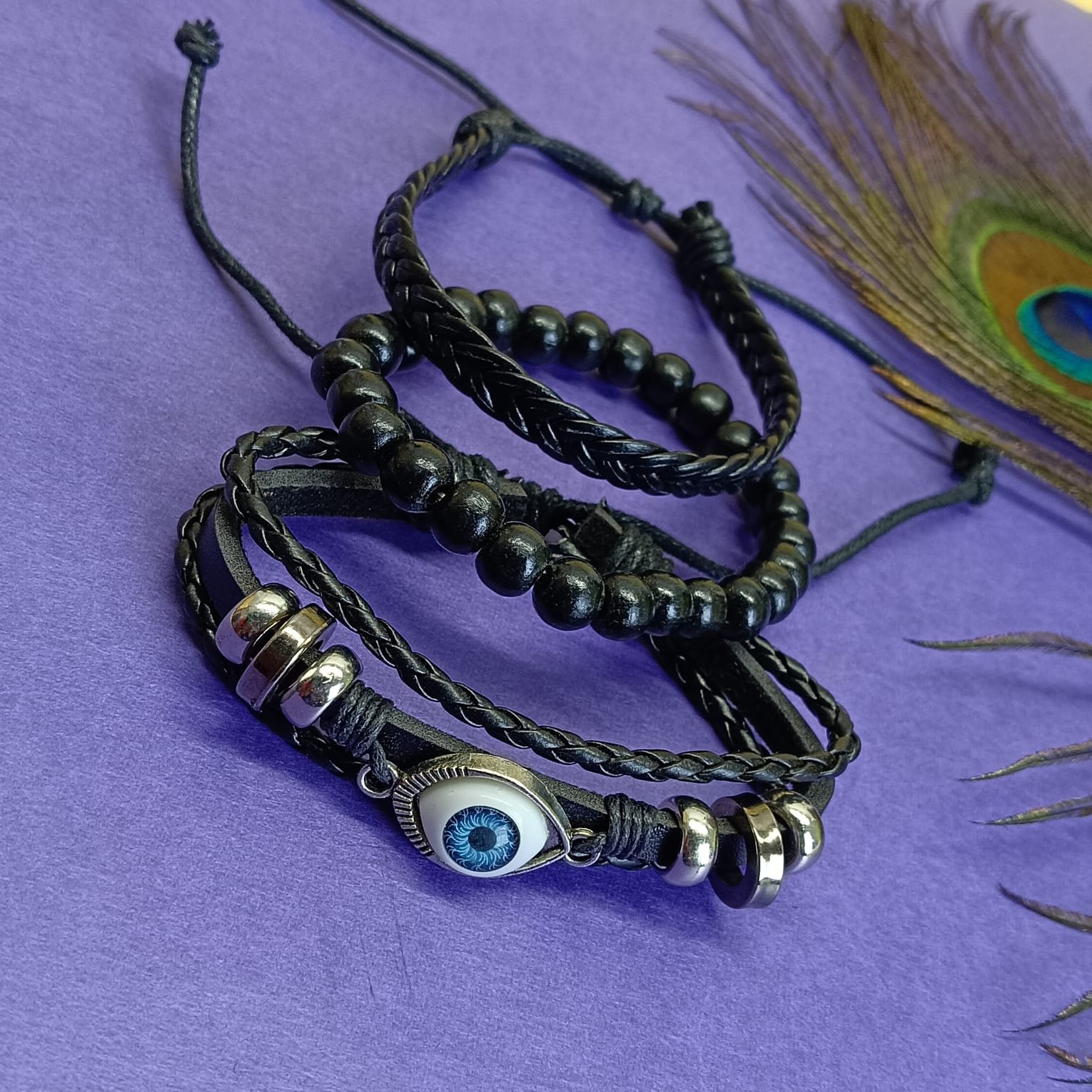 - PRODUCT DETAILS: Add a laid-back yet meaningful touch to your everyday style with this NIPSTec Men’s Stackable Bracelet Set. Designed for effortless layering, this 3-piece set blends rugged textures with symbolic detailing, making it a versatile accessory for daily wear. Each bracelet features a unique combination of black leather cords, smooth beads, and silver-tone metal accents. One bracelet is highlighted with a classic evil eye charm, traditionally believed to symbolize protection and positive energy. Worn together or individually, these bracelets complement casual outfits and relaxed, bohemian looks.