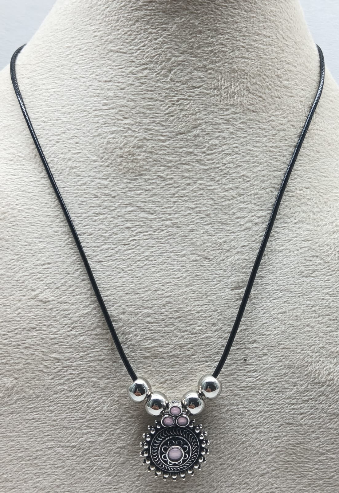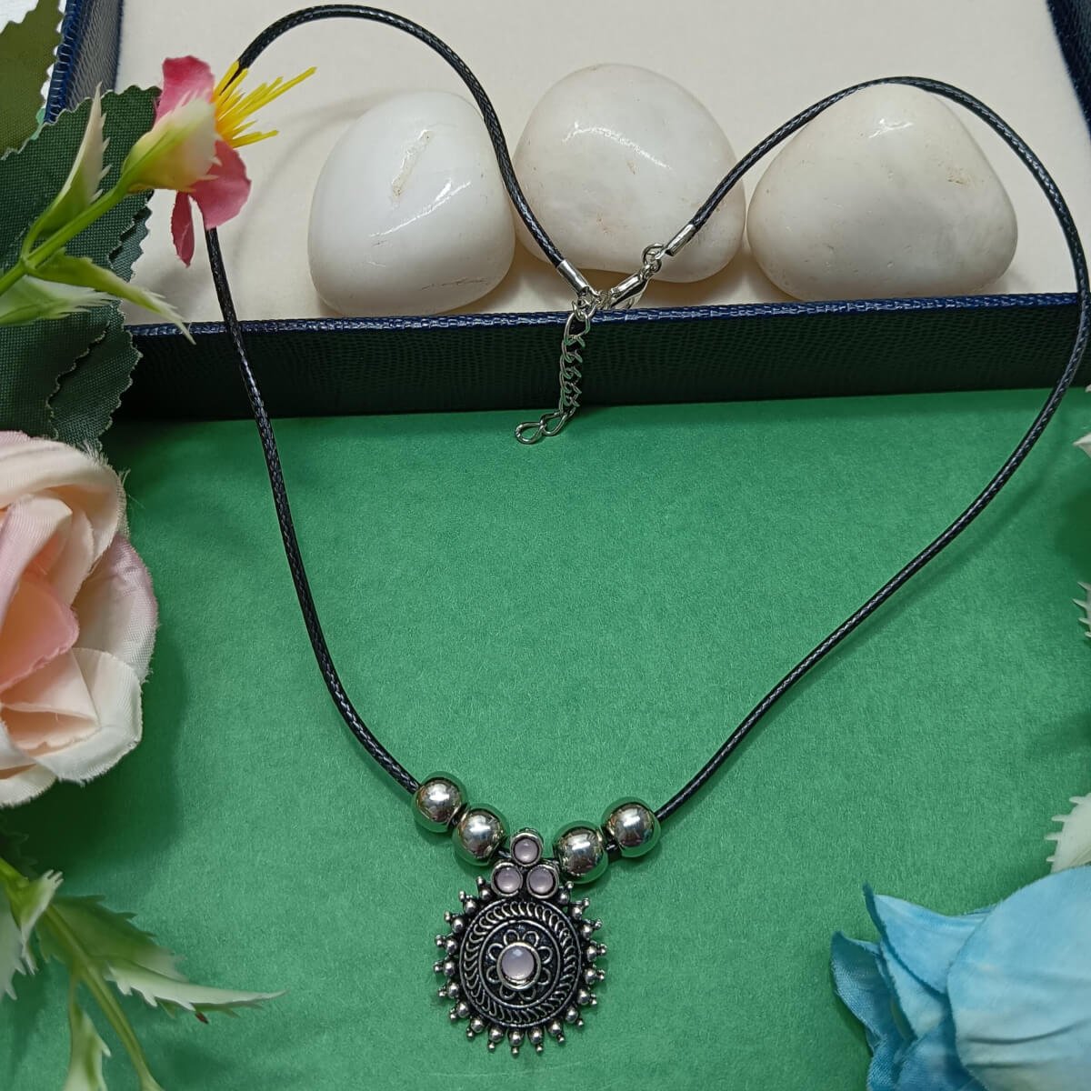 - PRODUCT DETAILS: This pendant necklace features a striking circular centerpiece inspired by sun motifs, crafted from textured silver-tone metal. At its heart lies a delicate pink stone, beautifully surrounded by radiating petal-like patterns that add depth and charm. Above the pendant, two small silver-tone beads frame a cluster of finer beads, lending an elegant touch. Suspended from a simple black cord with an adjustable silver-tone chain and clasp, this necklace effortlessly blends bohemian and ethnic influences. Its versatile design makes it an eye-catching accessory for both casual and dressy styles.