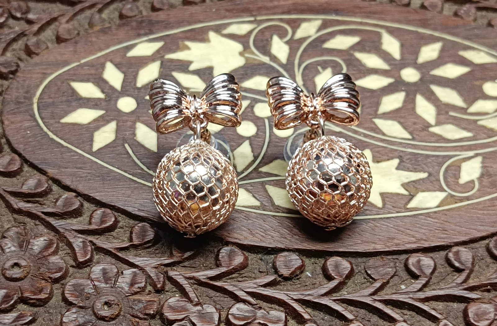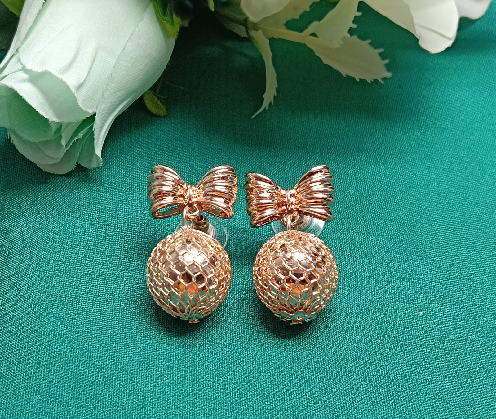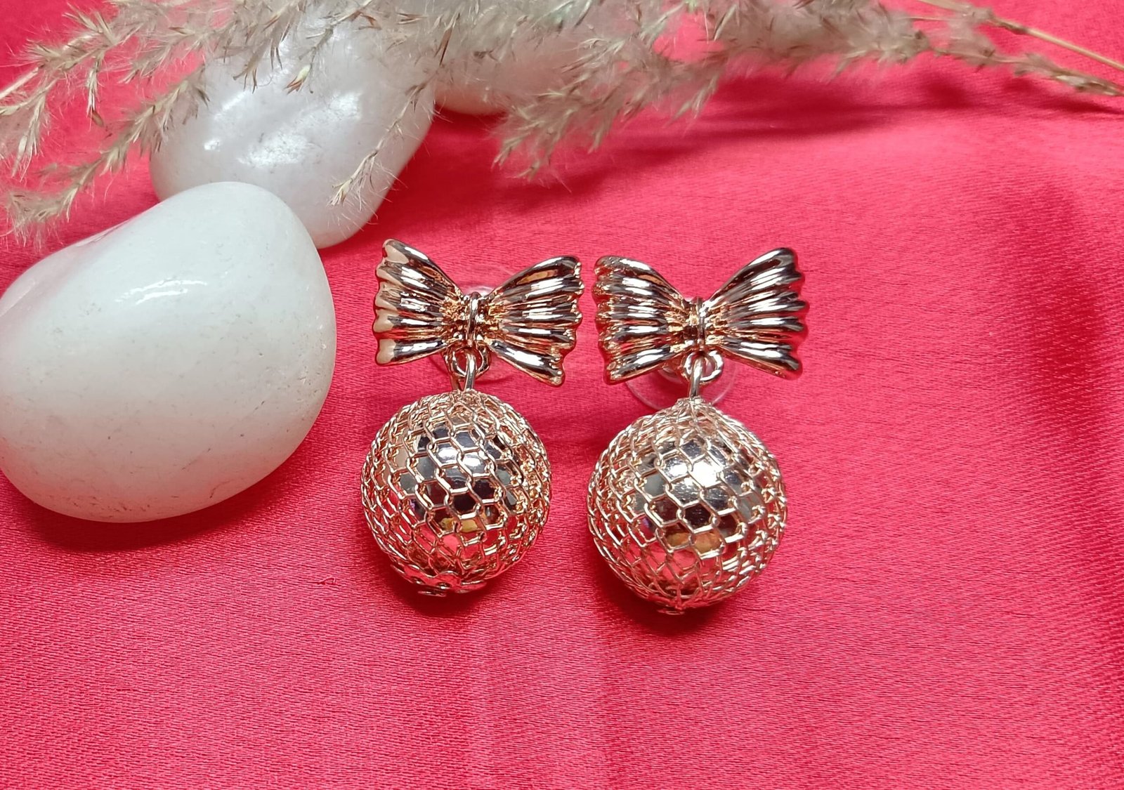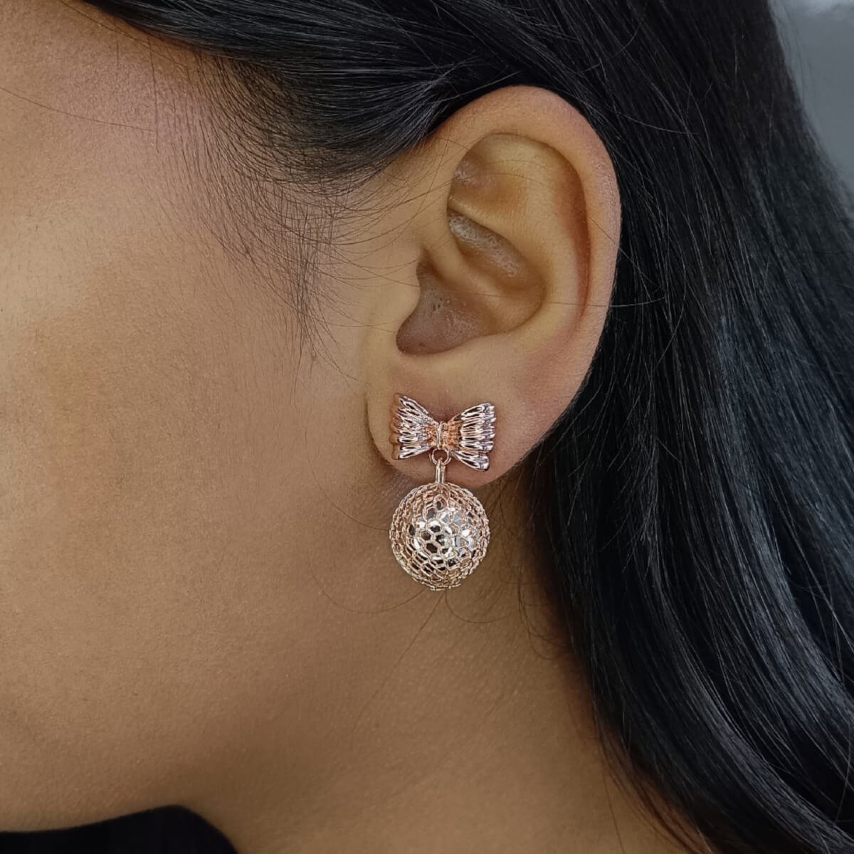 - PRODUCT DETAILS: Charming and sophisticated, these earrings effortlessly blend delicate detail with a playful twist. At the top, an intricately textured bow element adds a feminine touch, crafted with precision to create a sense of movement and depth. Suspended beneath is a spherical charm made from a mesh-like material, allowing light to dance through its open structure and create a subtle shimmer. The metallic finish enhances the earrings’ overall elegance while maintaining a light, airy feel. Perfectly balanced between whimsical and refined, these earrings are versatile enough to elevate everyday looks or complement evening attire with a hint of sparkle.