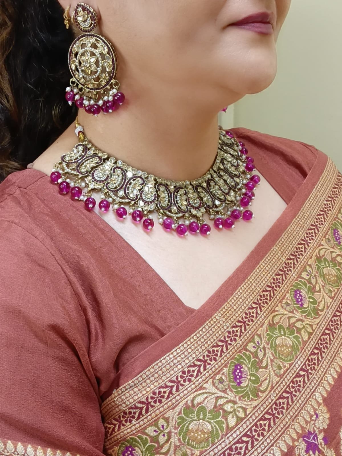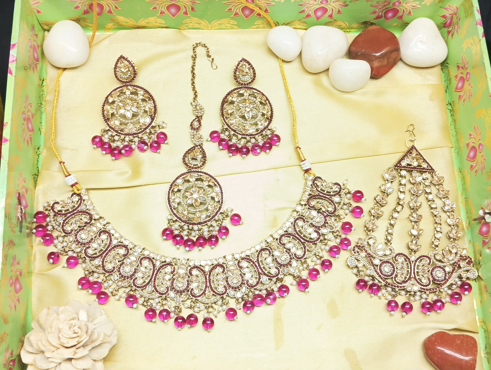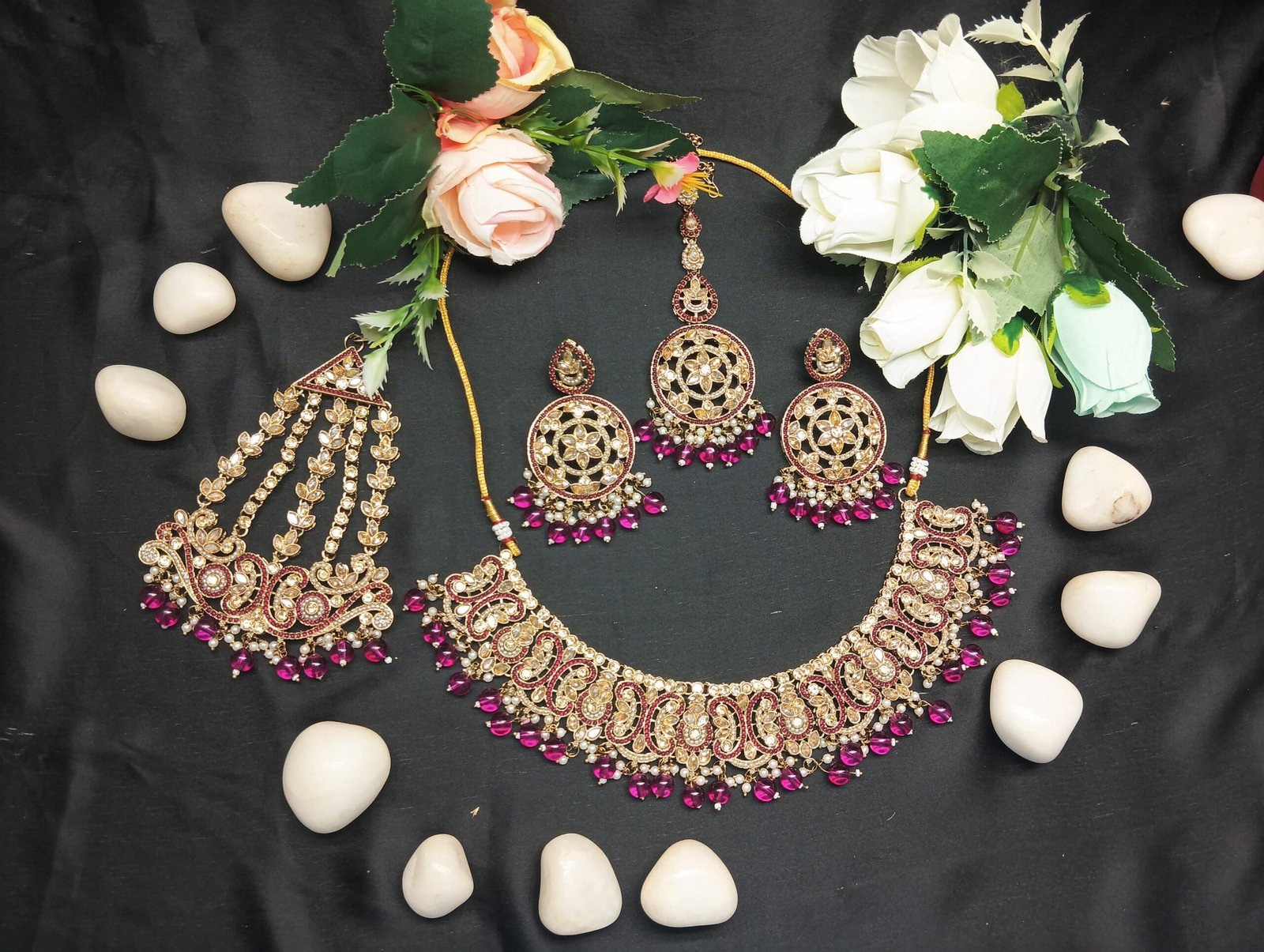 - PRODUCT DETAILS: NIPSTec presents a regal and timeless jewelry set designed for the modern woman who cherishes tradition with a bold, confident flair. This exquisite 4-piece set includes a gold-toned necklace, matching maang tikka, ornate jhumar (pasha), and coordinating earrings—each adorned with sparkling rose pink stones and pearl-like beads. The intricate detailing and elegant craftsmanship make it a perfect choice for weddings, bridal wear, festivals, or any special celebration. Whether you’re the bride or a guest, this set adds a royal touch to your ensemble, combining classic beauty with contemporary charm.