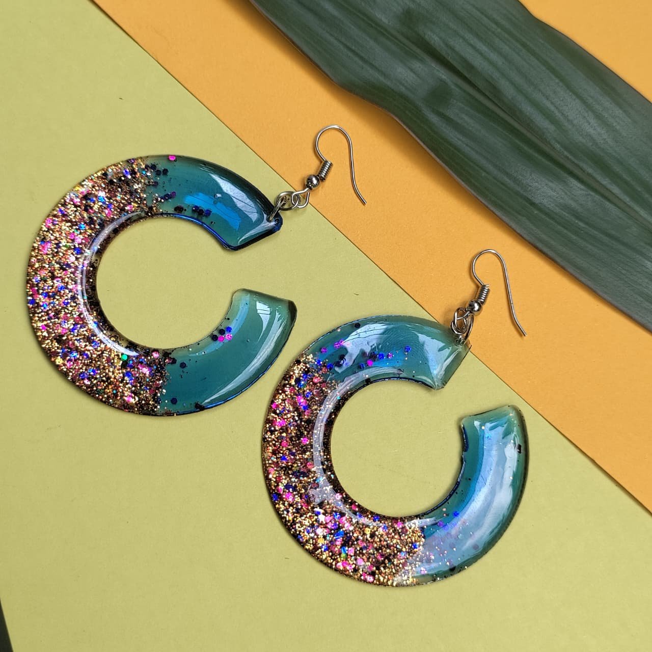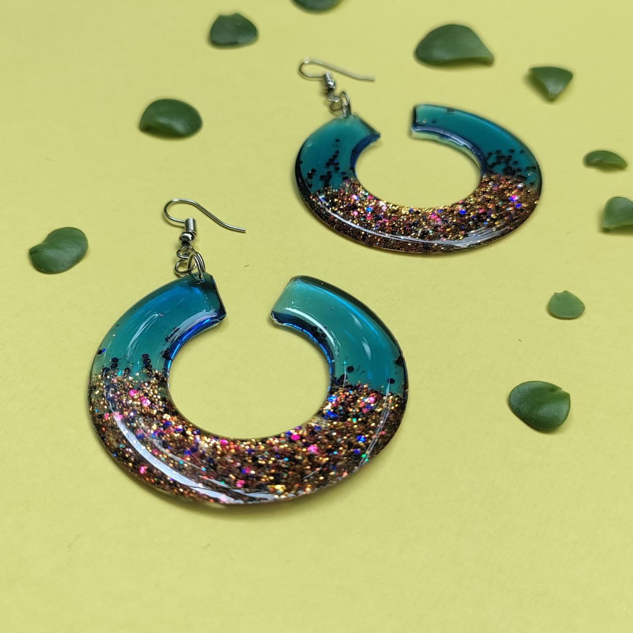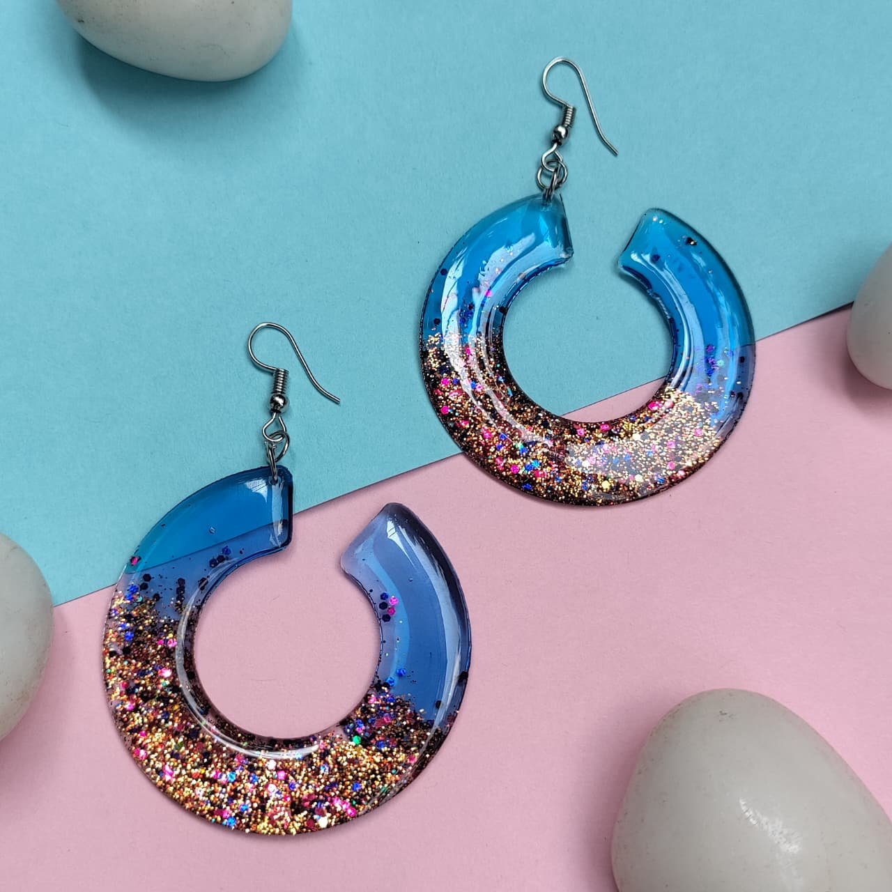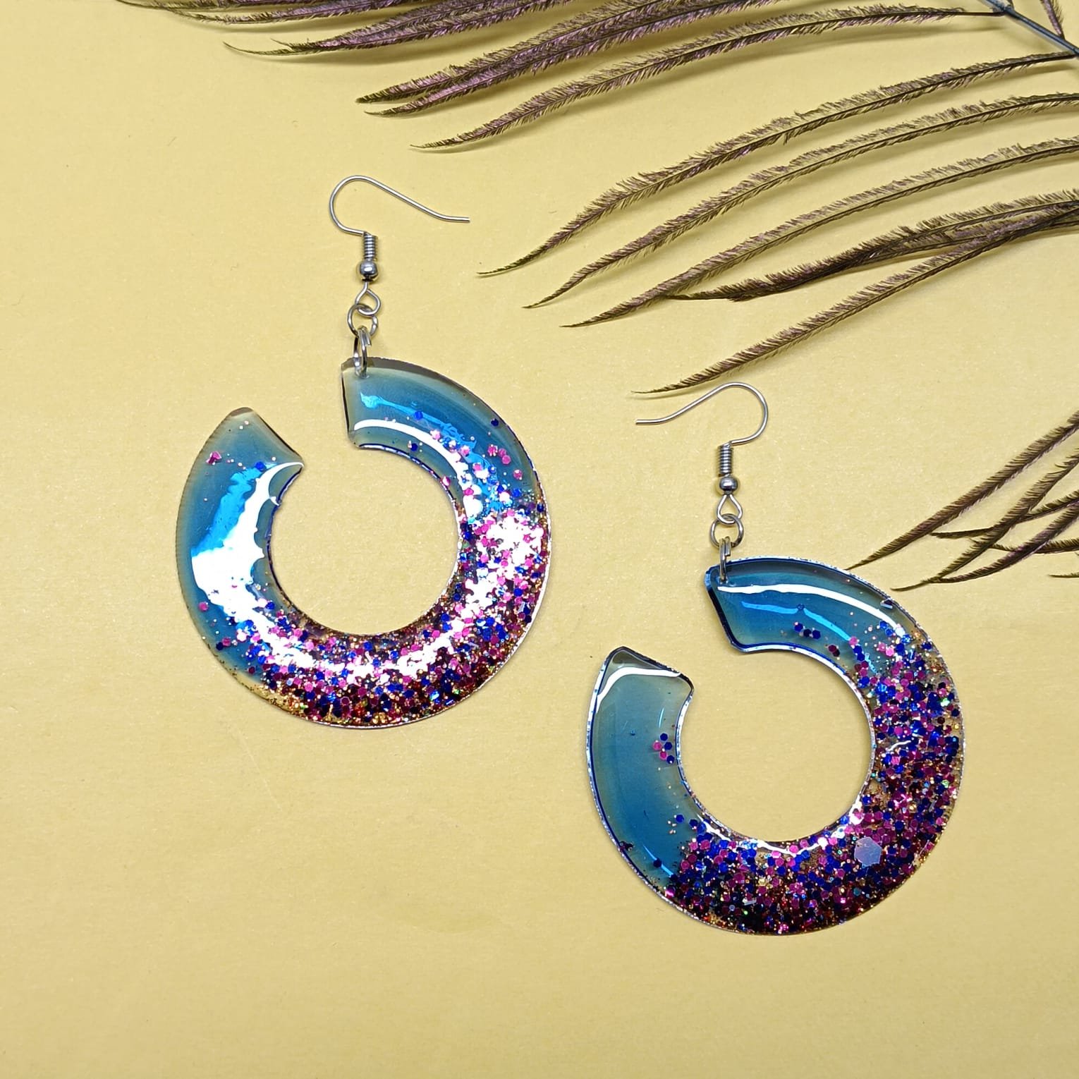 - PRODUCT DETAILS: Add a pop of color and sparkle to your look with these handmade resin earrings for women. Featuring a translucent blue base with a gradient of pink, purple, and gold glitter, these open-circle statement earrings are designed to catch the light and turn heads. Perfect for parties, festivals, casual outings, or special occasions, they bring a stylish and playful touch to any outfit. Crafted from premium resin with stainless steel fishhook backings, these earrings are lightweight, durable, and safe for sensitive ears, ensuring all-day comfort. Each pair is handmade, giving every earring a unique and individual charm. They also make a thoughtful gift for friends, family, or fashion enthusiasts.