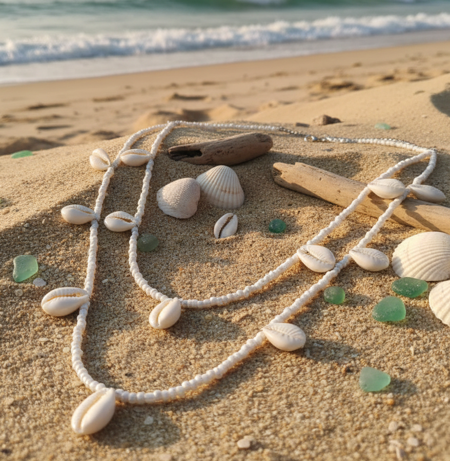 - PRODUCT DETAILS: Bring a touch of the ocean’s charm to your style with this beautifully layered cowrie shell and bead necklace. Handcrafted with authentic, polished cowrie shells and delicate white beads, each strand is thoughtfully arranged to create a stunning layered silhouette. The natural cream tones of the shells blend harmoniously with the soft white beads, giving this piece an organic, breezy elegance. Inspired by coastal and bohemian fashion, this necklace captures the carefree beauty of the beach while carrying deeper meaning. Across many cultures, cowrie shells are treasured as symbols of protection, prosperity, and good fortune, making this accessory as meaningful as it is stylish. Lightweight and versatile, it’s perfect for casual days, beach vacations, summer festivals, or simply adding a nature-inspired touch to your everyday look. Wear it solo for an effortless statement or layer it with other necklaces for a personalized, trend-forward style.