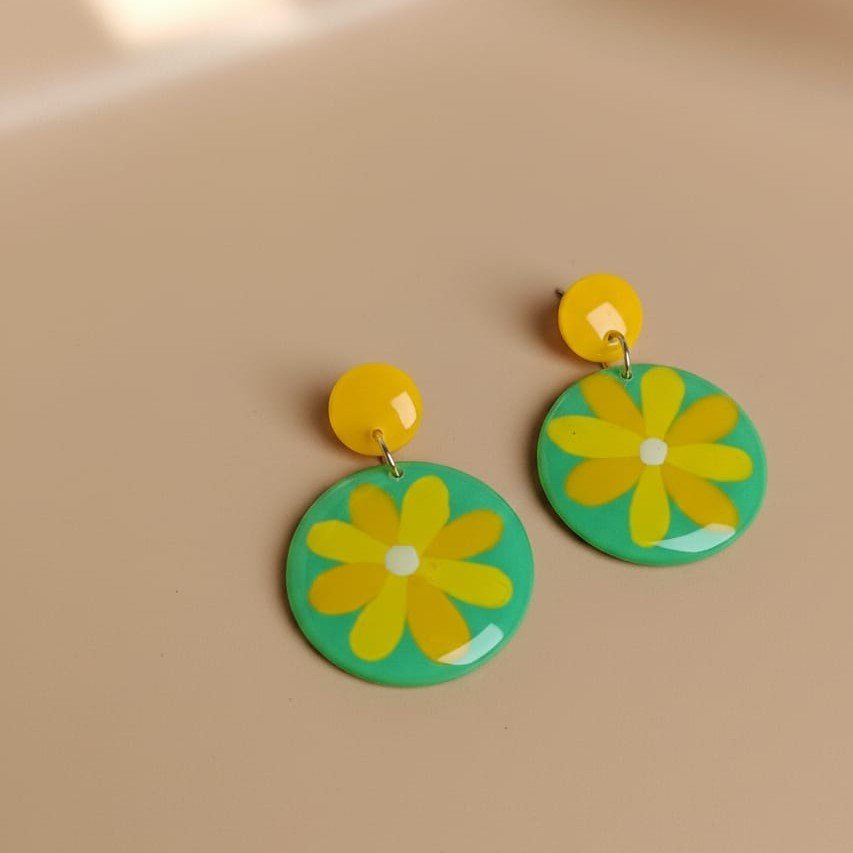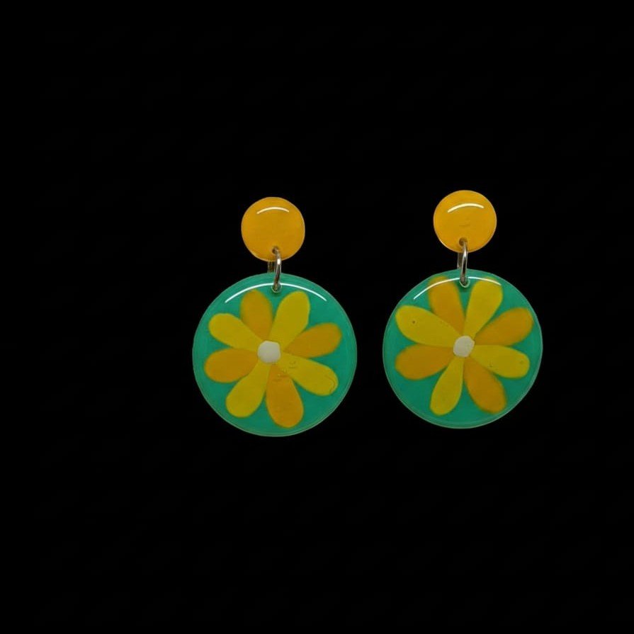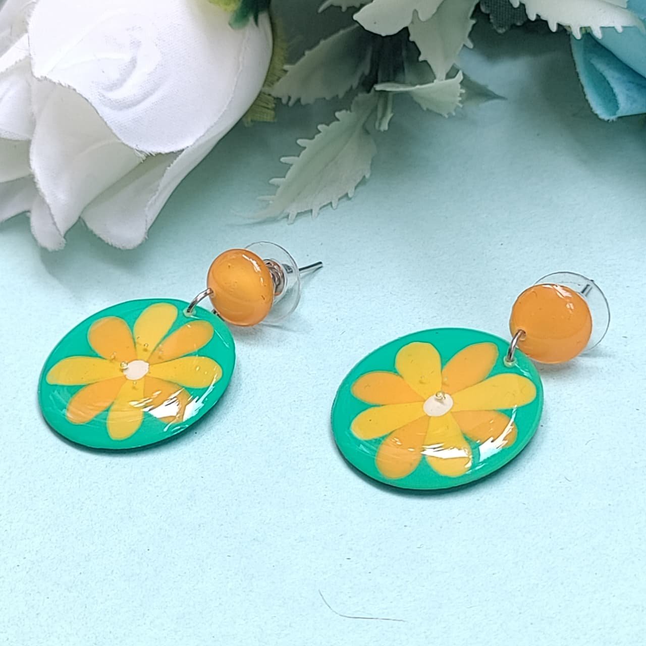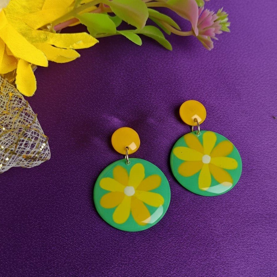 - PRODUCT DETAILS: These Resin dangle earrings featuring a yellow flower design set against a teal background. The earrings are paired with a yellow stud that complements the floral pattern. Lightweight and comfortable, they are suitable for everyday wear, casual outings, or adding a touch of color to chic ensembles.
