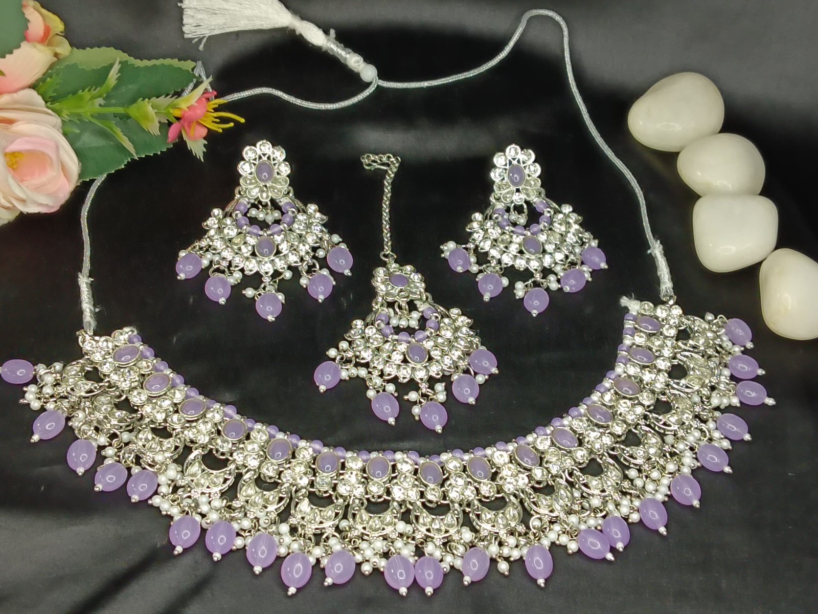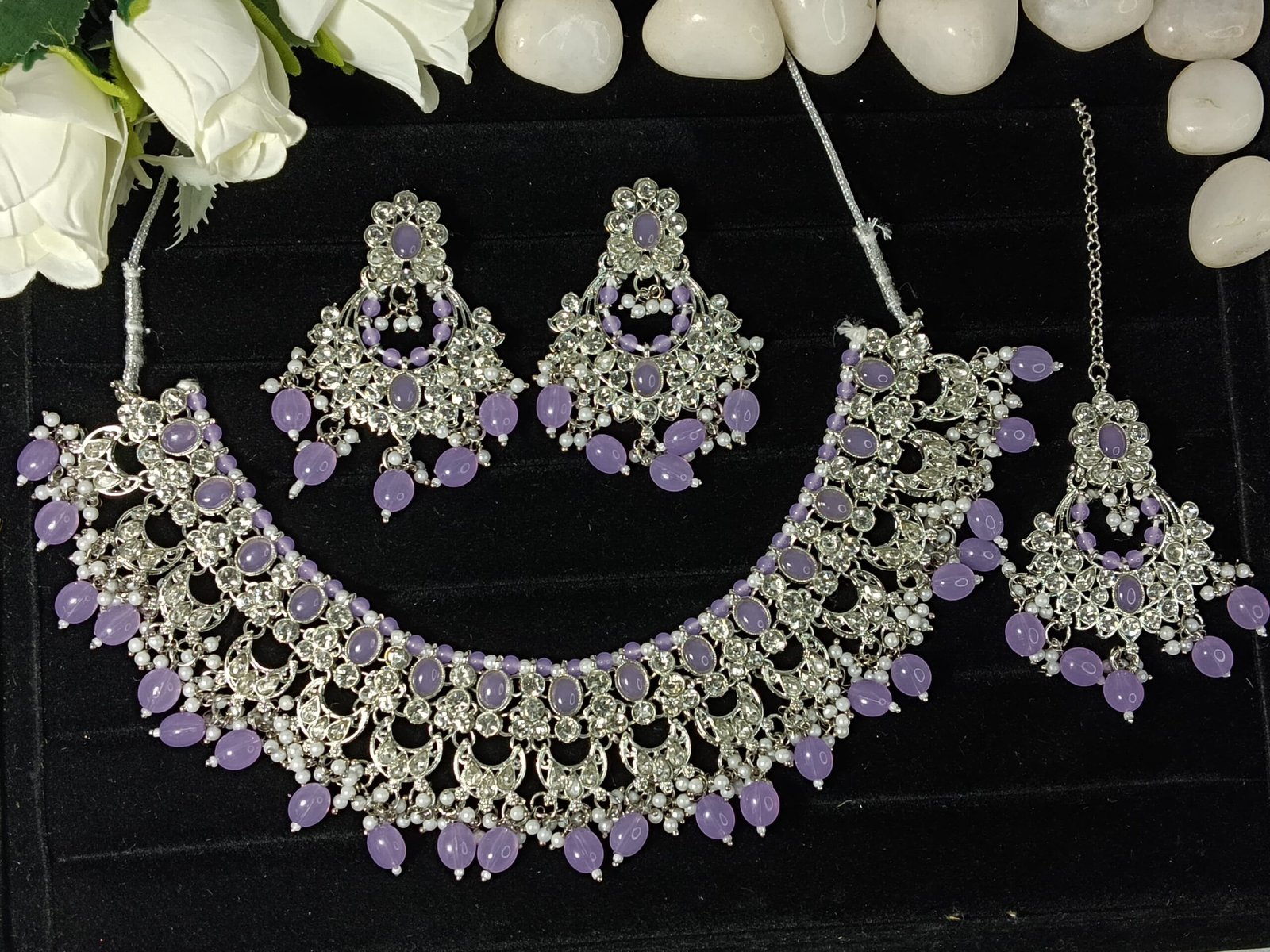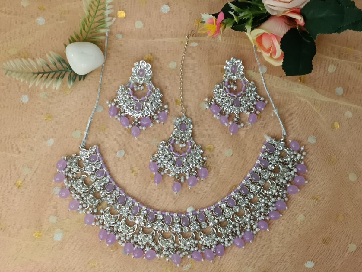 Dazzling Silver-Tone Necklace Set for Women | Necklace with Earrings & Maang Tikka | Crystal Stone & Bead Jewelry Set for Wedding, Party & Festive Wear