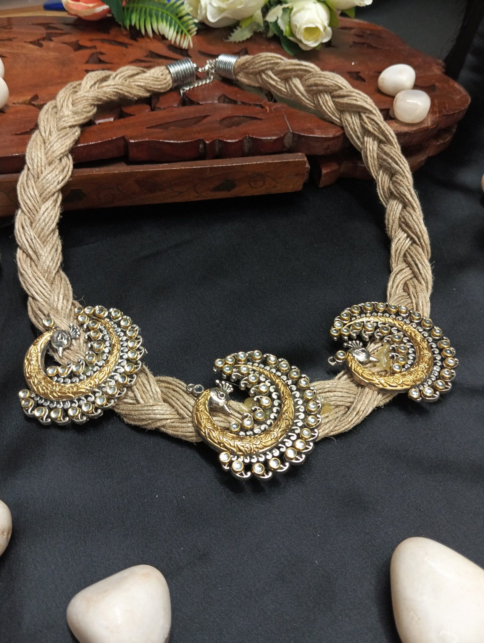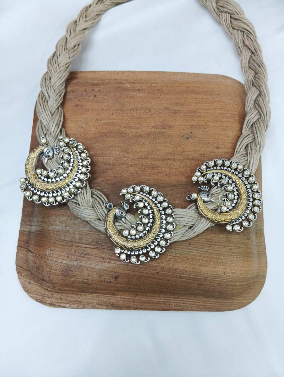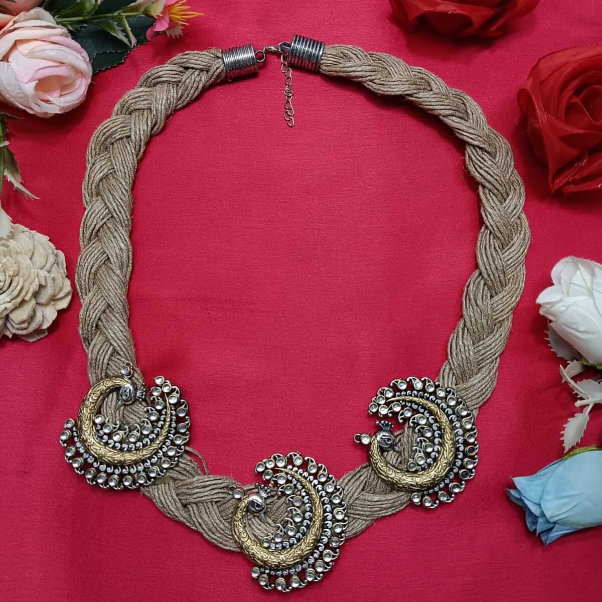 - PRODUCT DETAILS: The NIPSTec Dual-Tone Peacock Pendant Necklace is a perfect blend of tradition and artistry. The intricately designed pendant, adorned with elegant peacock accents, showcases a stunning mix of gold and silver tones, adding a regal and timeless charm. The delicate detailing highlights the beauty of this statement piece, making it a must-have for jewelry lovers. What makes it unique? The jute necklace—a rare fusion of rustic elegance and contemporary flair. Lightweight, comfortable, and effortlessly stylish, this piece is ideal for weddings, festive occasions, college fashion, and casual parties. Whether paired with Indian or Western outfits, it adds sophistication and grace to any look.