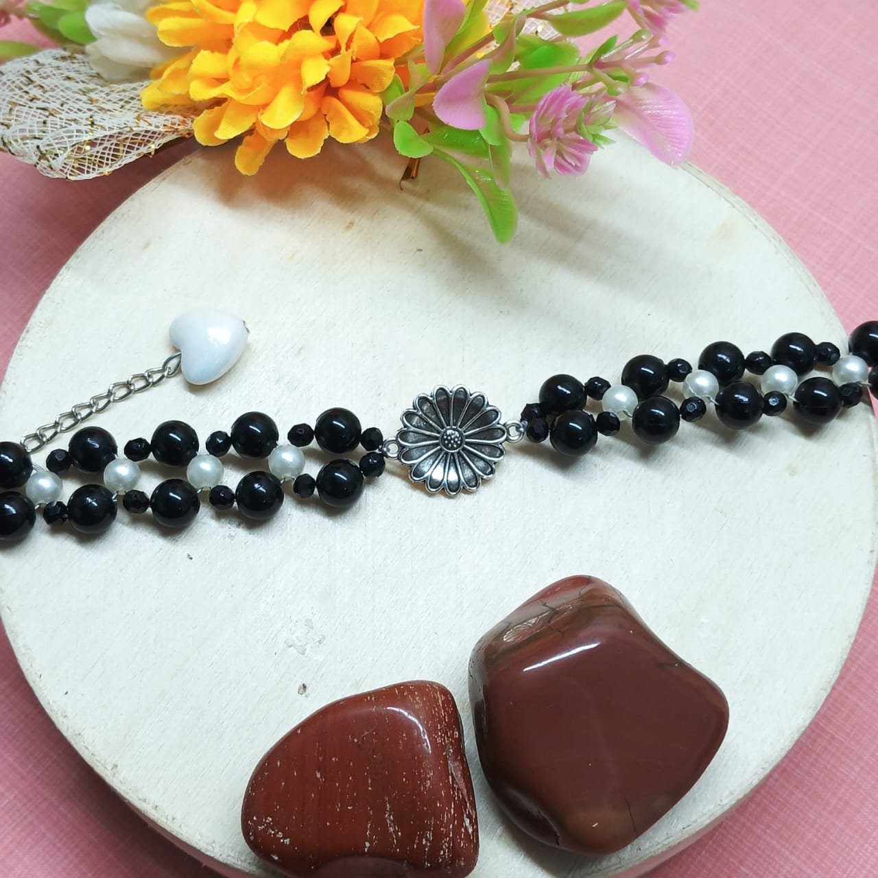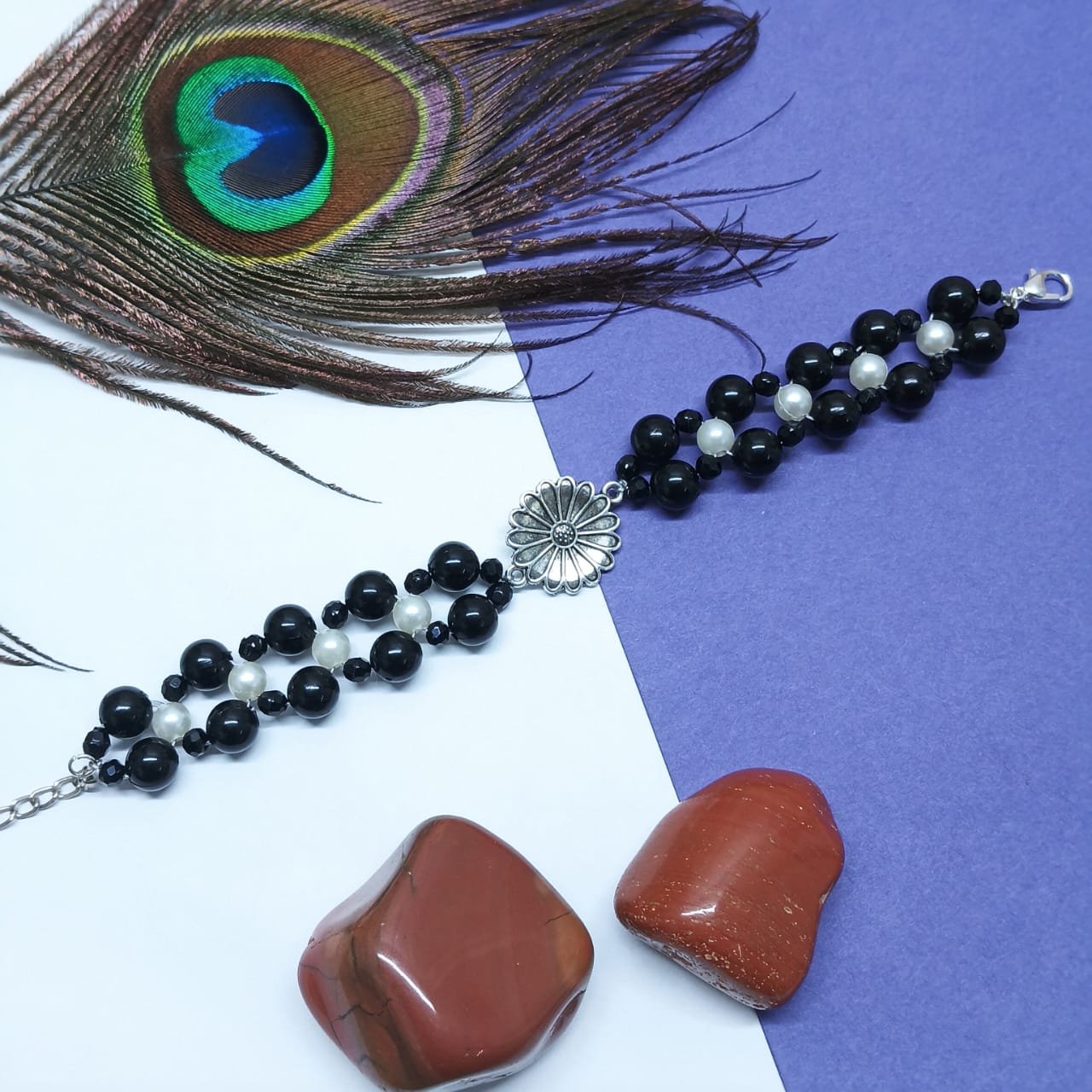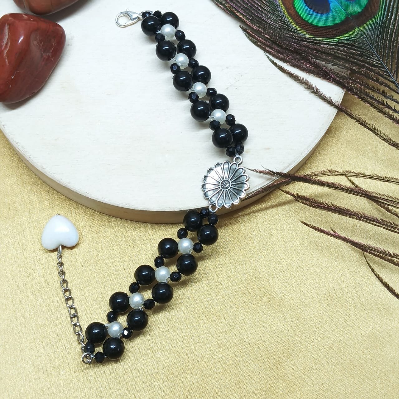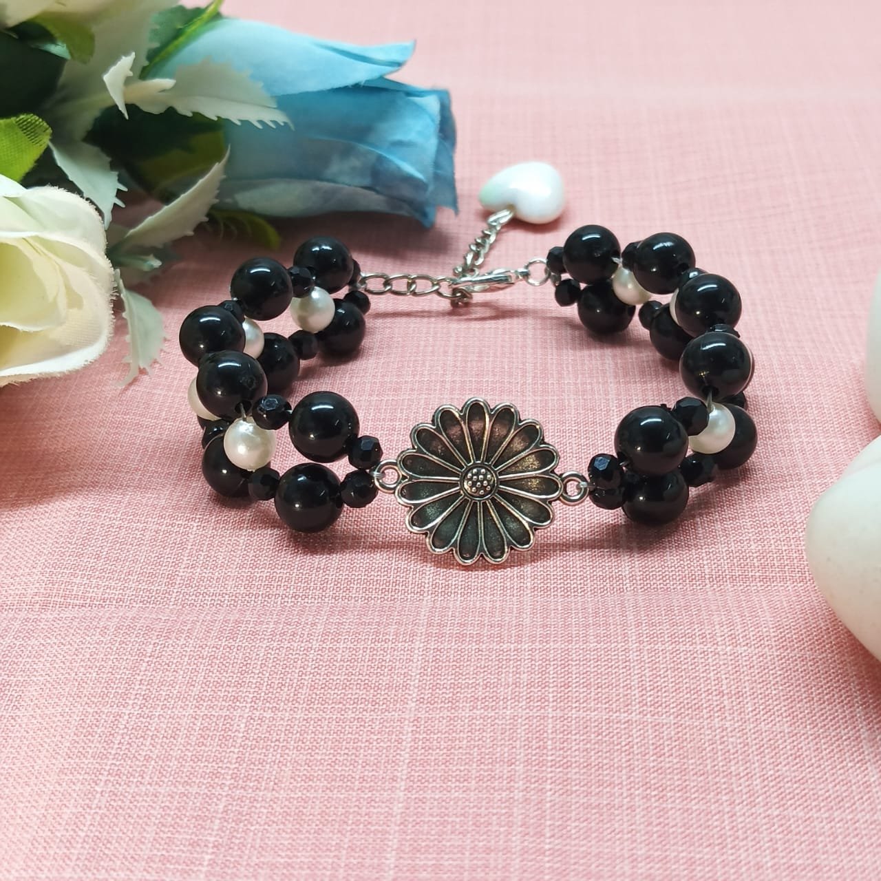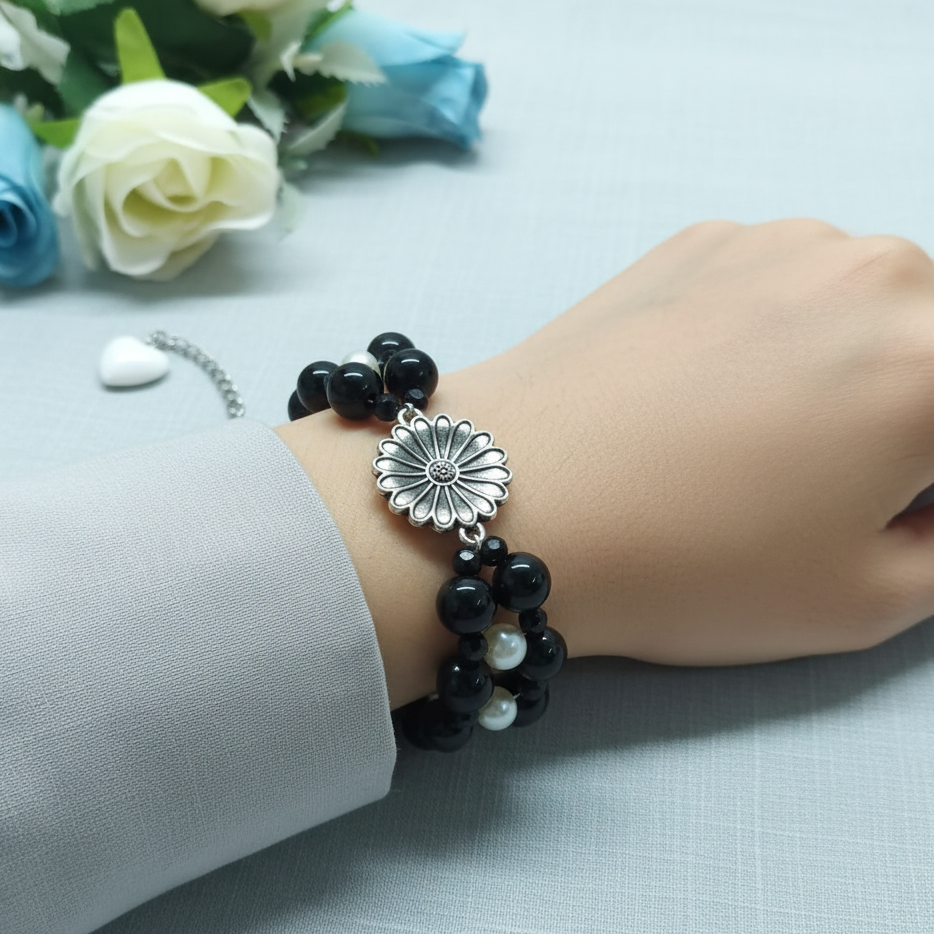 - PRODUCT DETAILS: Elegant multi-strand beaded bracelet featuring a silver-toned floral charm centerpiece, showcasing meticulous petal and center detailing. The double-strand design is composed of glossy black beads—symbolizing strength—accented with small white pearl-style beads for striking contrast. A polished silver-toned clasp and adjustable extender chain offer secure and comfortable use . The versatile piece blends classic textures with a modern layout, making it suitable for everyday styling and special occasions.