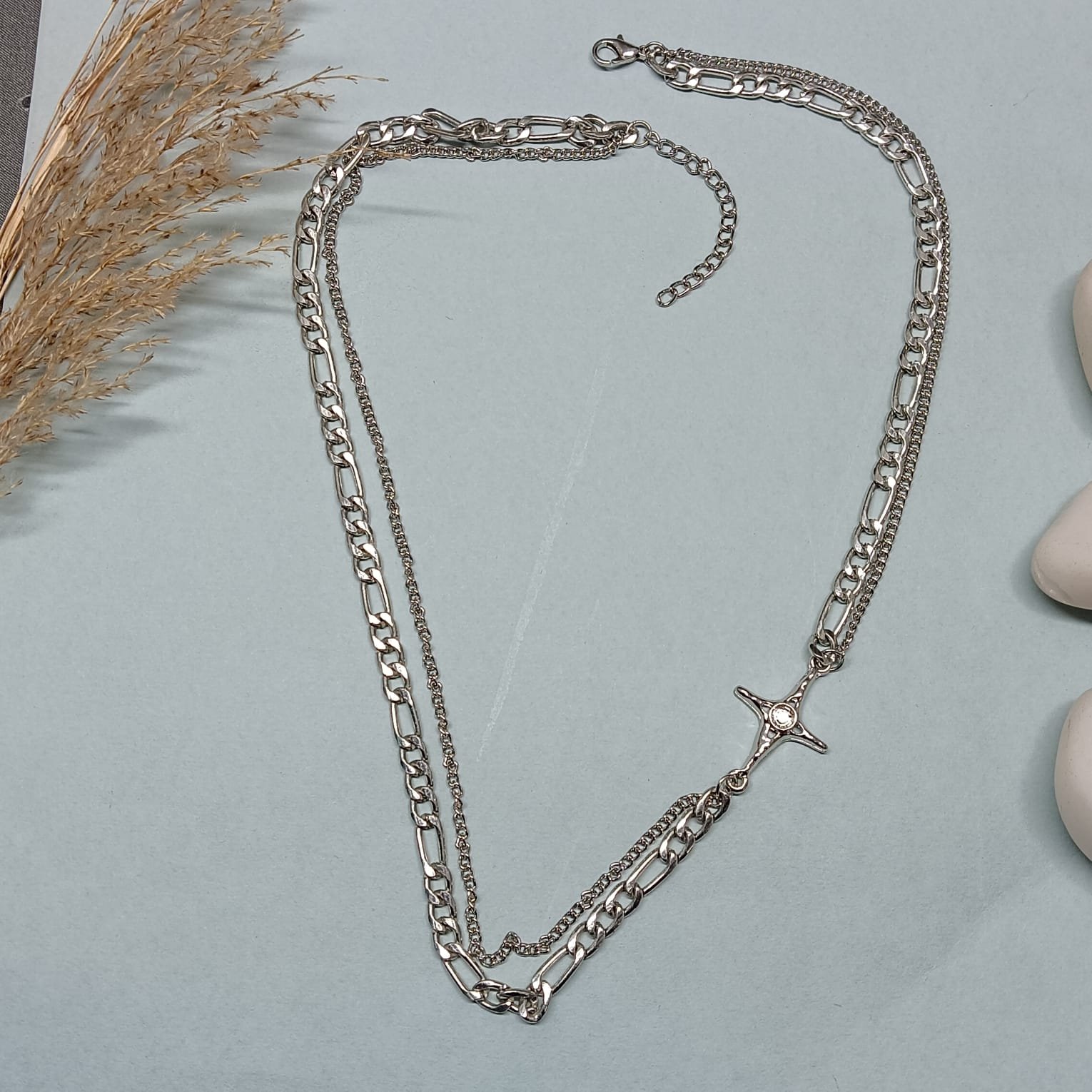 Dual-Layer Silver-Tone Chain with Contemporary Cross Pendant| Trendy Streetwear Jewelry for Everyday & Party Wear