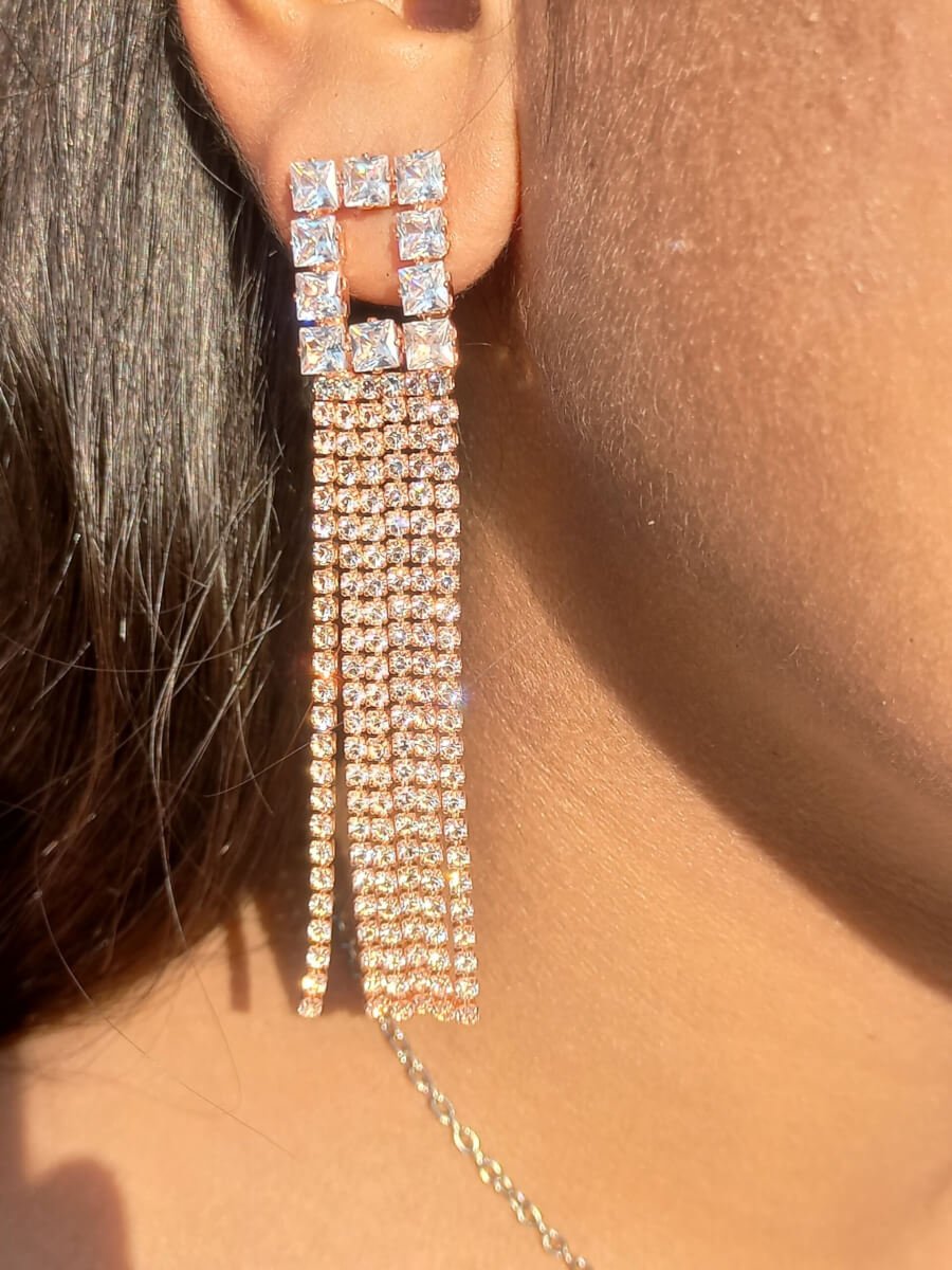 - PRODUCT DETAILS: Elevate your style with these NIPSTec tassel earrings for women, designed to make a bold statement with refined elegance. Featuring a square-shaped stud encrusted with sparkling imitation rhinestones, these long dangle earrings flow into sleek, tassels that sway with every move—catching the light and turning heads wherever you go. Perfect for those who love statement earrings with a modern twist, this pair combines durability, comfort, and standout design. The high-shine over a sturdy alloy base ensures lasting wear, while the secure post-back closure keeps them comfortably in place all day or night. Whether you’re dressing up for a cocktail party, date night, or styling your Western wear outfit, these earrings deliver glamour without the weight.Pair them with gowns, jumpsuits, or blazer dresses to complete your fashion-forward look.