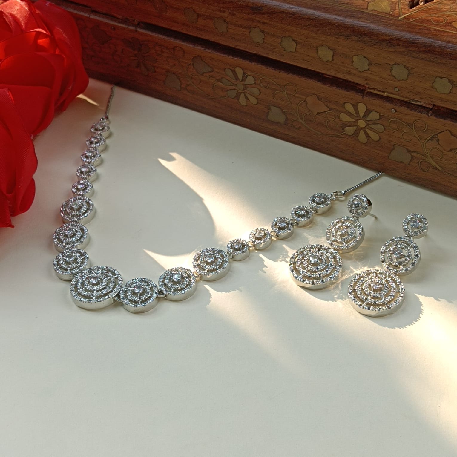 - PRODUCT DETAILS: Radiate sophistication with this breathtaking CZ necklace set, designed to capture timeless beauty and modern allure. Each circular motif is meticulously encrusted with high-quality cubic zirconia stones, arranged in concentric spirals that shimmer with every movement. The matching earrings complete the ensemble, creating a cohesive, refined look perfect for weddings, parties, and evening events.