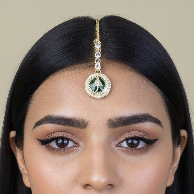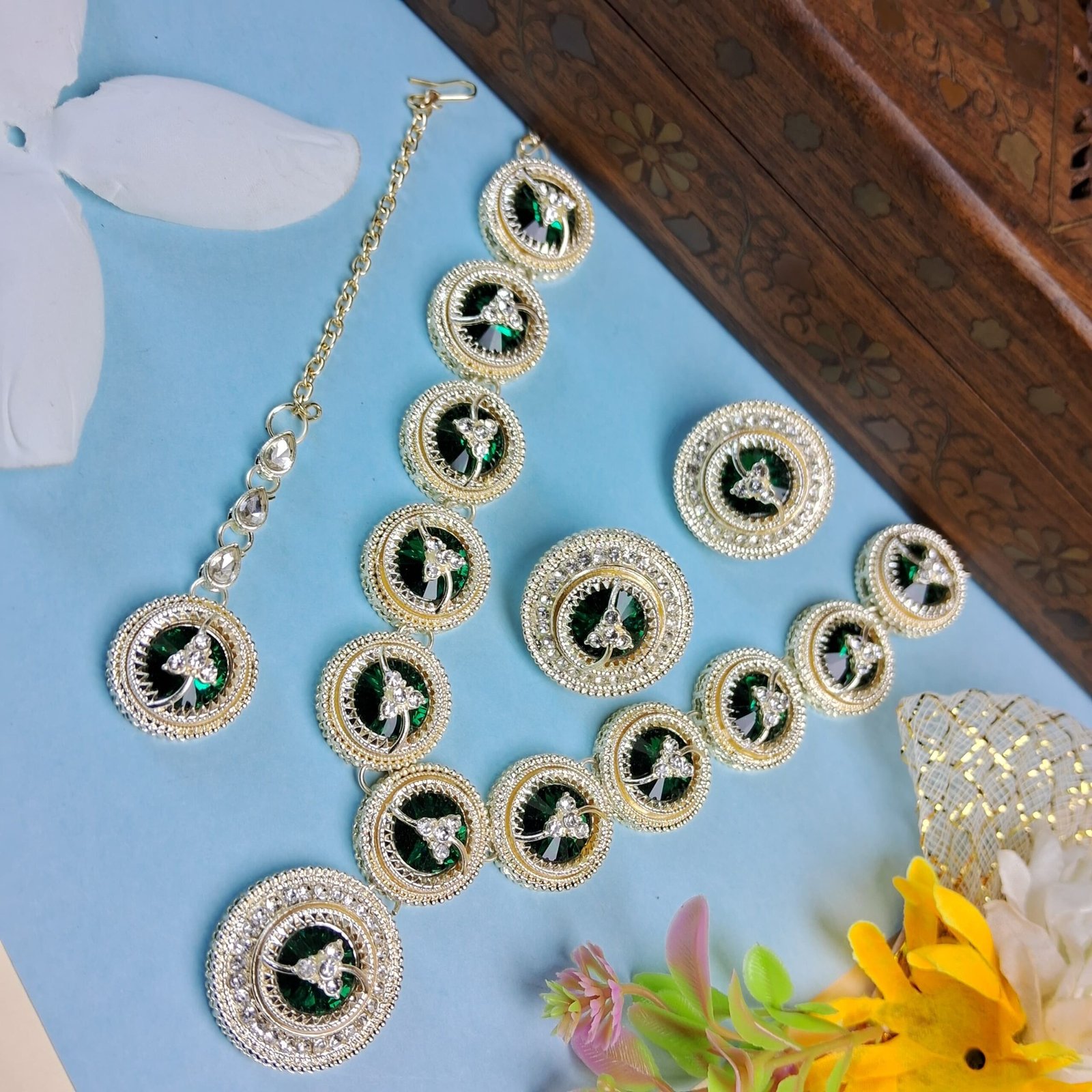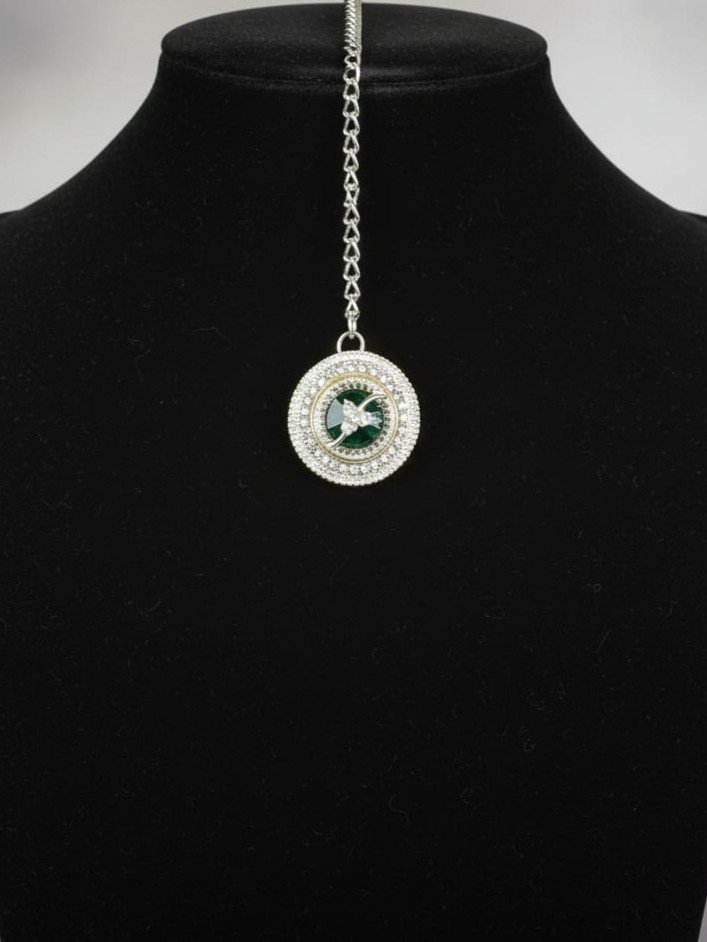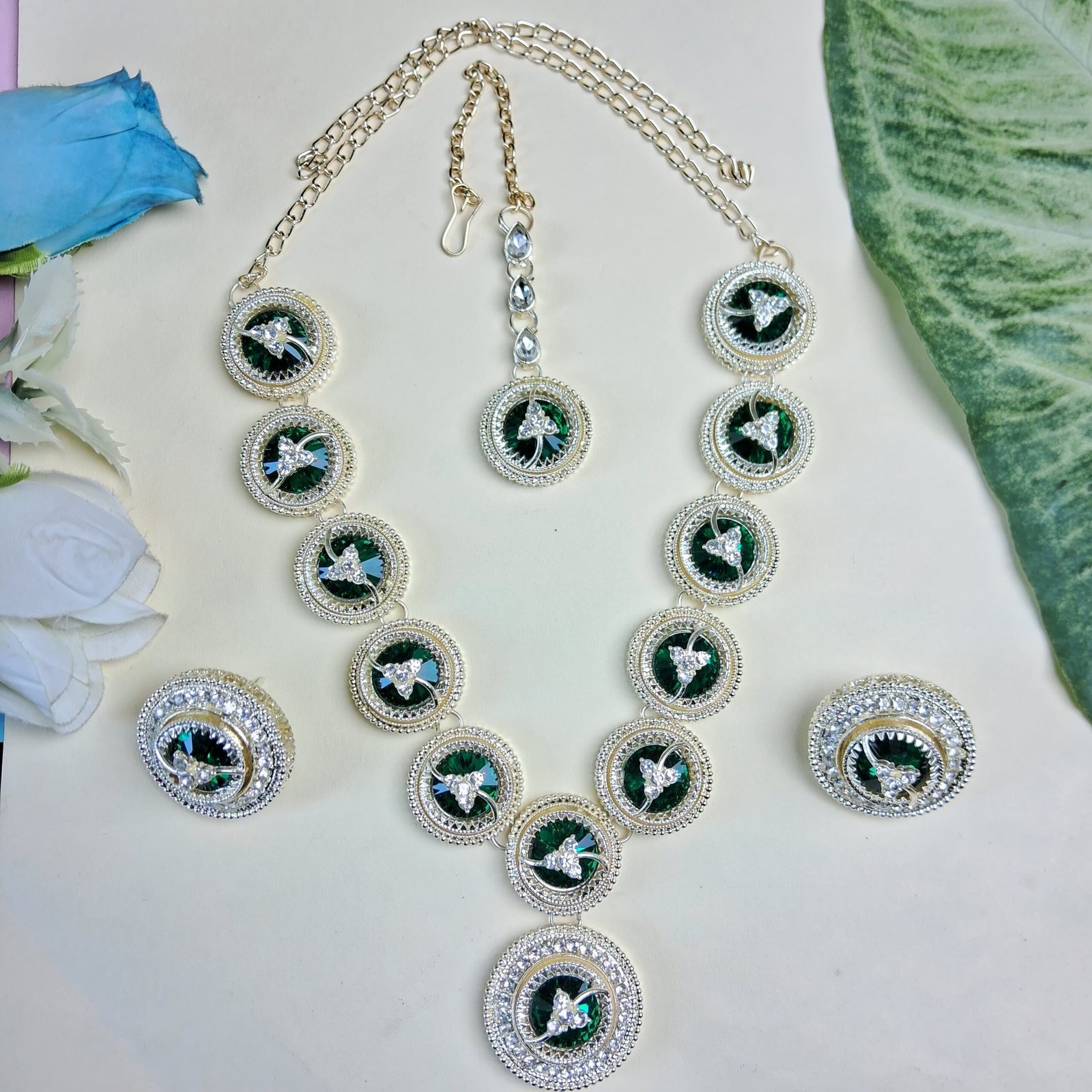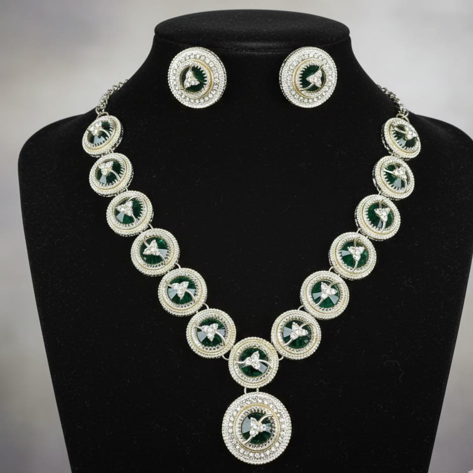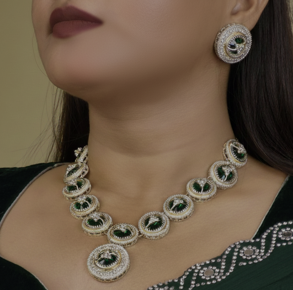 American Diamond Necklace Set for Women | Silver-Tone Green Enamel Jewelry | Bridal, Engagement & Party Wear Necklace with Earrings