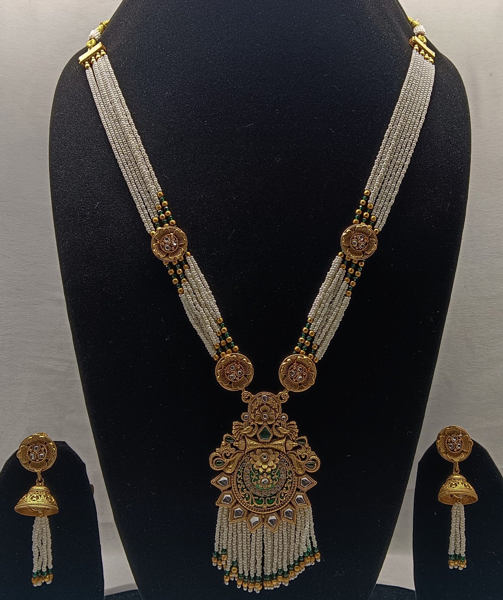 Tags: Beaded jewelry, Beaded necklace, Beaded set, Brass, Diwali, Ethnic necklace sets, Gold-Toned Necklace, Long necklace, Multi-Strand necklace sets, Pearl necklace, Pearl set, Victorian collection, Wedding necklace