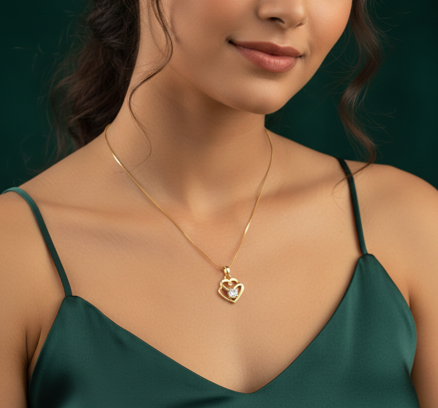 - PRODUCT DETAILS: This AD gold-tone heart pendant features a delicate heart design with AD accent at the center. The intertwined heart motif offers a classic and refined appearance suitable for everyday wear. Lightweight in construction, the pendant is designed for comfortable use throughout the day. The smooth gold-tone finish provides a neat and balanced look, allowing it to pair easily with a variety of outfits. Its simple design complements casual wear, office attire, ethnic clothing, and festive outfits. Suitable for women of all age groups, this pendant is appropriate for regular use as well as gifting on occasions such as birthdays, anniversaries, and celebrations.