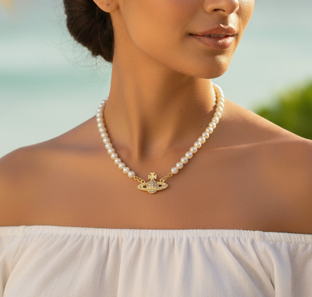 - PRODUCT DETAILS: A sophisticated blend of elegance and edgy charm, this single-row pearl pendant takes cues from iconic punk-luxe fashion. Featuring luminous simulated pearls strung along a polished chain, the pendant is anchored by a signature Orb-inspired pendant adorned with sparkling crystal accents. The design merges classic femininity with a rebellious twist—perfect for the modern style enthusiast. Secured with a lobster clasp, this piece offers easy wear and a secure fit, making it a versatile accessory for both day and evening looks.