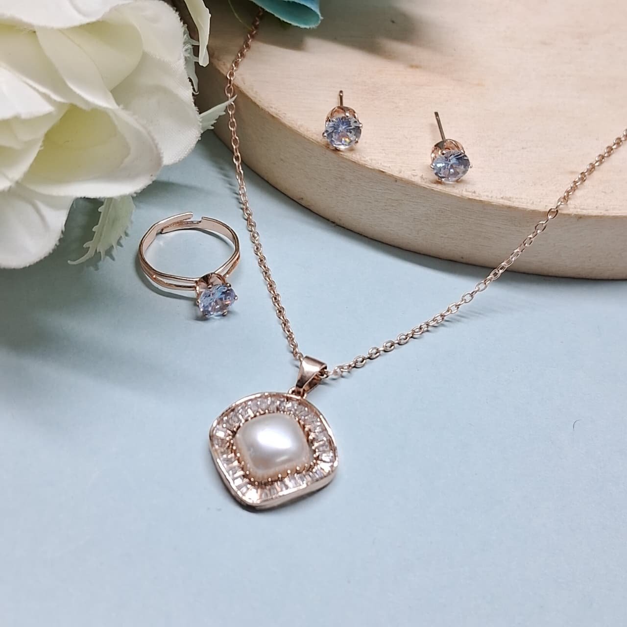 - PRODUCT DETAILS: This minimalist rose-gold jewelry set includes a pendant necklace, a pair of stud earrings, and a matching ring. The necklace features a pearl centerpiece framed with delicate crystal accents in a square design, offering a graceful and modern look. The solitaire-style stud earrings add subtle sparkle, perfect for both daily wear and evening occasions. Completing the set, the rose-gold ring is highlighted by a clear crystal, making it a simple yet stylish accessory. Designed to suit traditional, casual, and formal outfits, this set is versatile and timeless. It also makes a thoughtful gift choice for birthdays, anniversaries, weddings, or festive celebrations.