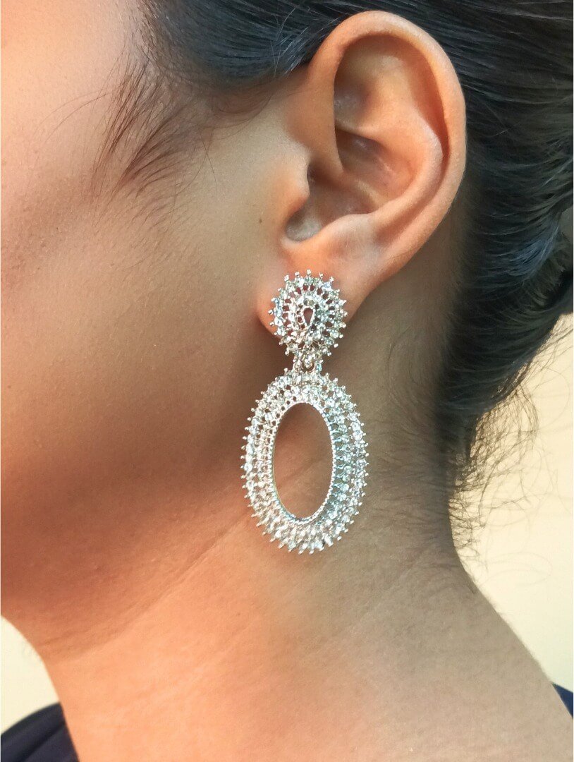 - PRODUCT DETAILS: Shine with understated elegance in these silver-tone dangle earrings, crafted to bring timeless charm to any look. Featuring a teardrop-shaped upper stud and an oval-shaped lower drop, both fully encrusted with silver-tone rhinestones, these earrings radiate graceful sophistication. The seamless combination of the two classic shapes creates a balanced silhouette, ideal for both ethnic and western wear. Set in a lightweight alloy with a high-polish silver finish, they offer both durability and comfort, making them suitable for long events like weddings, festive gatherings, or evening celebrations.