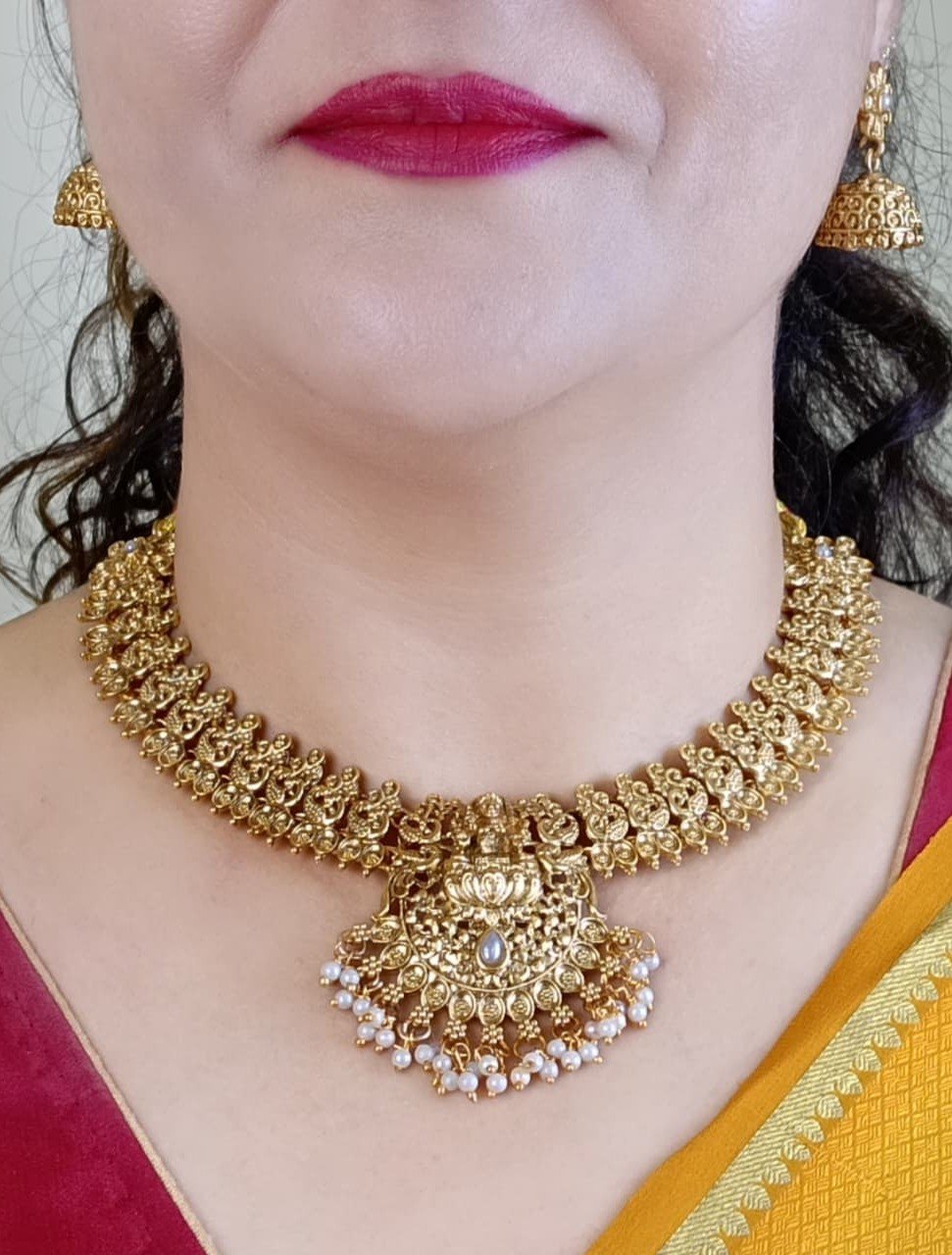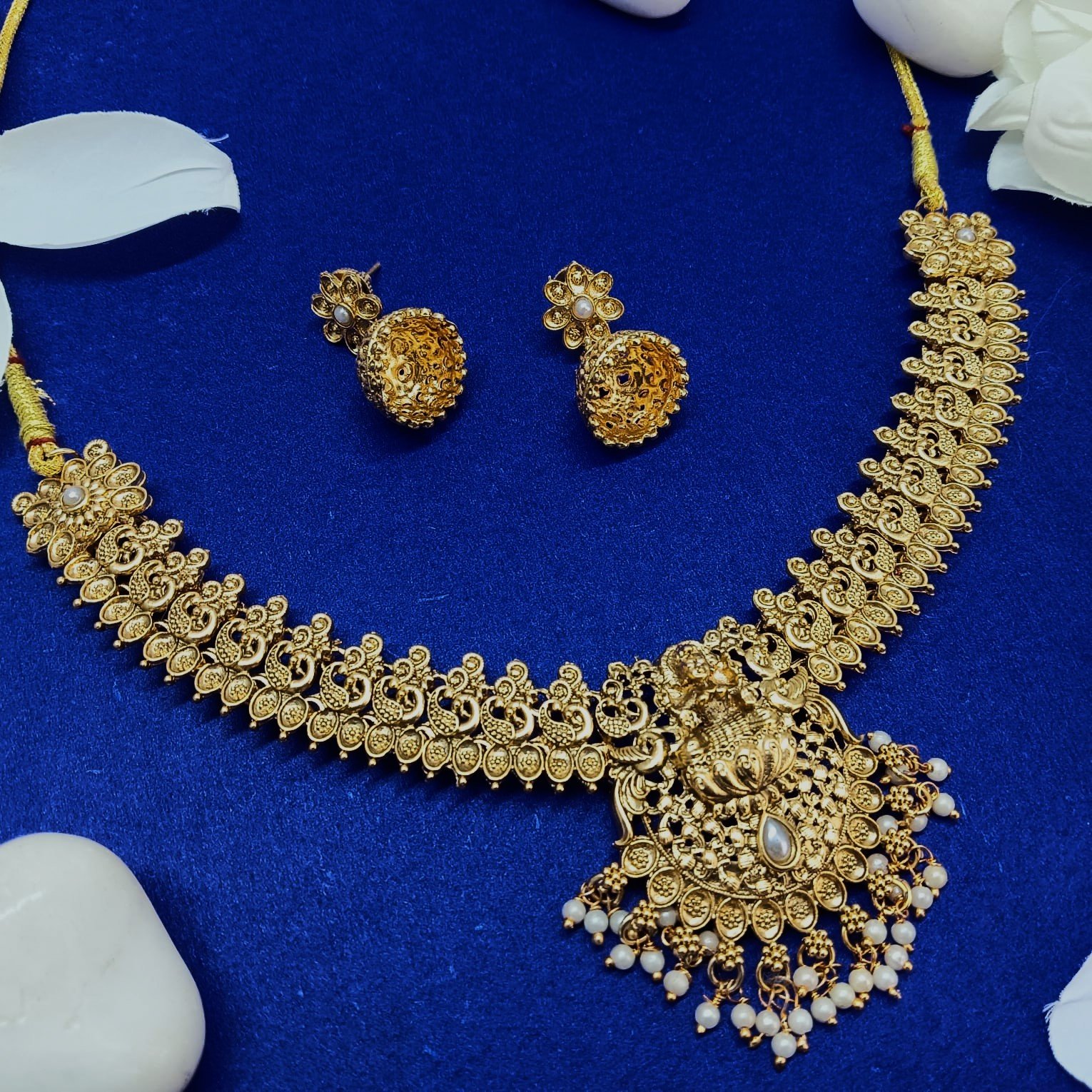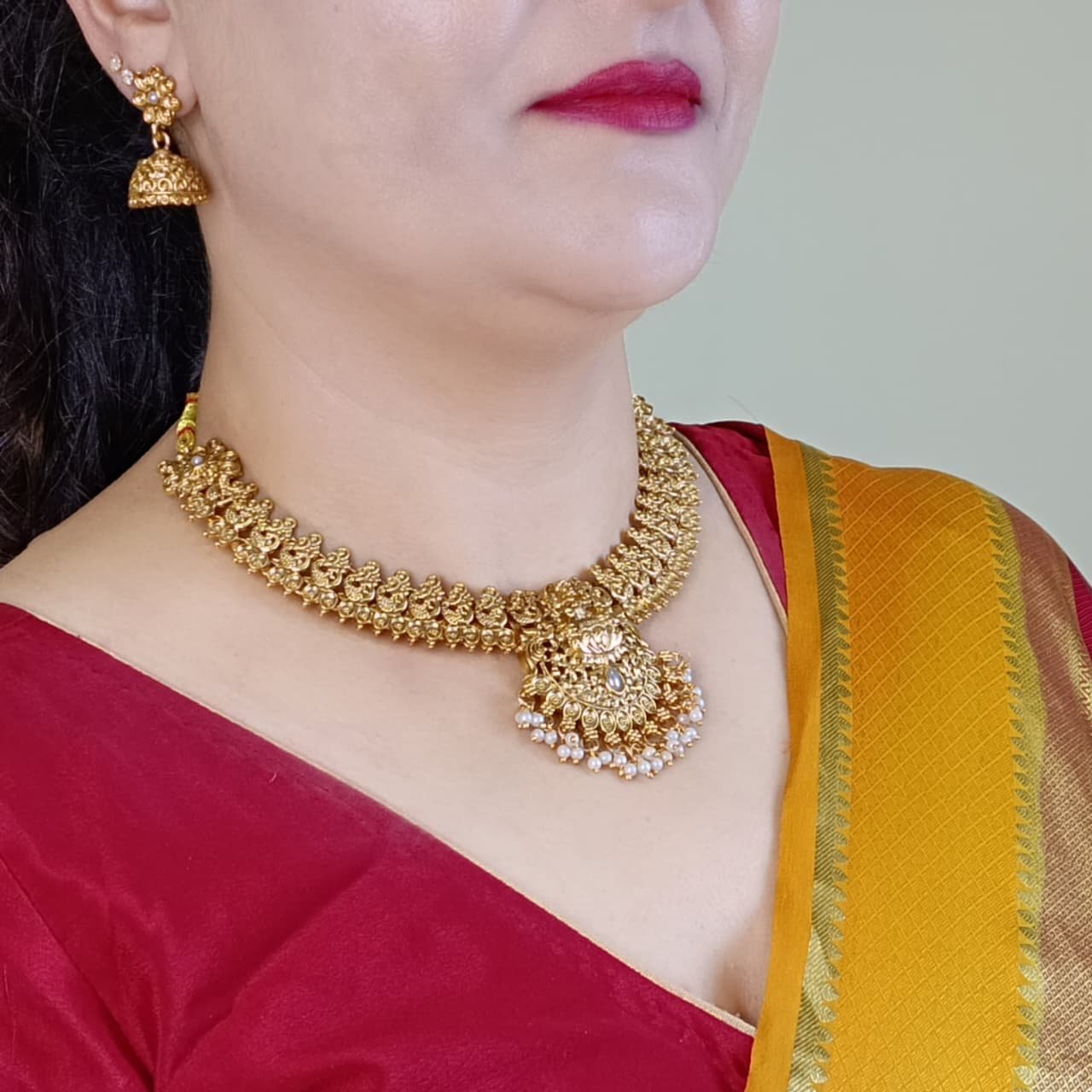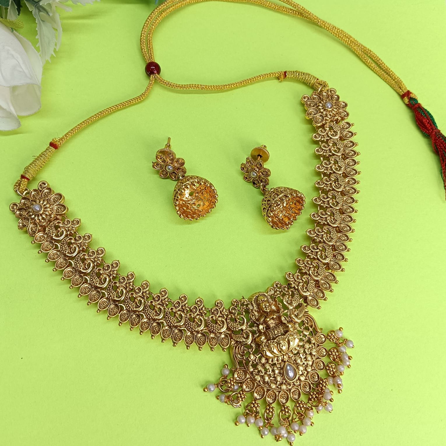 - PRODUCT DETAILS: Celebrate the grandeur of Indian craftsmanship with this exquisitely designed gold-tone temple Jewelry necklace set, crafted with intricate detailing and traditional artistry. At the heart of the necklace sits a beautifully sculpted deity pendant, surrounded by ornate carvings, miniature bead drops, and antique-finish textures—perfect for admirers of heritage Jewelry, temple designs, and ethnic Indian accessories. Every element of this set showcases fine temple-inspired workmanship, from the floral motifs to the sculpted borders that create a regal and opulent silhouette. Paired with matching Jhumki earrings, the set offers a complete, timeless look ideal for festive wear, weddings, classical dance performances, and cultural celebrations.
