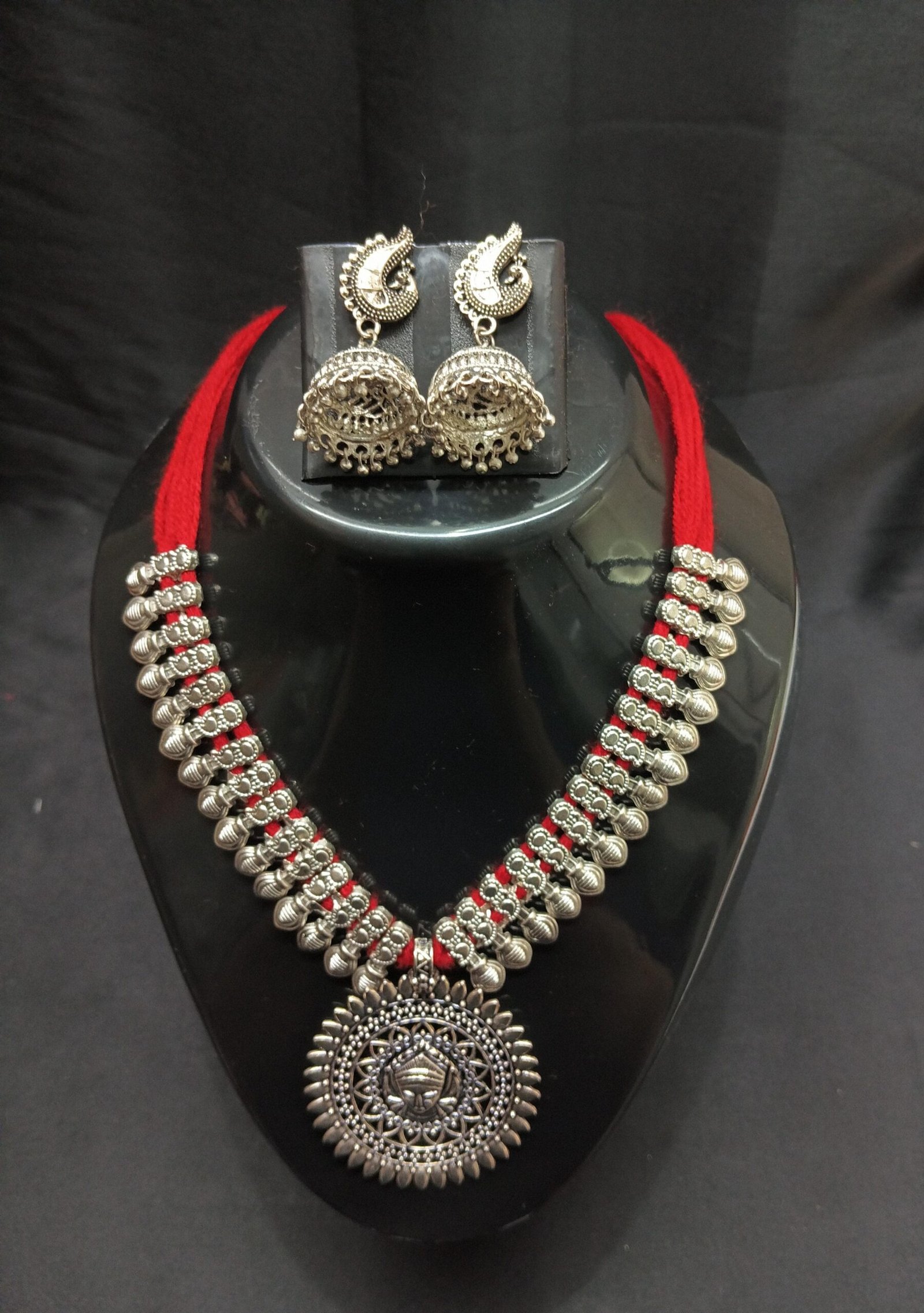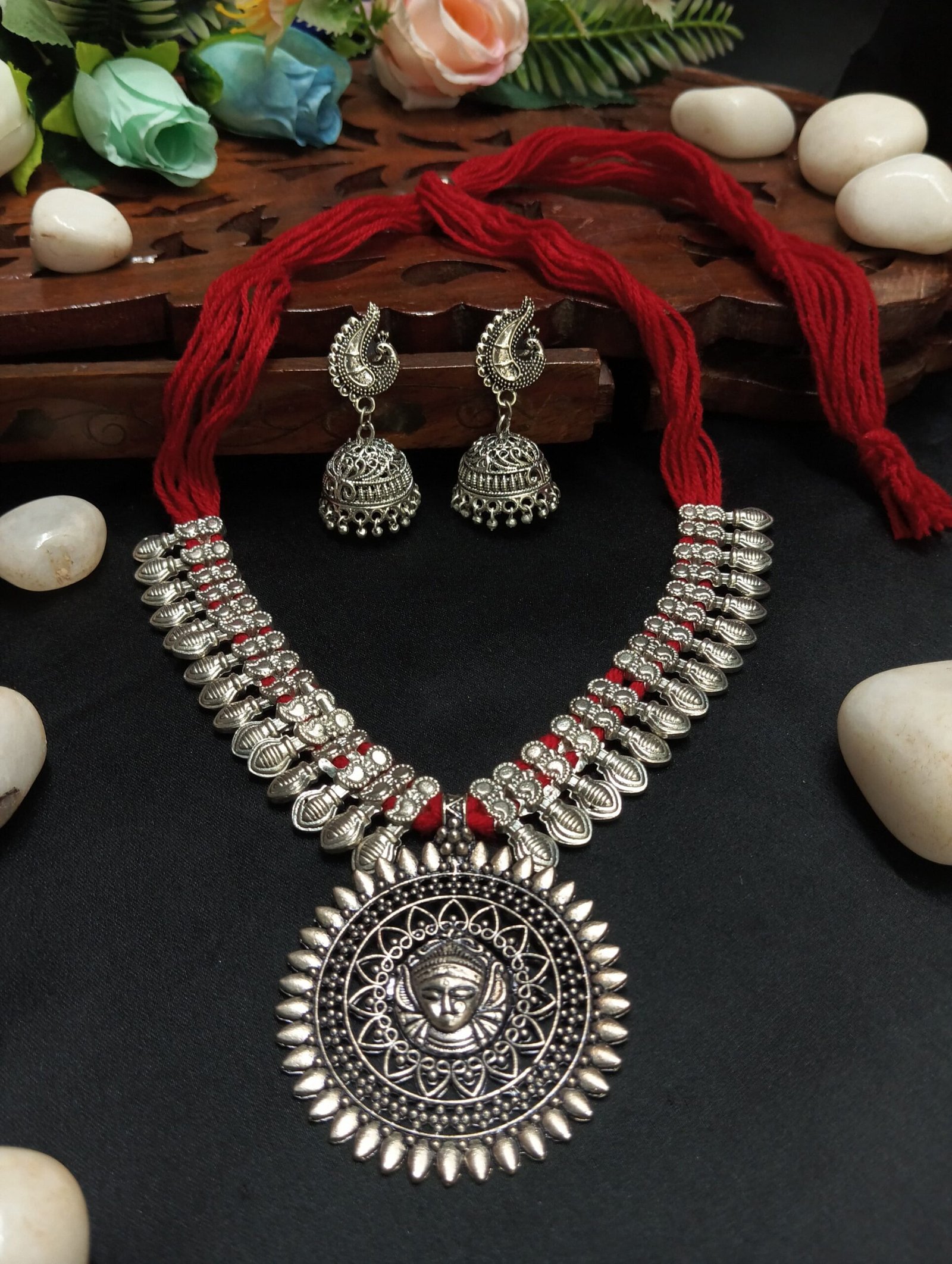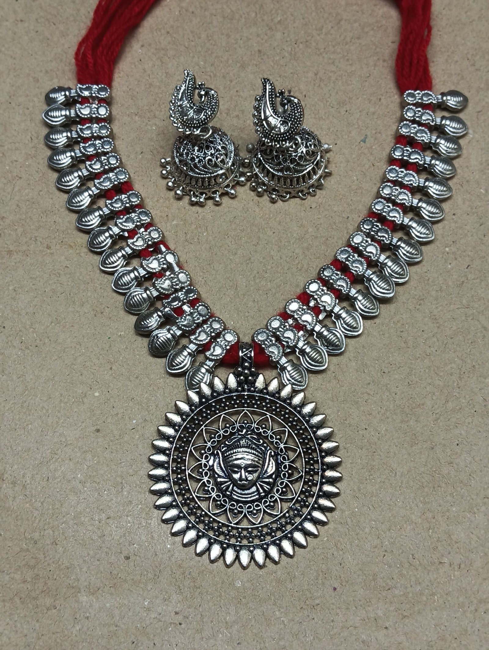 Handmade German silver Goddess durga Necklace set with adjustable red cord back findings| Traditional design for Weddings, Festive and cultural events