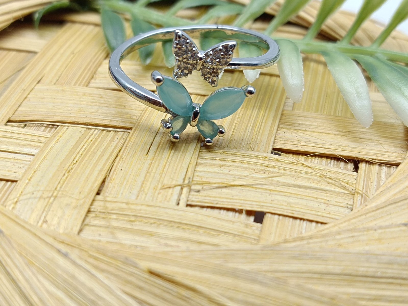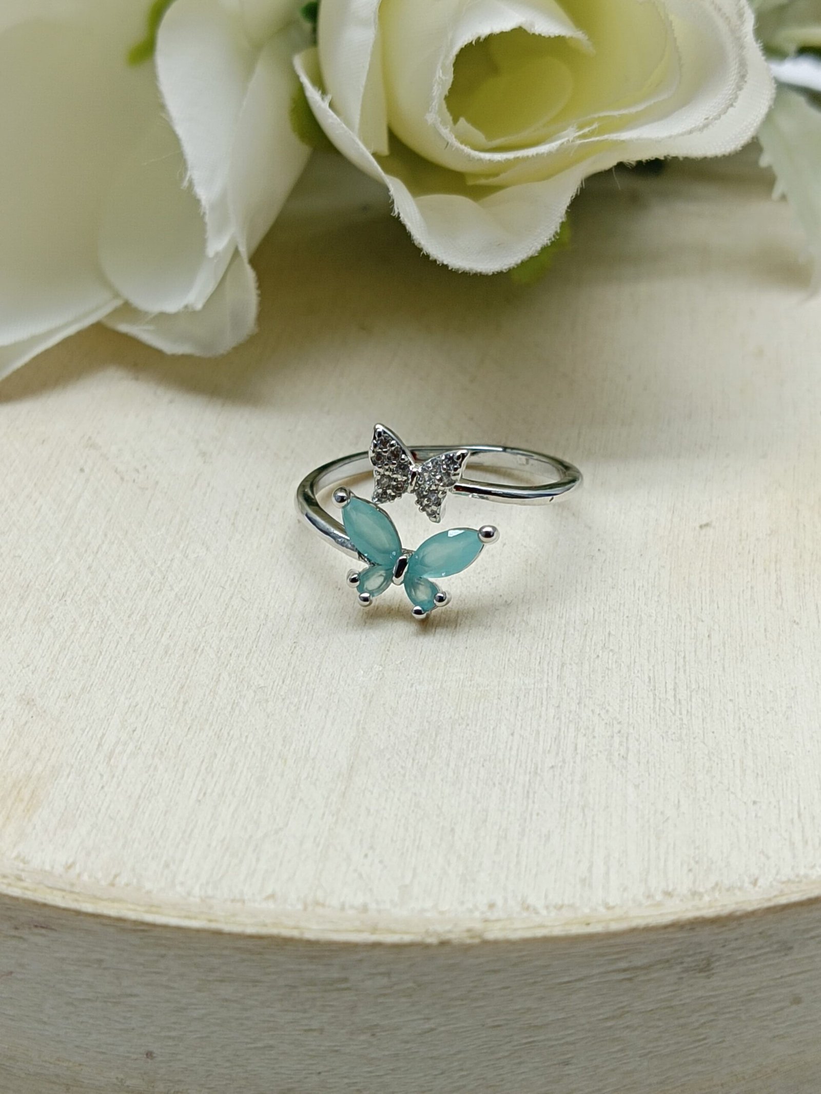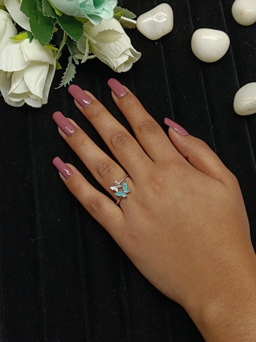 - PRODUCT DETAILS : Celebrate serenity and renewal with this beautifully crafted butterfly ring in a calming sea green hue. Designed with a silver-plated alloy band, the ring features a graceful butterfly motif—one wing adorned with shimmering clear glass stones and the other with sea green gemstone-inspired accents. The soft green shade evokes peace, balance, and emotional healing, making this ring more than just an accessory—it’s a symbol of growth and inner strength. Its adjustable design ensures a comfortable fit for most finger sizes, making it a versatile piece for both everyday wear and special occasions. Whether worn as a personal reminder or given as a thoughtful gift, this ring adds a gentle pop of color and meaningful elegance to any jewelry collection.