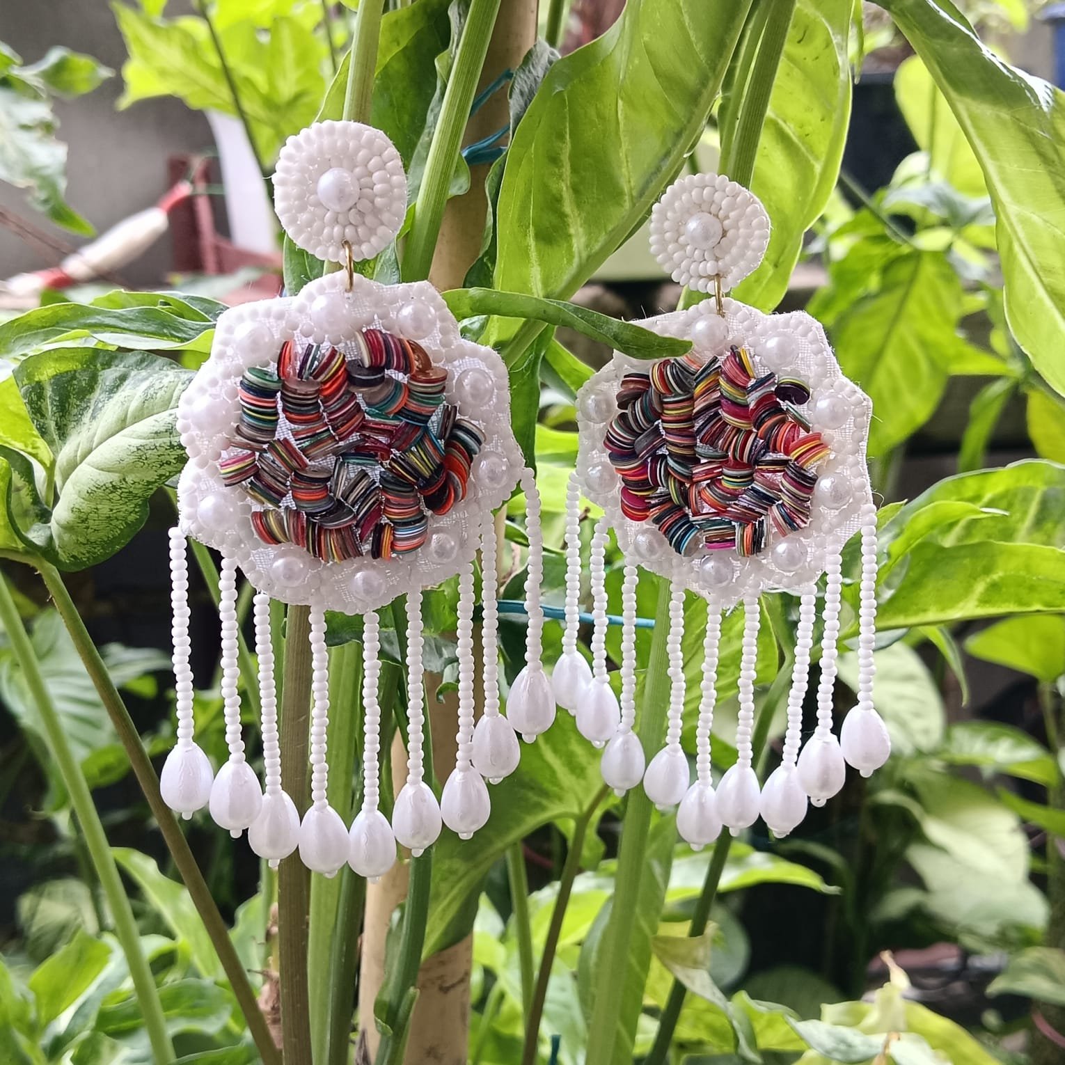 - PRODUCT DETAILS: These stunning earrings feature a circular center with a vibrant, marbled floral design crafted from rolled fabric or paper, giving each piece a one-of-a-kind look. Surrounding the center is a delicate beaded border that adds texture and charm. Dangling below are multiple strands of white beads, each finishing with a larger teardrop-shaped bead, creating graceful movement and elegance. Lightweight and comfortable, these earrings are perfect for all-day wear without sacrificing style.