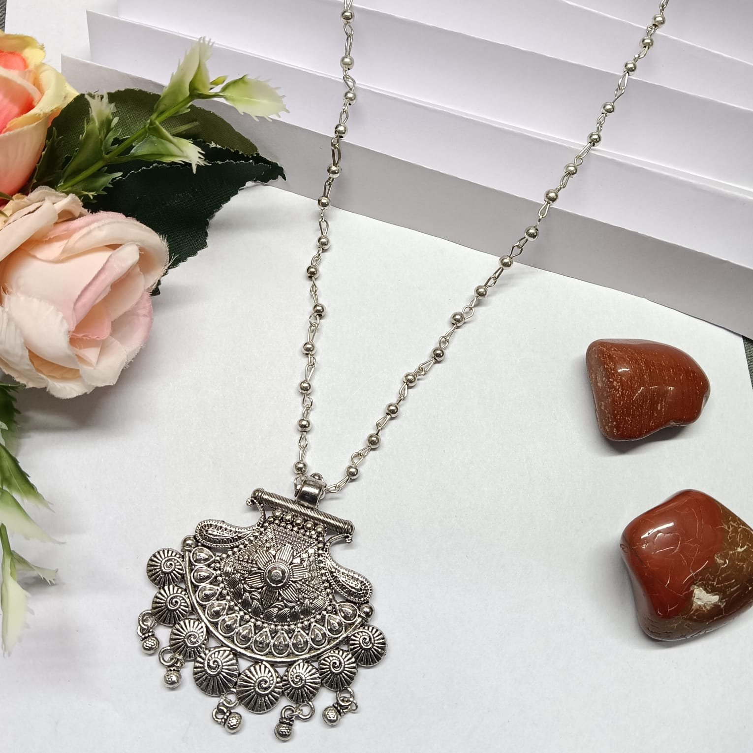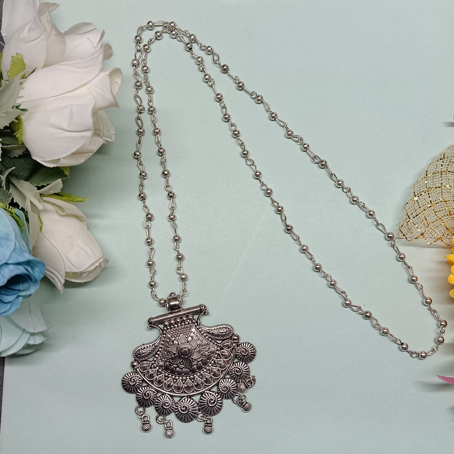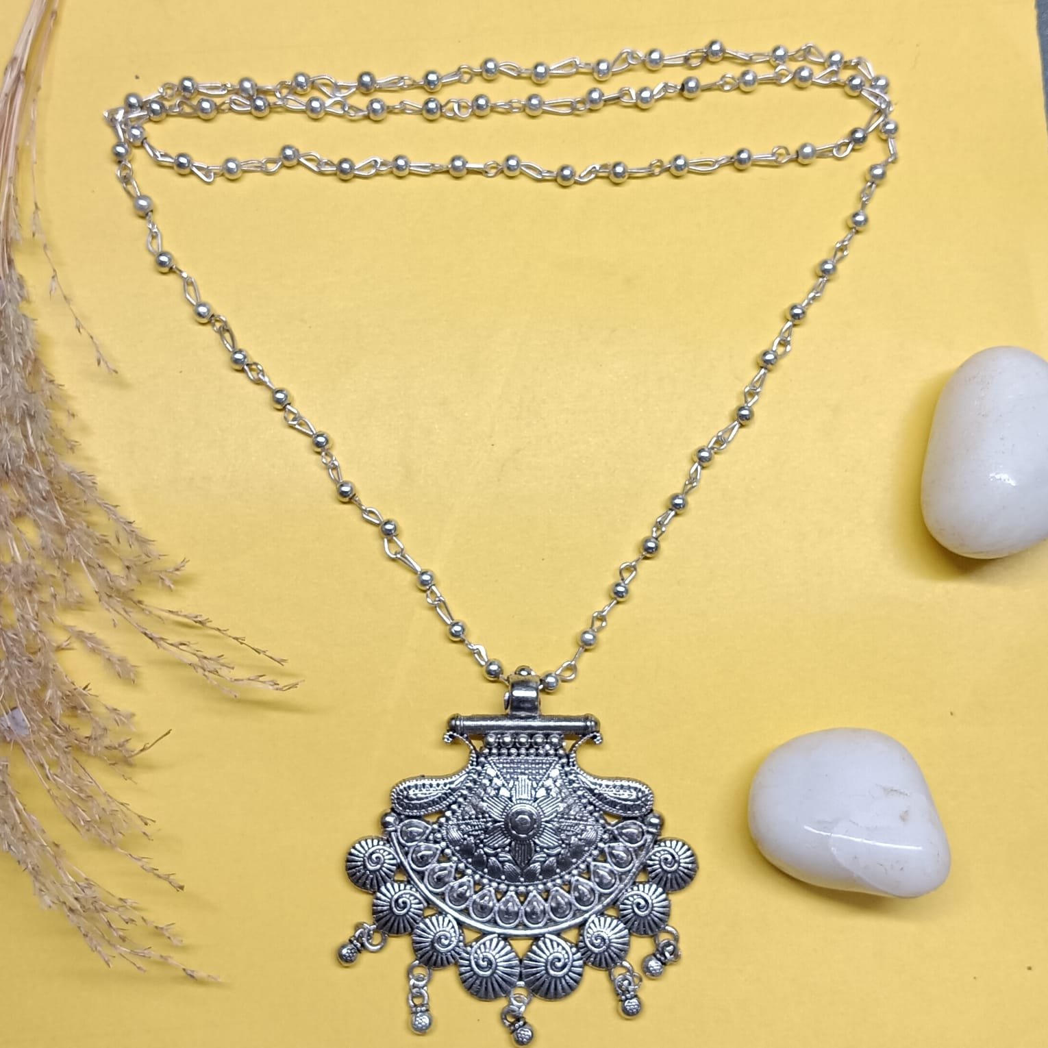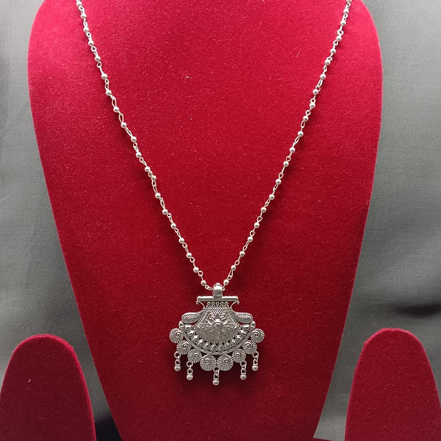 - PRODUCT DETAILS : Celebrate the beauty of tradition with this handcrafted German silver necklace, designed to bring timeless elegance to any outfit. Featuring intricate floral patterns and traditional carvings, each detail reflects skilled craftsmanship and an appreciation for heritage jewelry.The antique-finish surface gives it a warm, vintage glow, while the long matching chain ensures comfort and versatility. Whether paired with a saree, lehenga, kurta, or even a fusion Indo-Western look, this necklace adds a touch of sophistication and charm. Perfect for festivals, weddings, cultural gatherings, or even casual outings when you want to make a subtle yet striking style statement. This piece is more than just jewelry—it’s a celebration of artistry, culture, and personal style.