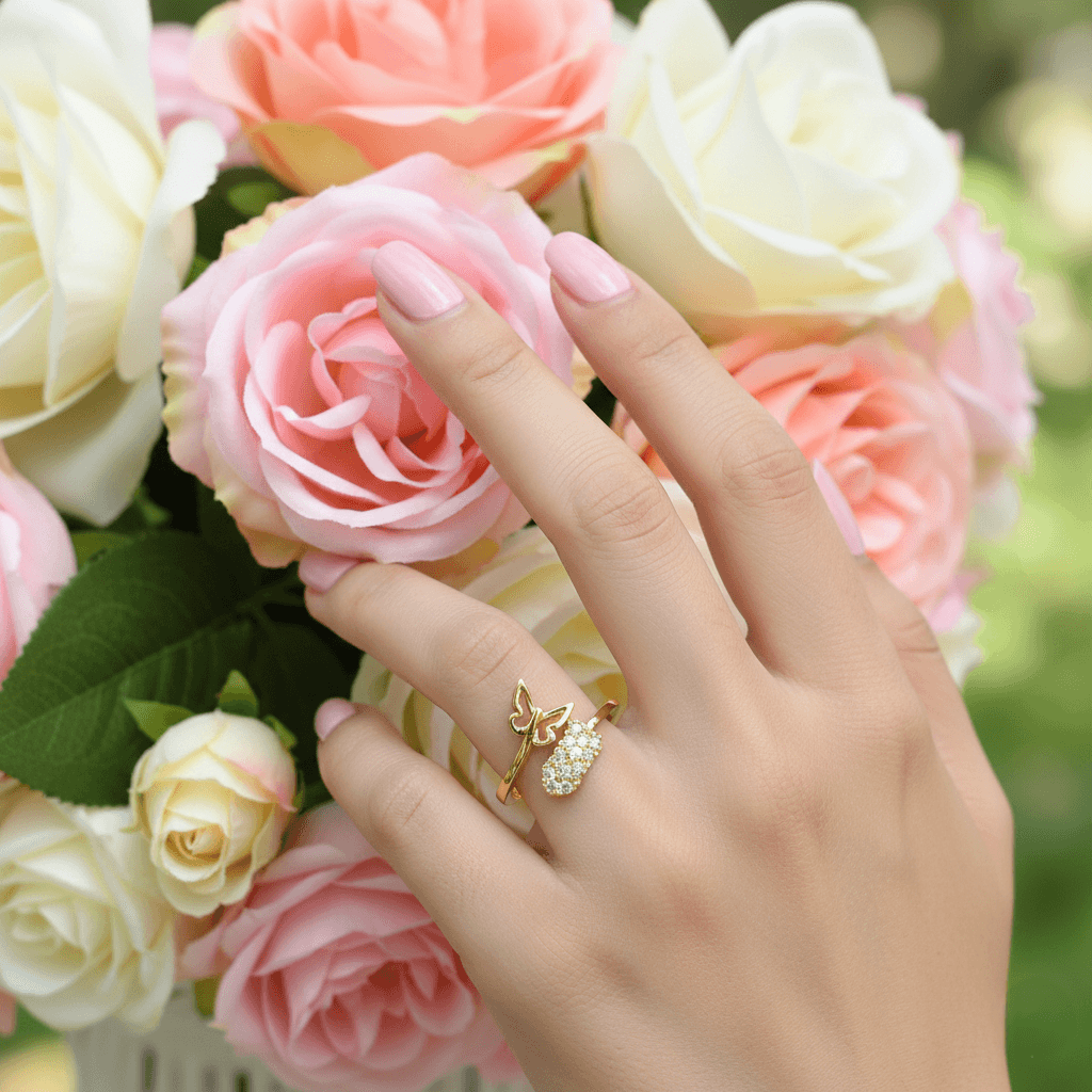 - PRODUCT DETAILS: Delicate, playful, and full of charm—this open design ring is perfect for those who love jewelry with a whimsical touch. The gold-plated band gently wraps around the finger and ends in two stunning focal points. On one side, a sparkling cluster of stones forms a soft, heart-like shape that catches the light beautifully. On the other, a finely detailed butterfly with an openwork design adds a sense of grace and airiness. The warm gold tone enhances the elegance of the piece, making it a standout accessory that feels both modern and romantic. It’s a lovely choice for anyone drawn to meaningful, feminine design.