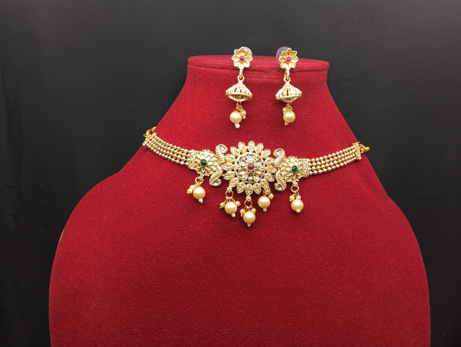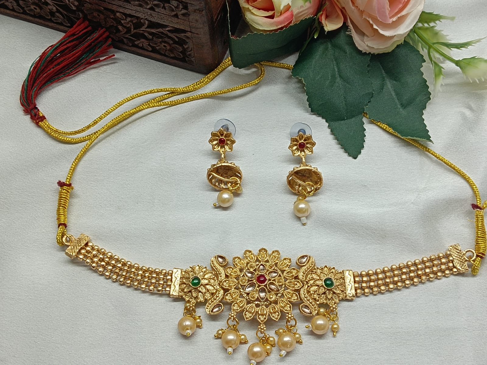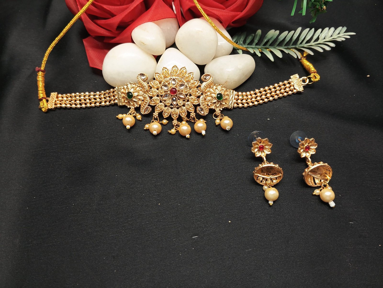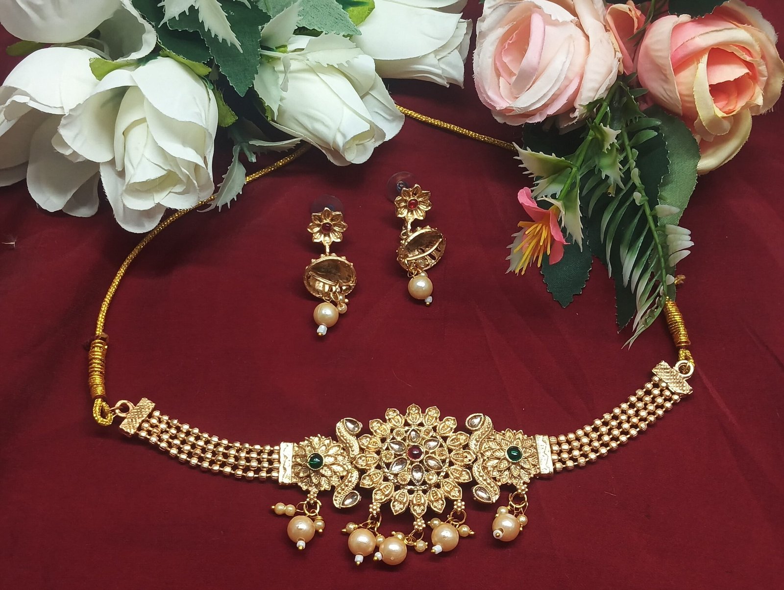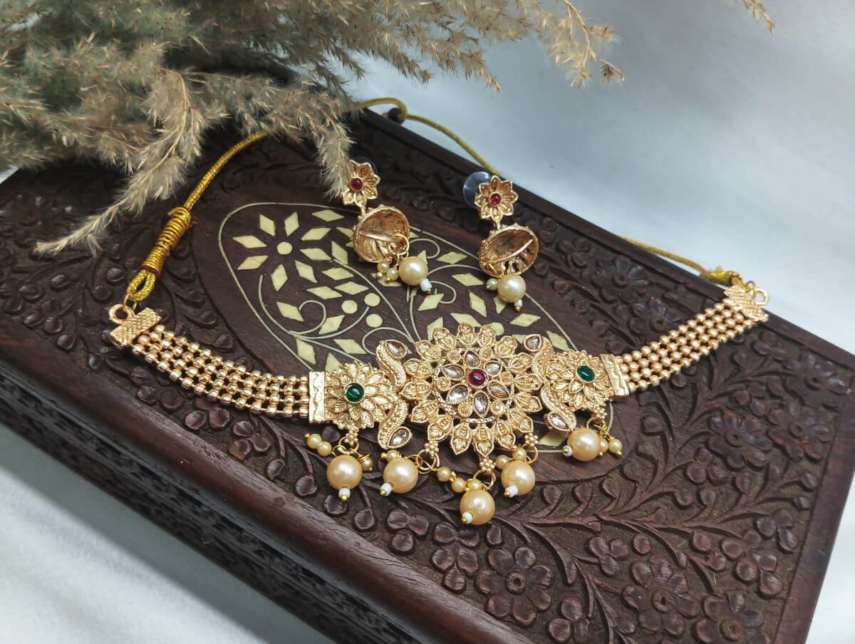 - PRODUCT DETAILS: Add a regal touch to your ethnic ensemble with this exquisitely crafted traditional Indian choker necklace set, designed to turn heads at every celebration. At the heart of the wide, gold-plated choker lies a striking floral centerpiece, featuring a large flower design with a deep red stone at its center. Flanking it are two smaller floral accents, each adorned with a green stone, adding a beautiful contrast and touch of vibrant color.The necklace’s intricate patterns and delicate dangling elements showcase fine craftsmanship inspired by traditional Indian jewelry. Paired with matching drop earrings that mirror the ornate details of the choker, the set brings timeless elegance to your festive wardrobe. Perfect for weddings, festivals, parties, and traditional ceremonies, this bridal jewelry set pairs beautifully with sarees, lehengas, and Anarkali outfits. With its luxurious gold finish and colorful accents, it offers a grand look without the price tag of real gold—making it a standout piece for any special occasion.