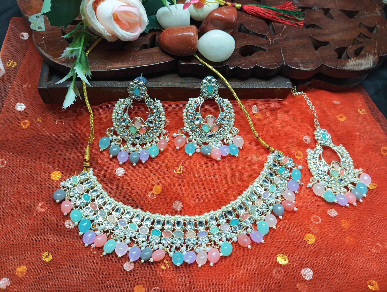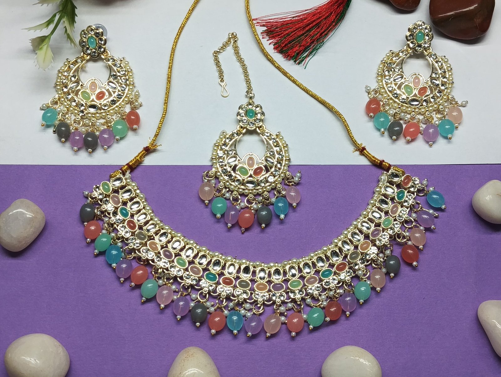 - PRODUCT DETAILS: Infuse your ethnic look with royal elegance through this exquisite choker necklace set. Designed on a radiant gold-plated base, this set showcases a timeless choker pattern adorned with classic Kundan Stones and vibrant simulated pearl beads in multiple colors along the lower edge. The interplay of rich textures and vibrant hues adds a graceful charm, making it perfect for festive and ceremonial wear. The set includes a matching pair of earrings that echo the necklace’s intricate detailing, ensuring a beautifully coordinated ensemble. Whether paired with a saree, lehenga, or Indo-western outfit, this jewelry set adds instant sophistication and tradition-inspired allure to your look.