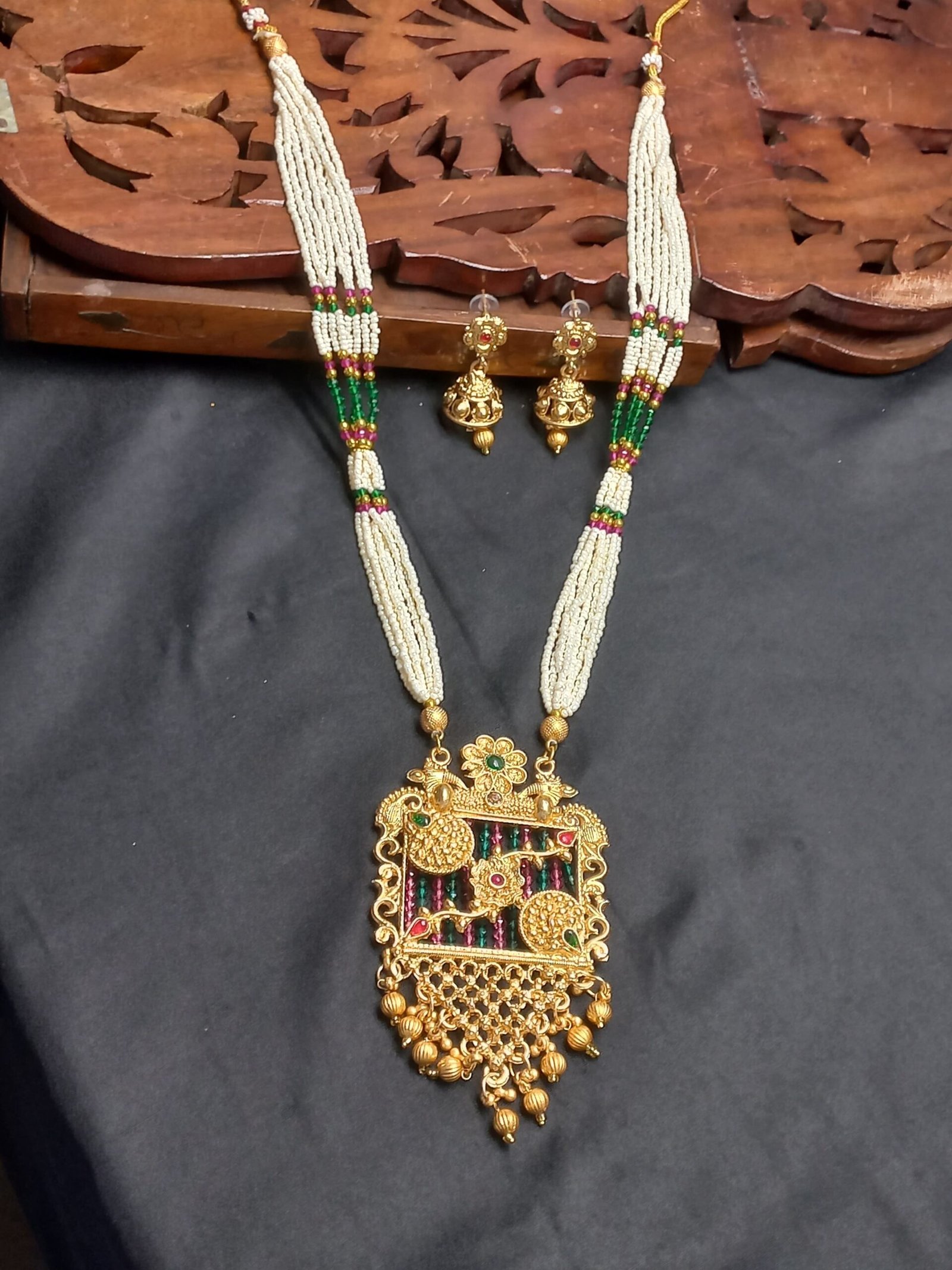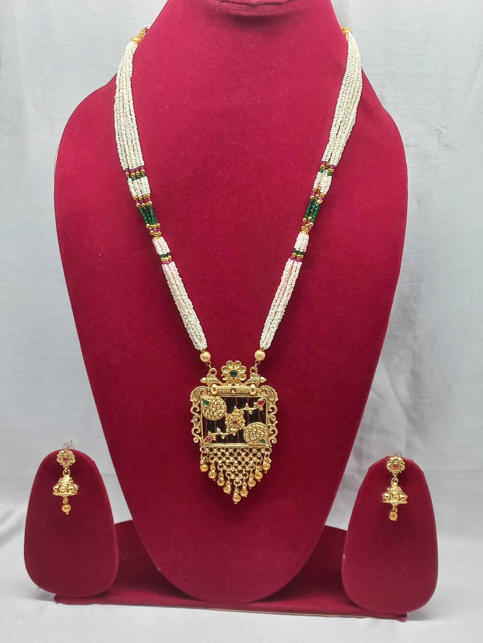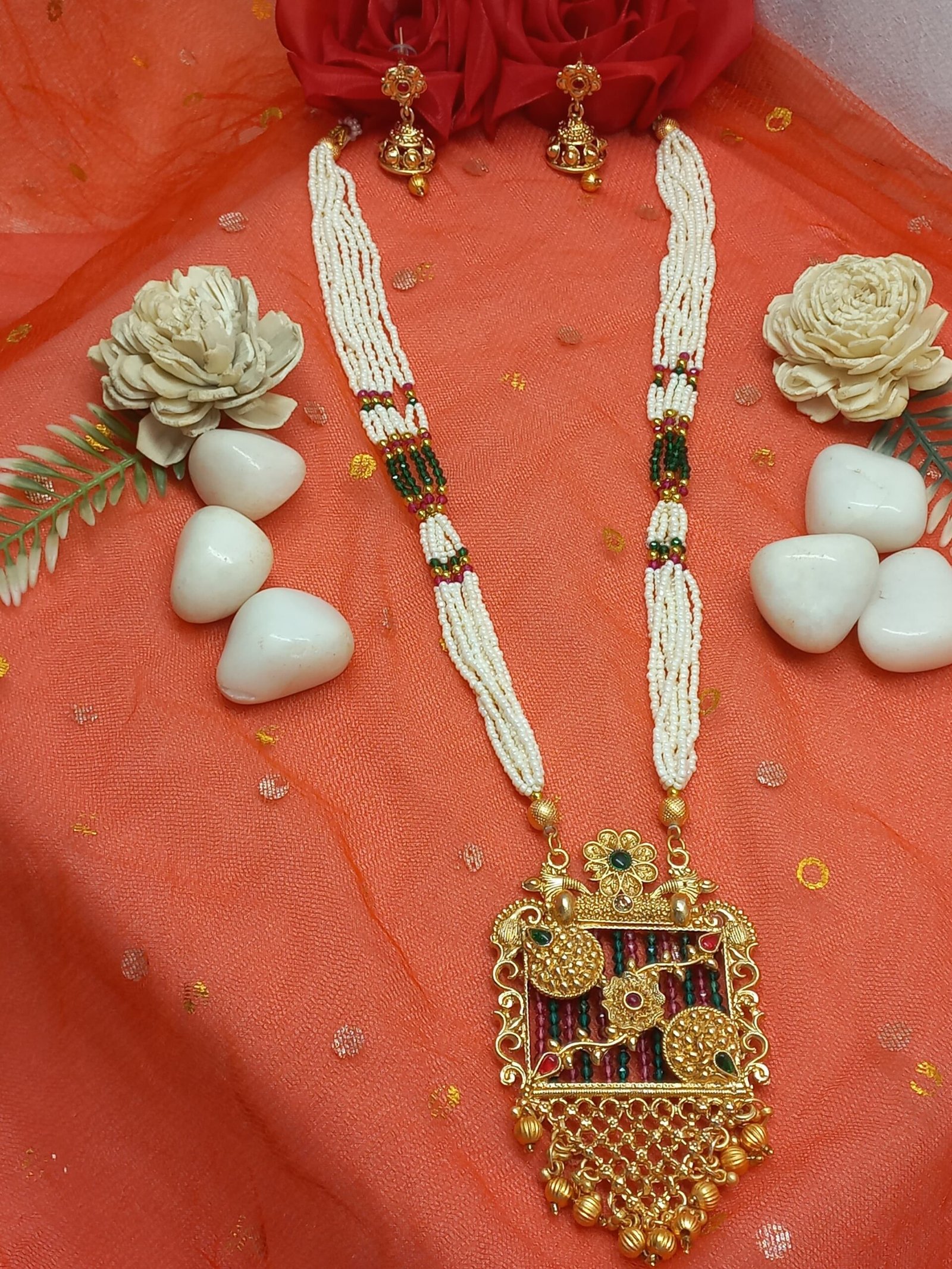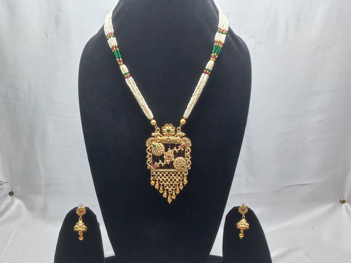 - PRODUCT DETAILS: Bring home the charm of traditional Indian elegance with this beautifully crafted gold-plated jewelry set. Adorned with artificial Kundan stones and pearls, this set features a floral Rajwadi pendant on a heavy-look multi-strand pearl mala, offering a royal and graceful appeal. Paired with matching earrings, it’s a complete accessory to elevate any ethnic outfit. Crafted from brass base metal, this set is finished in radiant gold plating and is designed to last, offering both style and durability. The multicolor finish enhances its versatility, making it suitable for a wide range of traditional ensembles. Perfect for festive occasions or as a meaningful gift for a loved one.