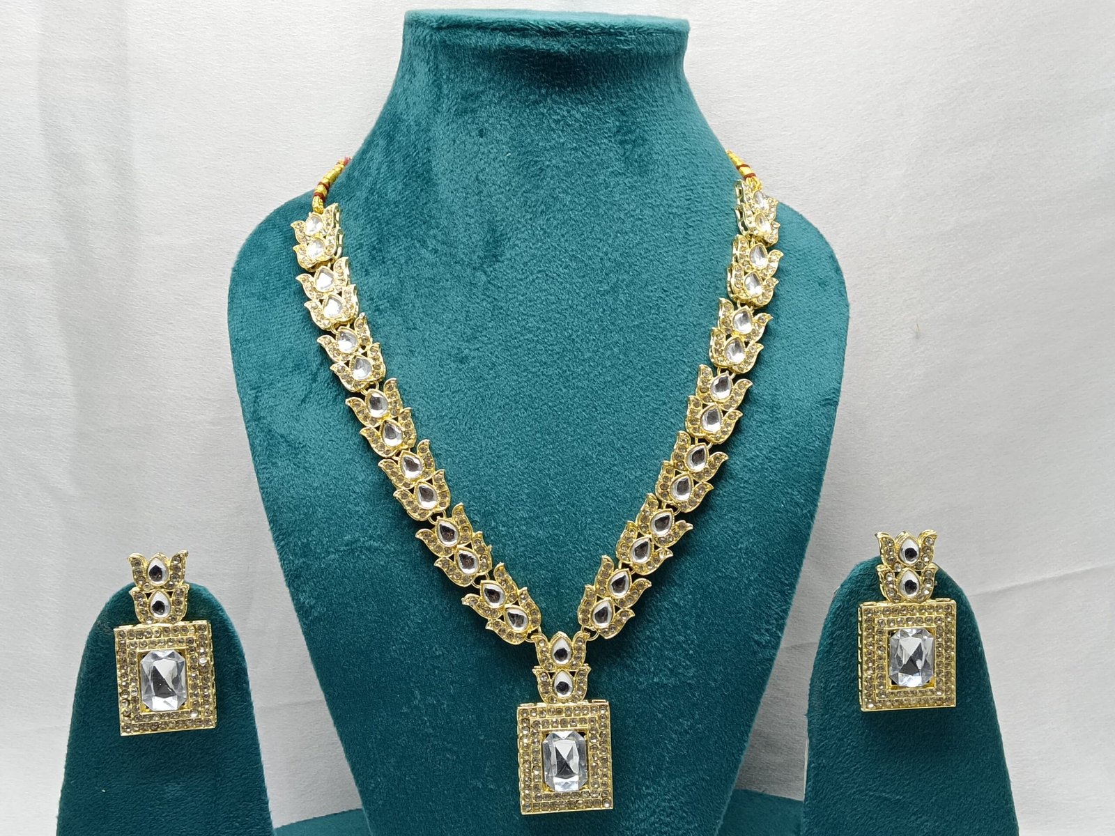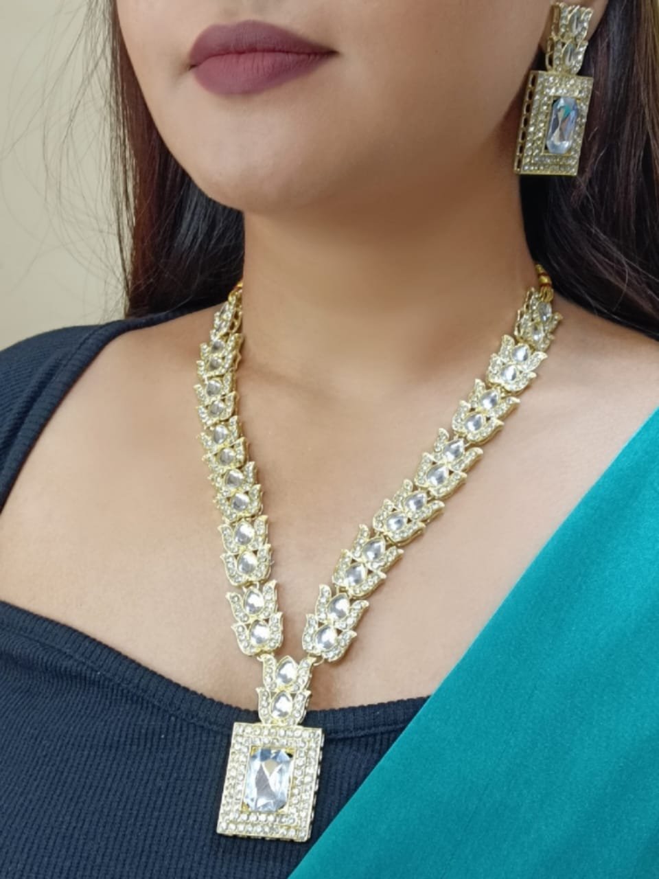- PRODUCT DETAILS: This elegant necklace set showcases a long, graceful strand necklace paired with matching earrings, expertly crafted from premium materials and finished with radiant gold or silver plating. Adorned with dazzling American diamond-style stones and vivid emerald-colored accents, the necklace features a striking central emerald-hued stone framed by a sparkling halo, with alternating emerald and diamond-like stones delicately arranged along the chain. The earrings highlight a beautiful lotus-inspired motif, showcasing rectangular emerald-style stones encased in a shimmering diamond halo. Perfect for weddings, festivals, religious ceremonies, and parties, this versatile set effortlessly enhances both traditional ethnic attire and modern Western outfits.