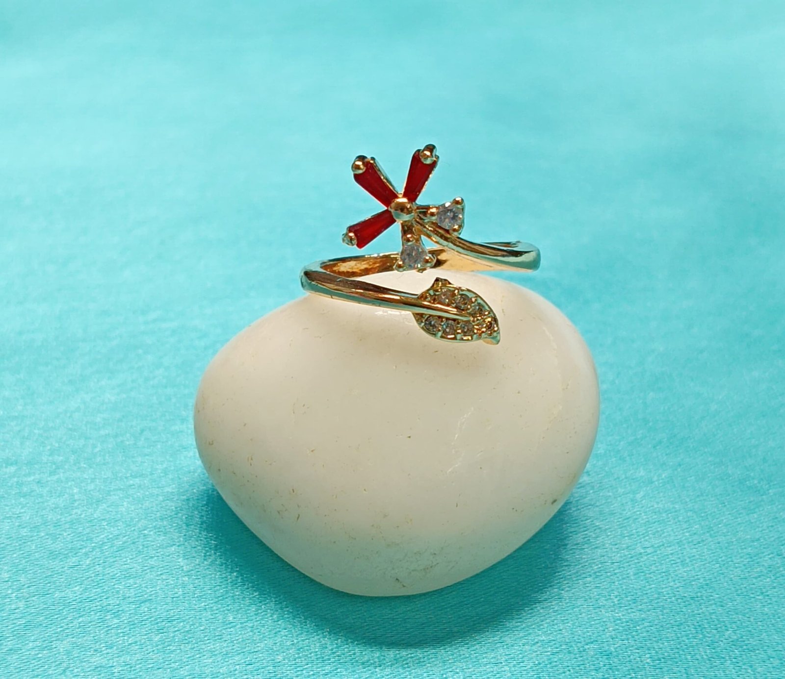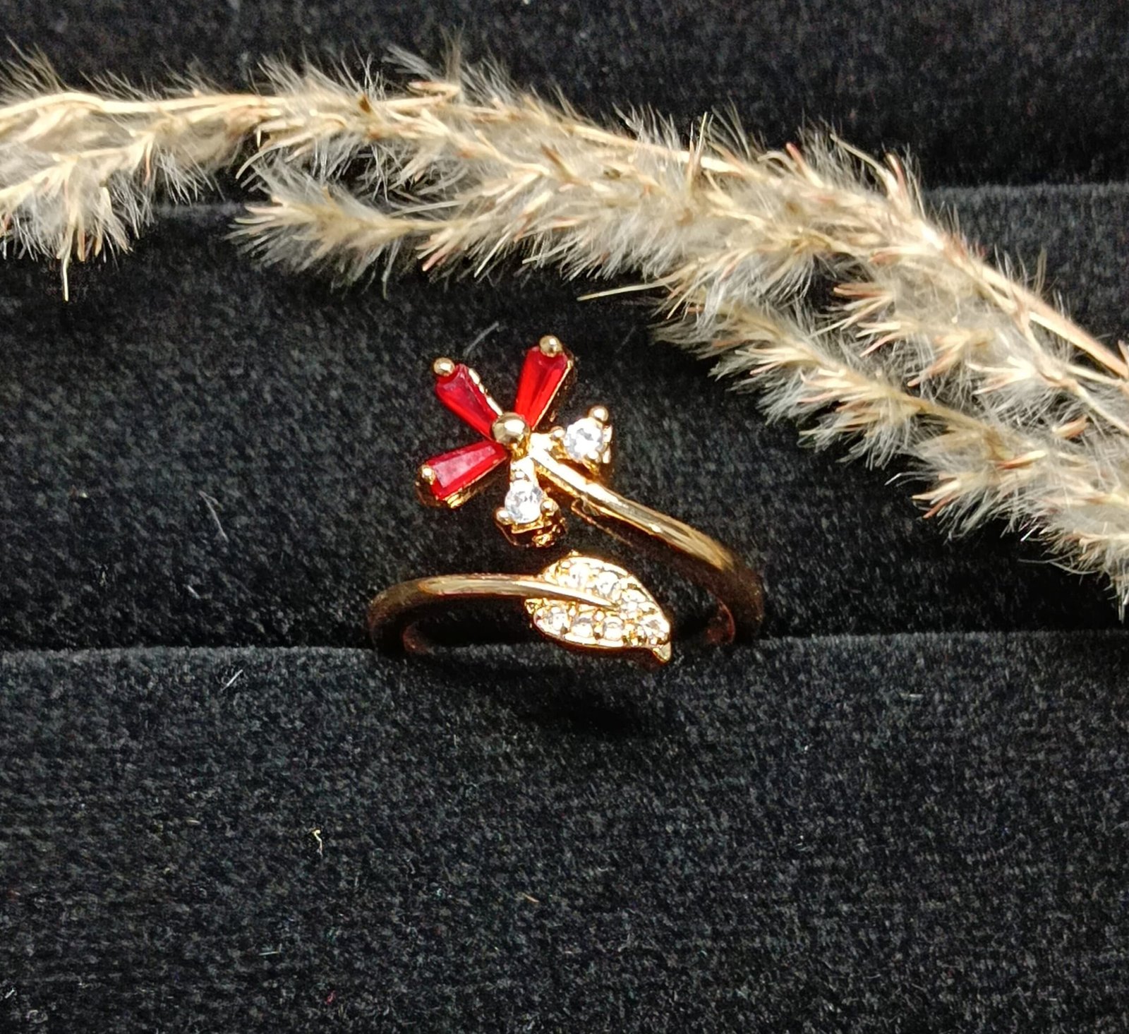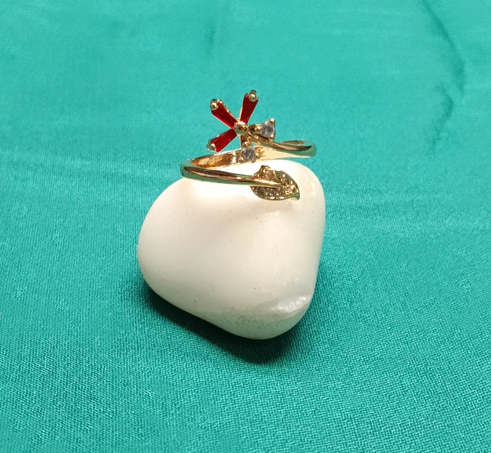 - PRODUCT DETAILS: Add a hint of playful elegance to your jewelry collection with this stunning gold-tone adjustable ring. Designed with an open-ended band that gently wraps around the finger, this ring offers a comfortable, flexible fit. The centerpiece is a charming, bow-inspired design in a rich red hue, delicately accented with sparkling clear stones. More clear stones line the band, adding a subtle shimmer that catches the light beautifully. Whether you’re dressing up for a special occasion or adding flair to your everyday style, this ring brings a unique blend of sophistication and whimsy.
