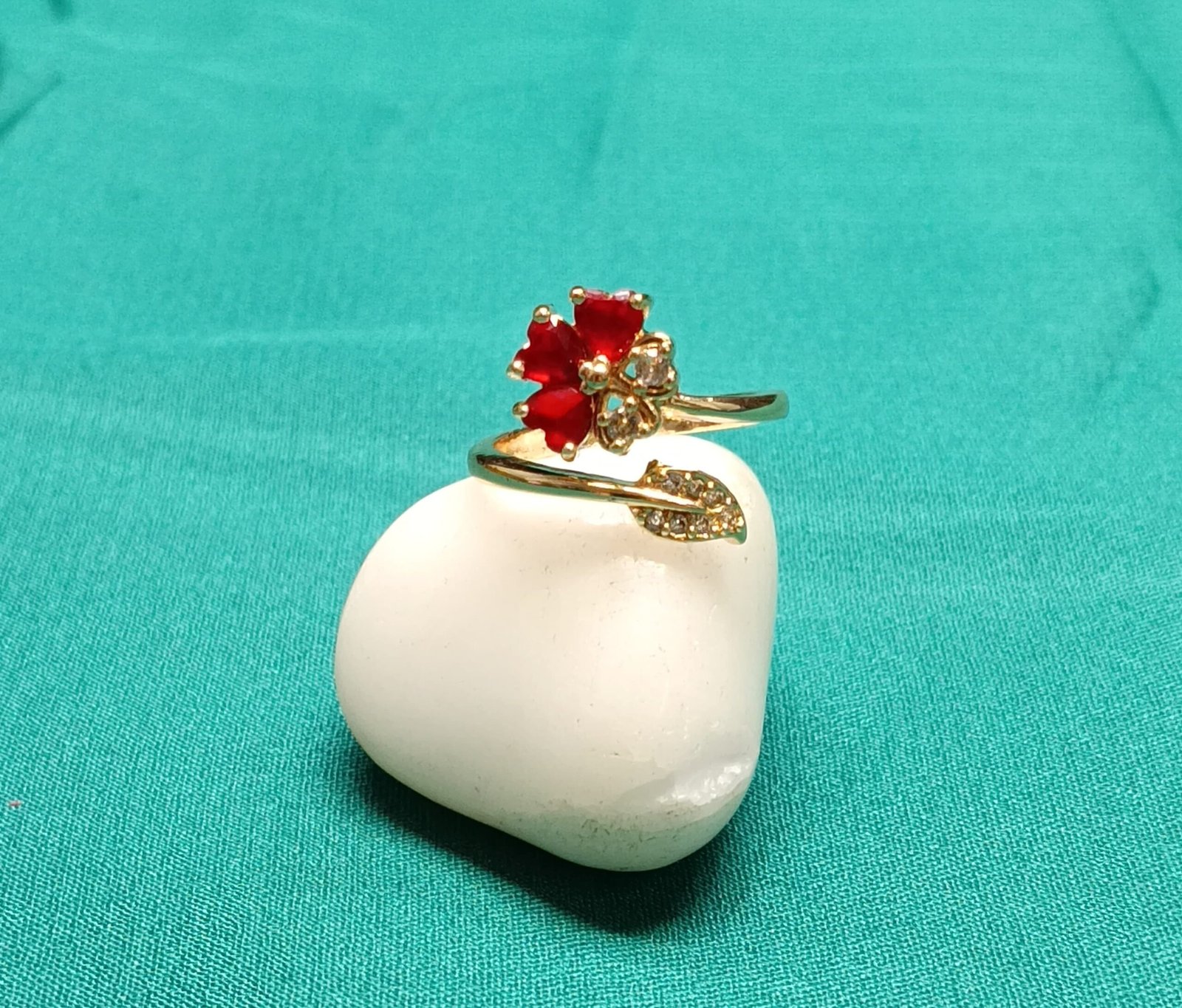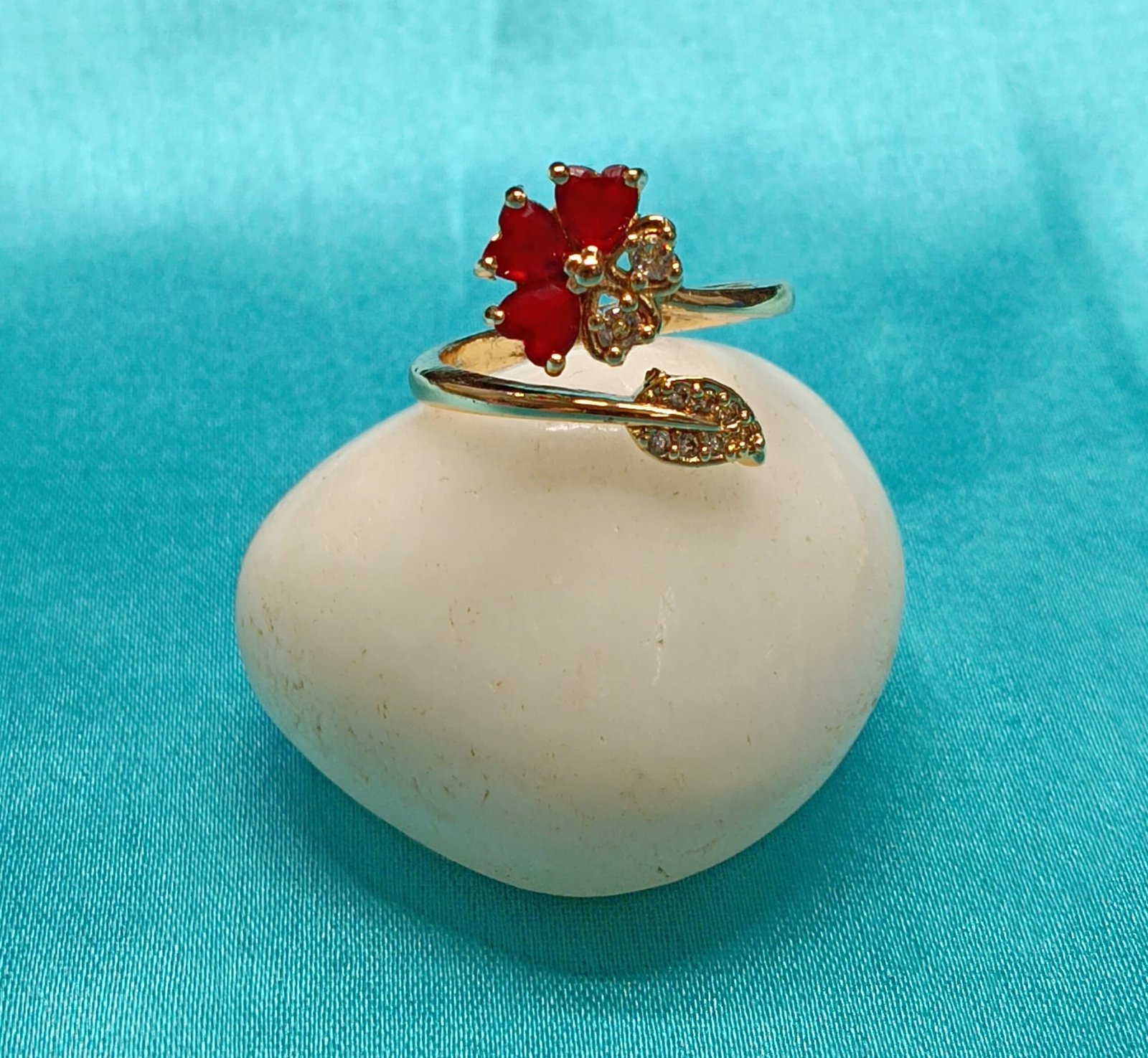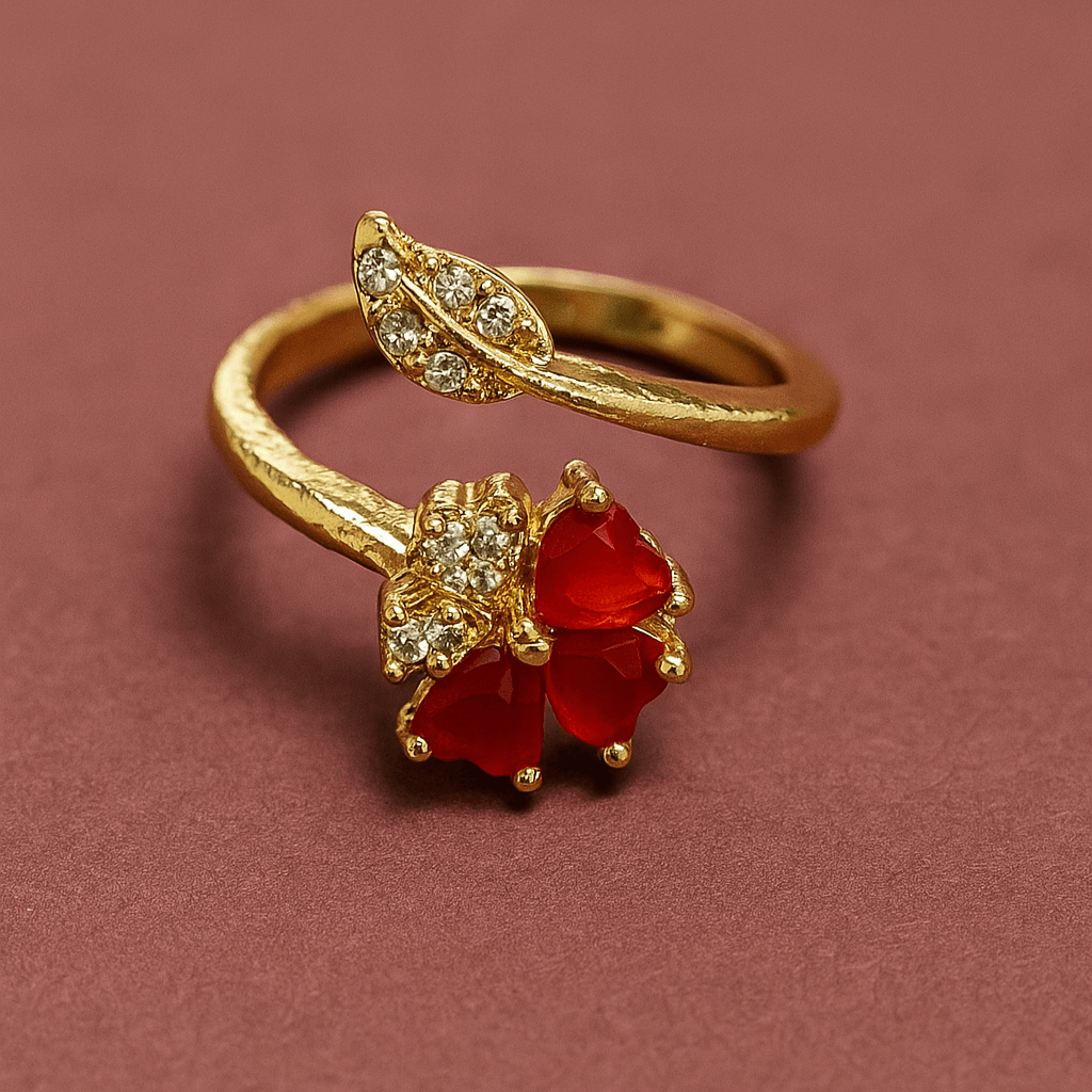 - PRODUCT DETAILS : This gold-toned ring offers a striking blend of nature-inspired elegance and modern design. The band extends into a sleek, horizontal, leaf-like shape, gracefully perched above a charming cluster of four red, heart-shaped stones arranged like a delicate clover. The combination of geometric lines and organic curves, accented by vibrant color, creates a fresh and eye-catching look. This piece is perfect for anyone who appreciates bold yet elegant jewelry with a unique twist.