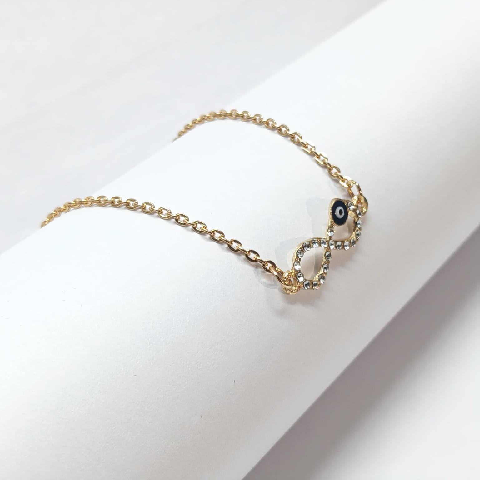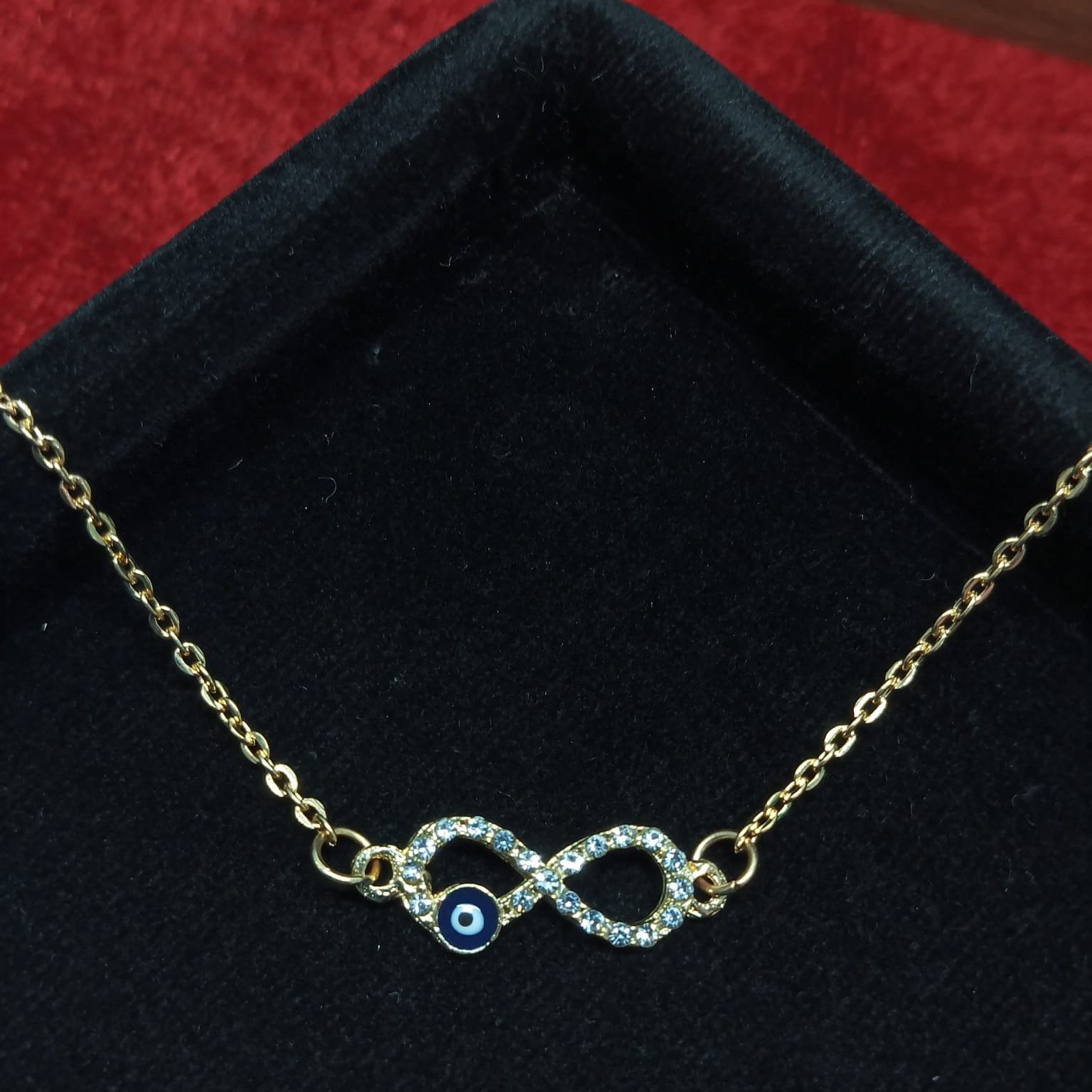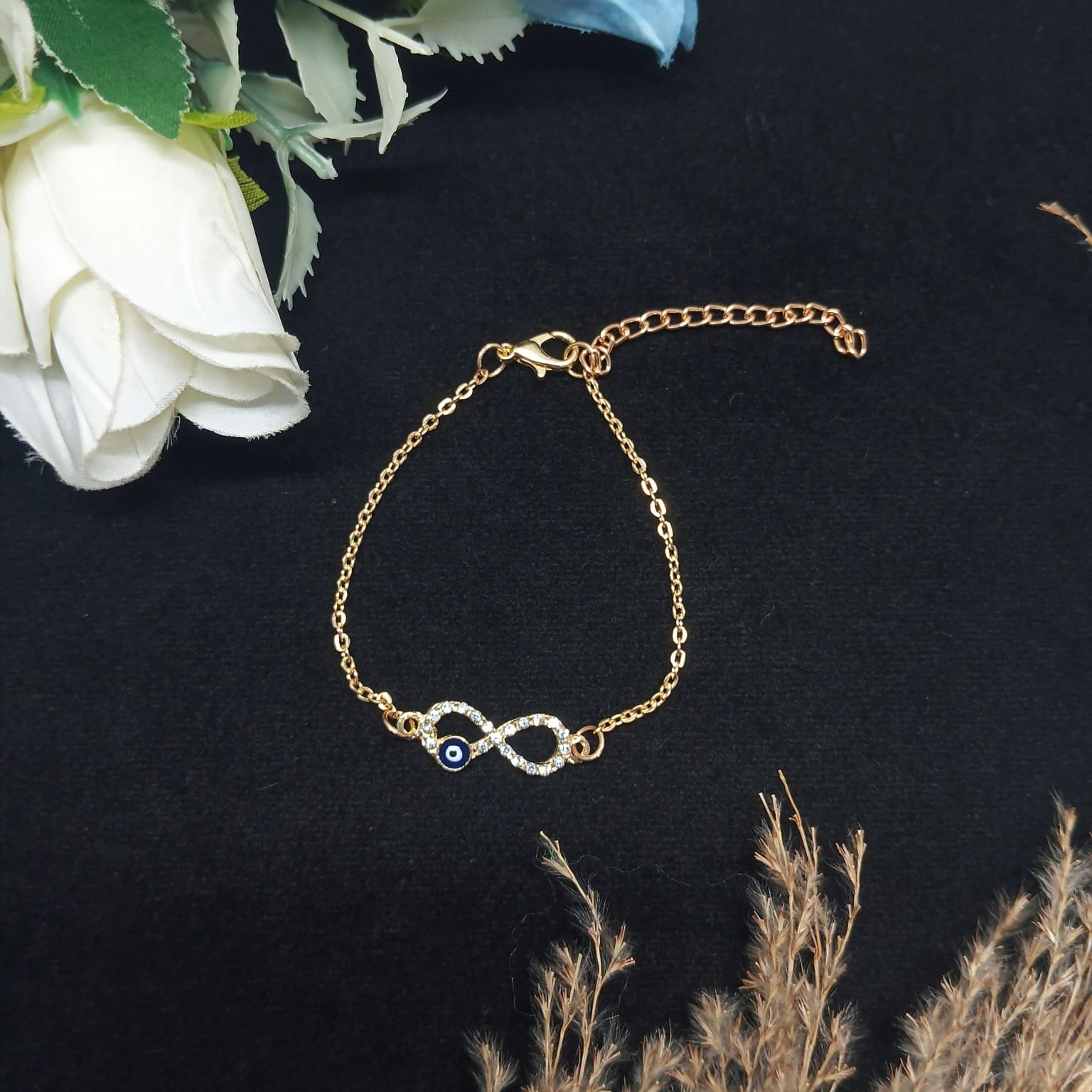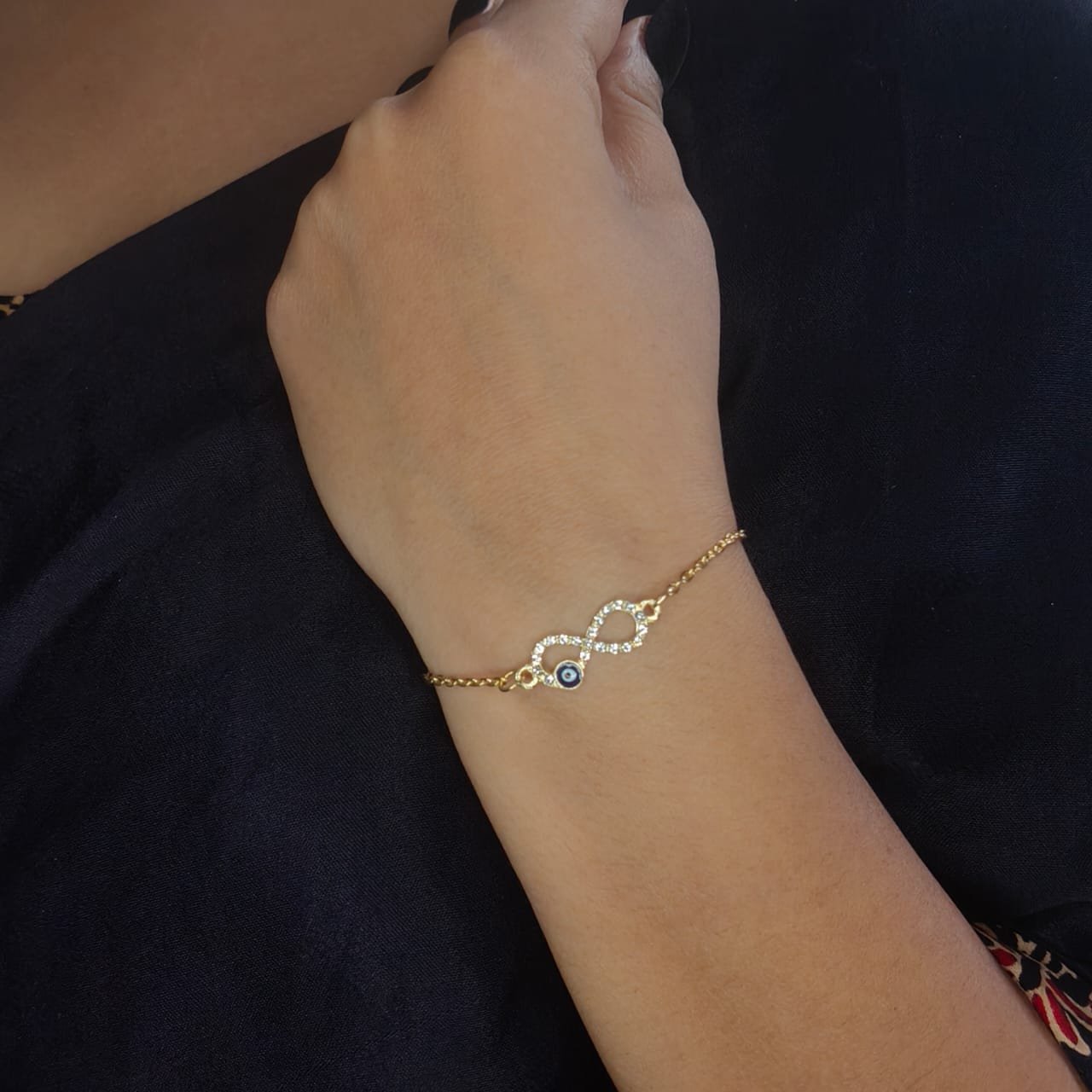 - PRODUCT DETAILS: This elegant piece features a timeless infinity charm with evil eye symbol, representing endless love, strength, and connection. Designed to be worn as a bracelet , the accessory includes a slender chain with the infinity symbol seamlessly integrated into the center Crafted from a alloy material with a gold tone finish, the bracelet offers a refined look suitable for everyday or special occasions. Its lightweight design and adjustable clasp ensure a secure and comfortable fit.