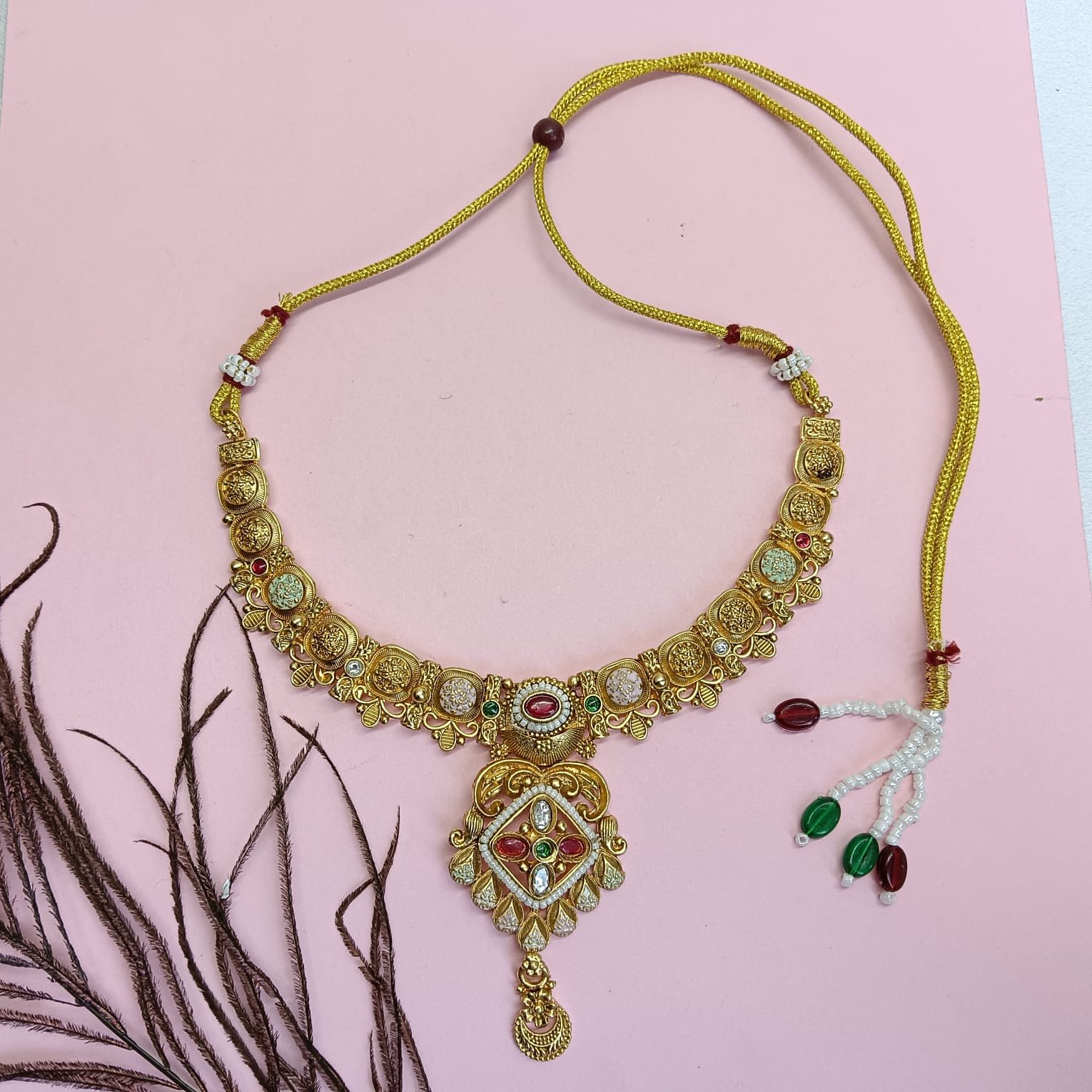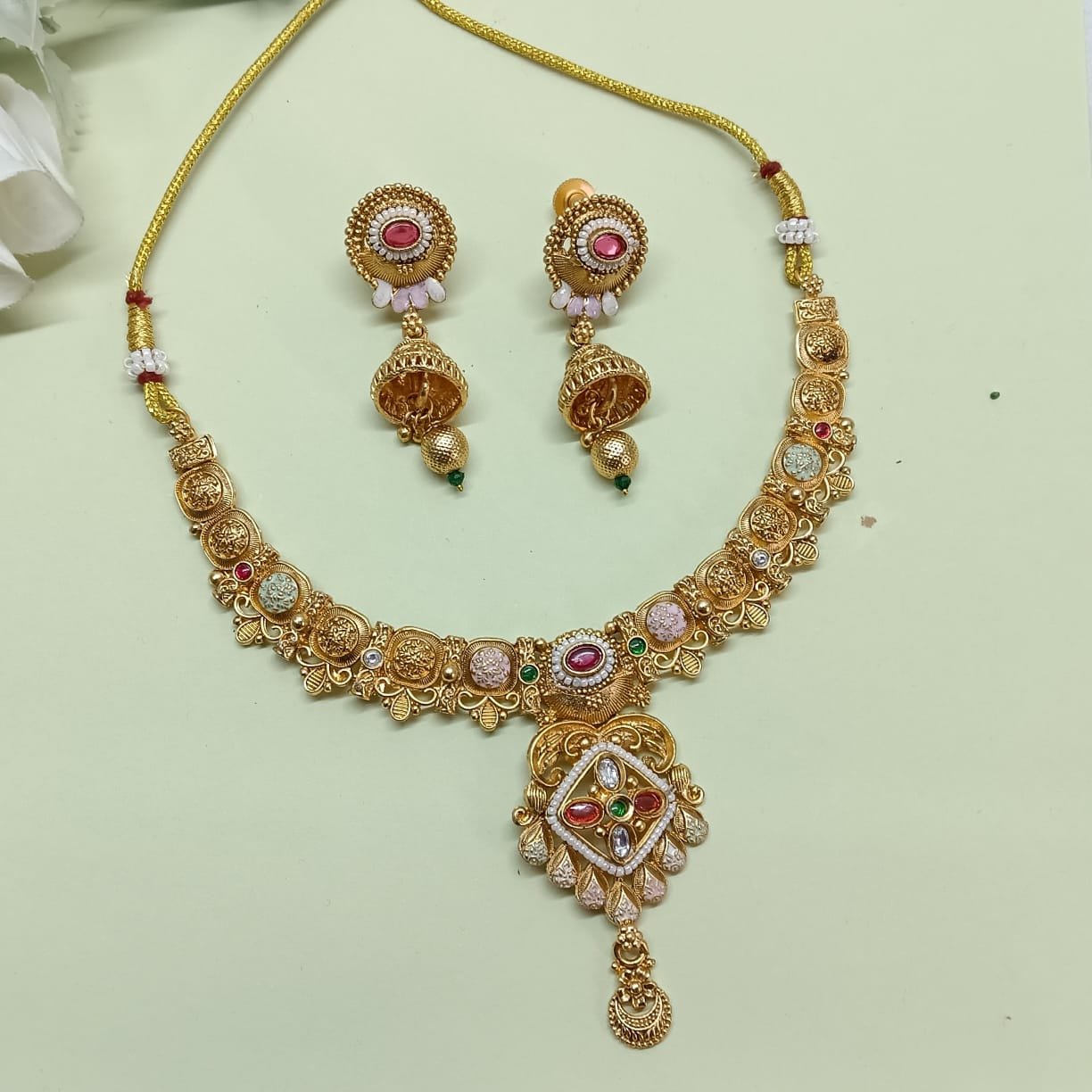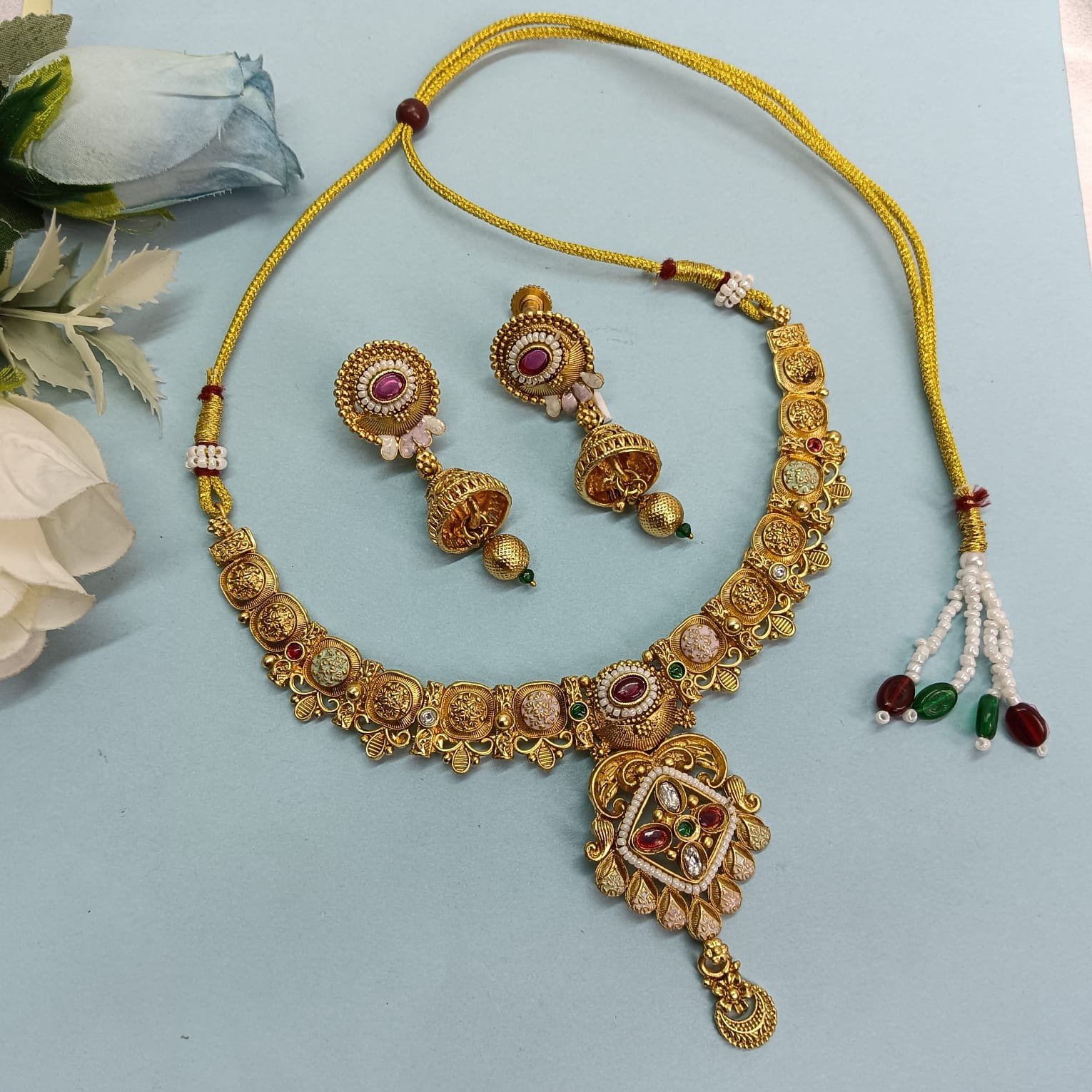 - PRODUCT DETAILS: Celebrate tradition and elegance with this gold-tone necklace and matching Jhumka earrings set. The necklace features ornate circular motifs, intricately embossed and accented with colorful stones in ruby red, emerald green, and soft pink. The central pendant, adorned with multi-colored stones and a delicate drop, adds a regal touch. The Jhumka earrings mirror the necklace’s design, showcasing the same detailed circular base and vibrant stone accents. Lightweight and comfortable, this set drapes gracefully, making it perfect for weddings, festivals, and special occasions.