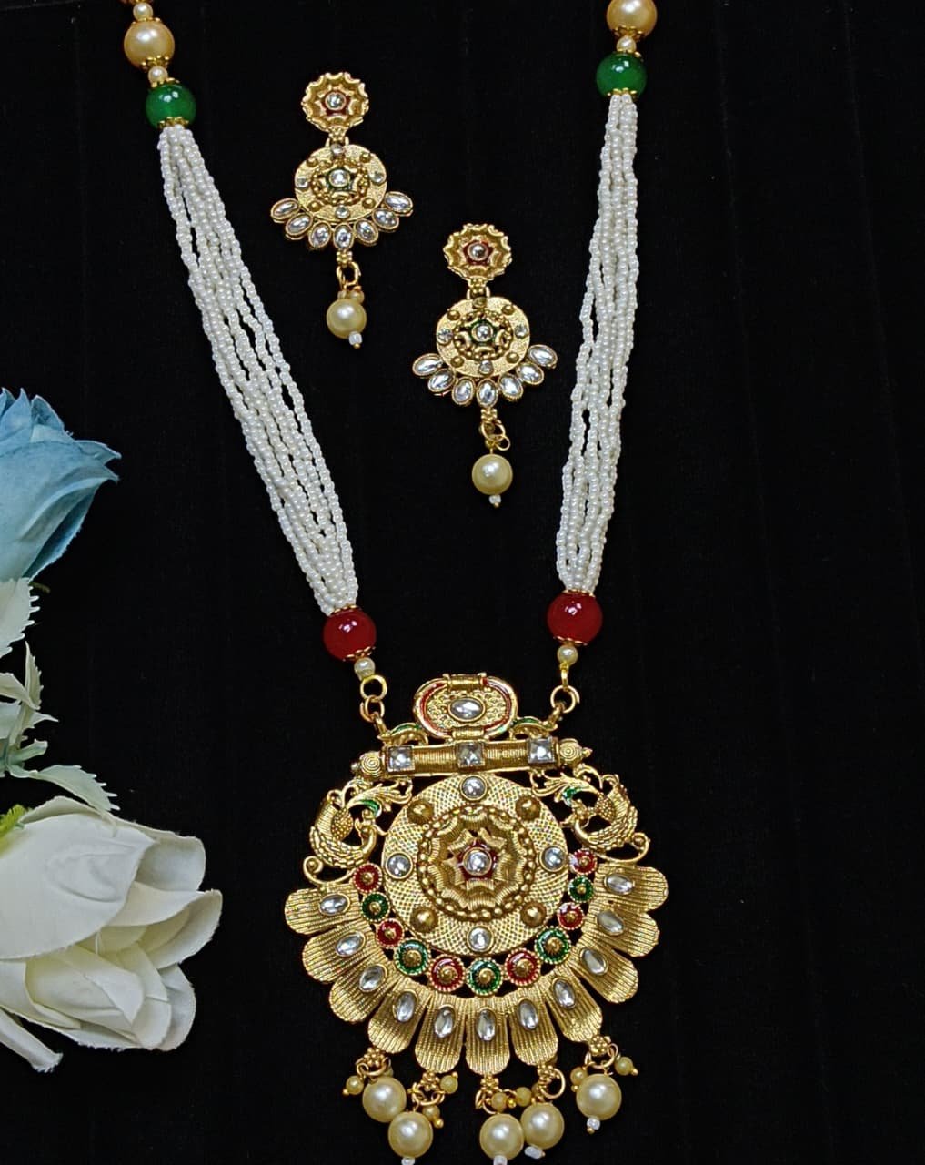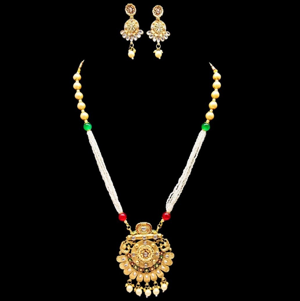 - PRODUCT DETAILS: This traditional Indian jewelry set features a gold-toned necklace and matching earrings. The necklace showcases a large circular pendant with an intricate filigree pattern, embellished with colorful Kundan stones in red, green, and white. Dangling pearls adorn the bottom of the pendant, adding elegance to the design. The necklace chain has a dual-style design: the upper portion is a single strand of cream-colored pearls with accent beads, while the lower portion consists of multiple strands of small white beads that connect to the pendant. The earrings are a smaller, complementary version of the pendant, each with Kundan stones and a single dangling pearl. Gold-plated and Kundan-studded, this set is perfect for weddings, festivals, and traditional celebrations.