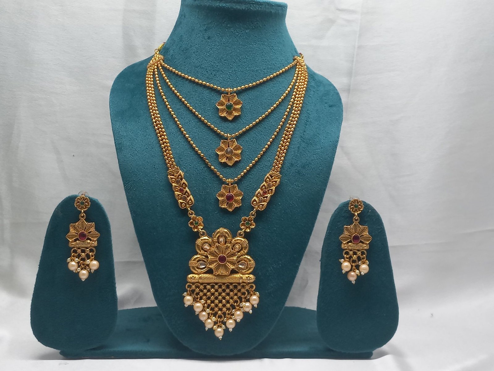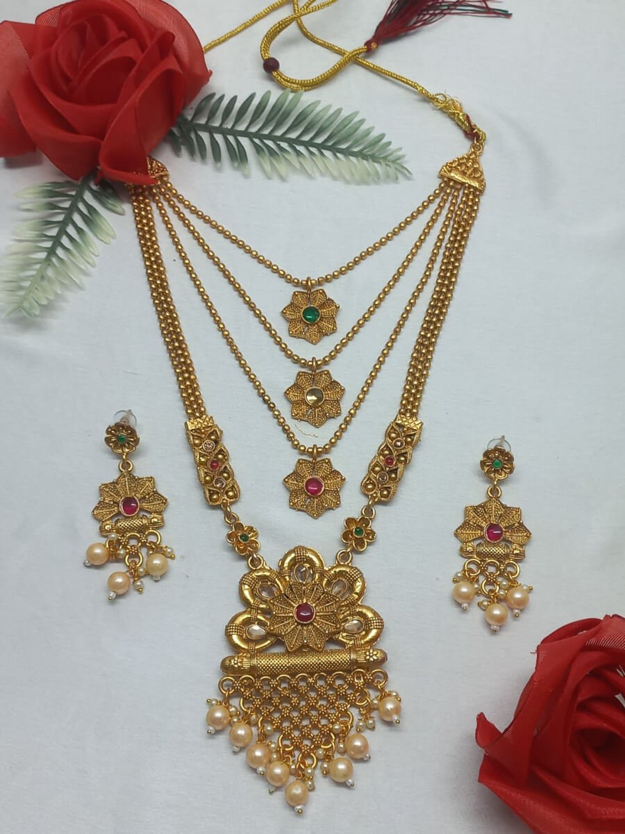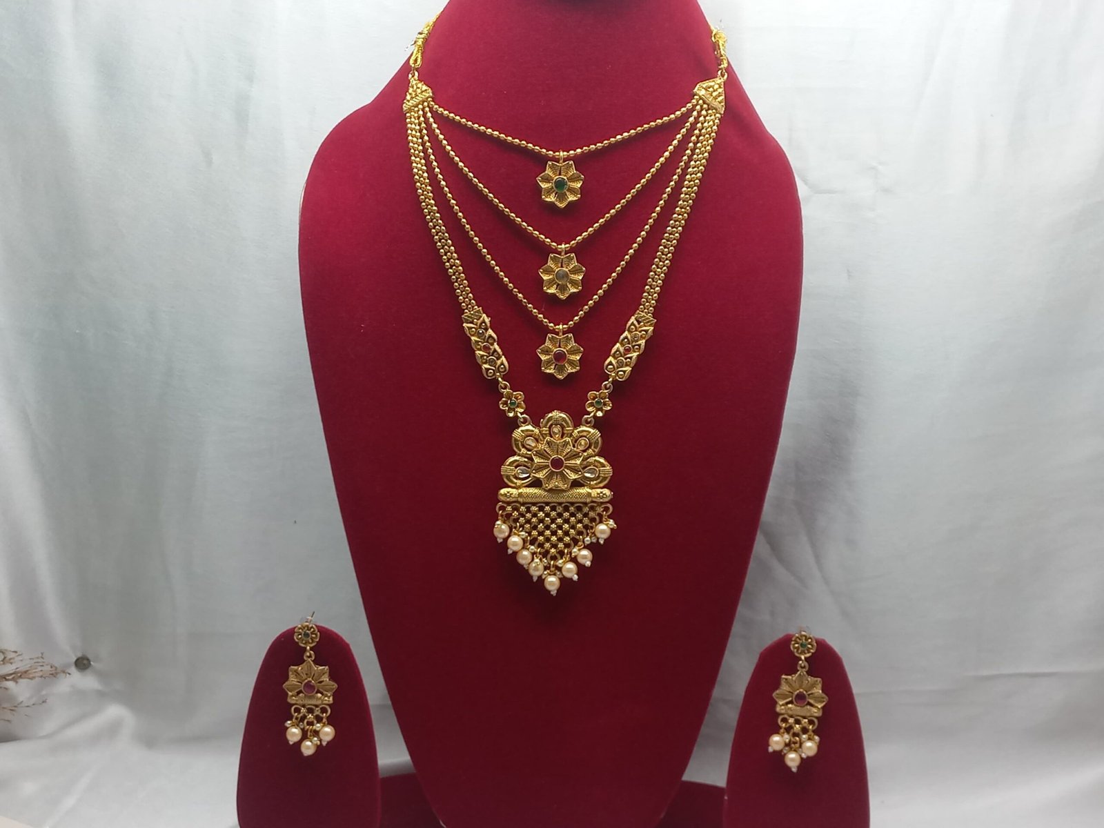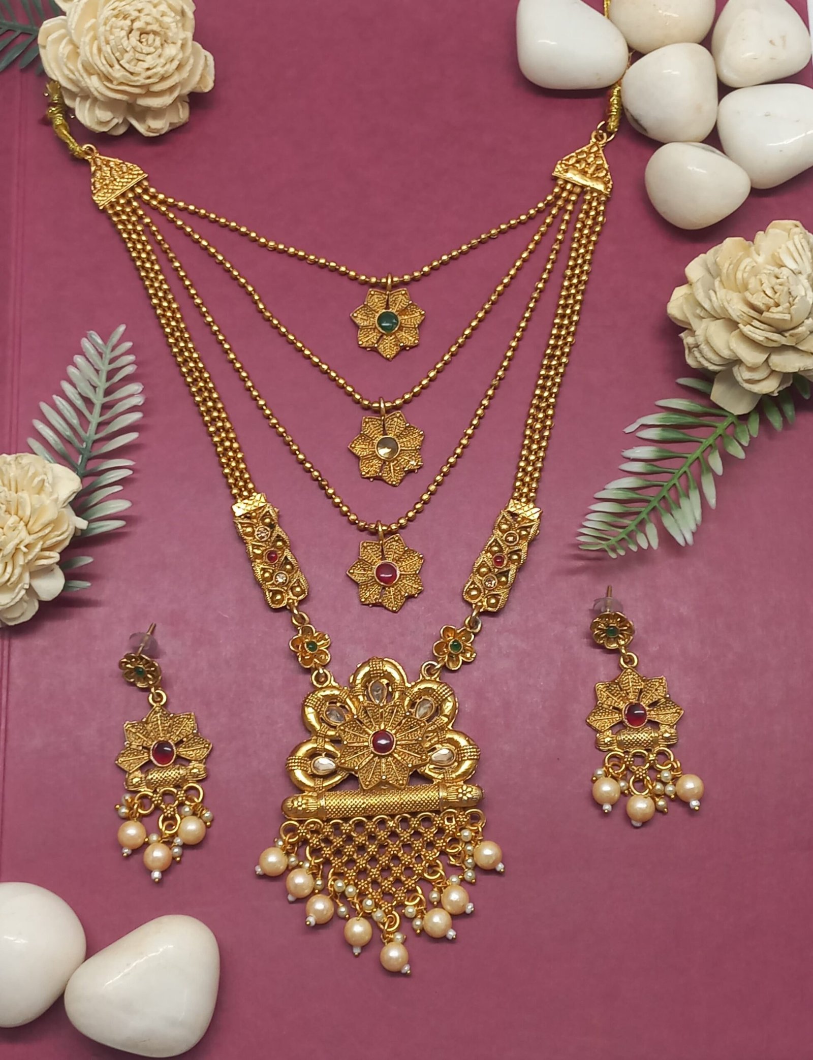 - PRODUCT DETAILS: Embrace classic elegance with this beautifully crafted 4-strand gold-toned necklace set. Designed with traditional flair, the necklace features three fine chains, each adorned with intricate floral pendants, and a prominent fourth strand with a bold, detailed centerpiece embellished with delicate pearl drops. The matching earrings reflect the floral theme and also feature subtle pearl accents, creating a cohesive and graceful look. Ideal for weddings, festive occasions, and cultural events, this set adds timeless charm to any ethnic ensemble.