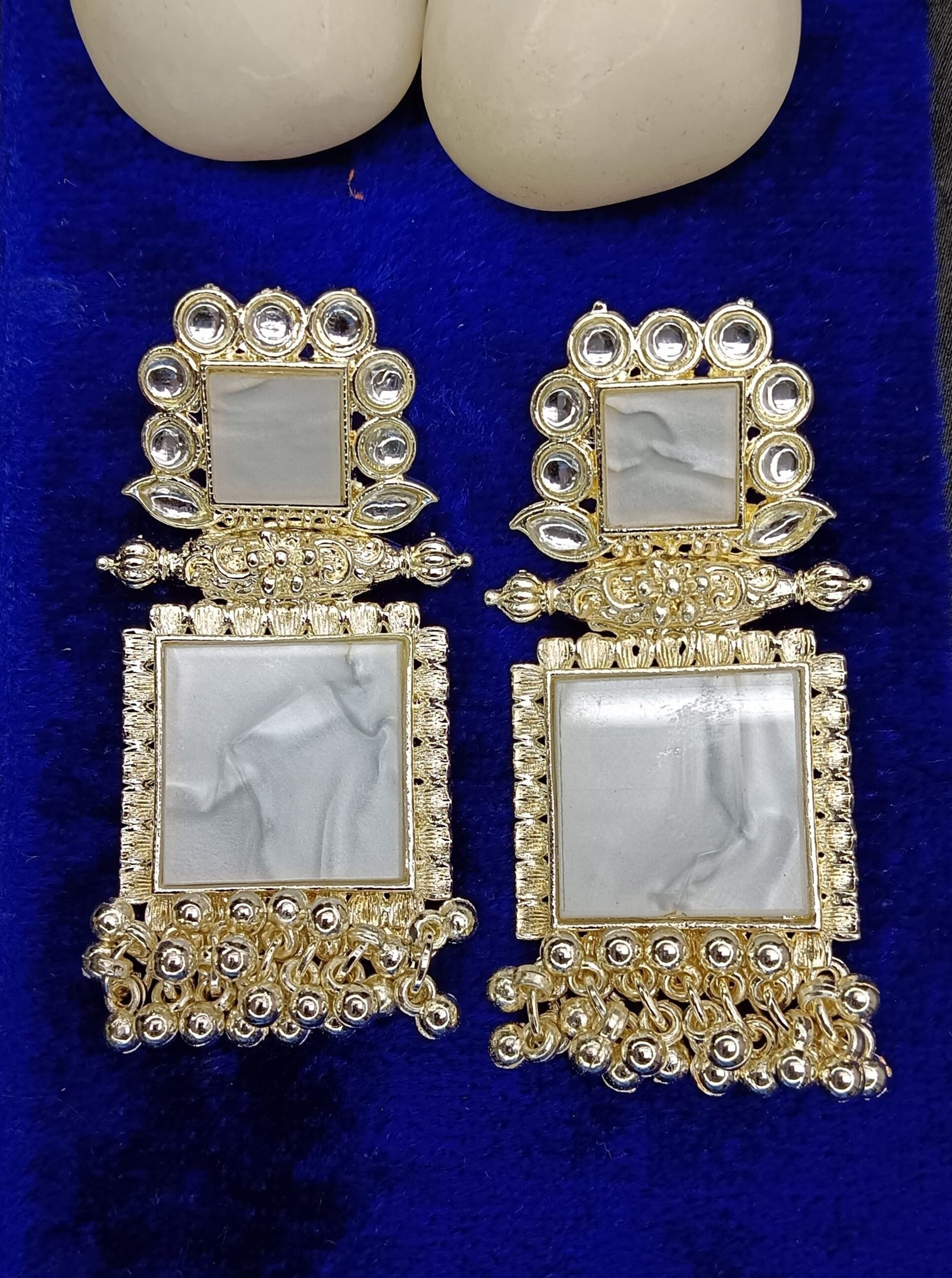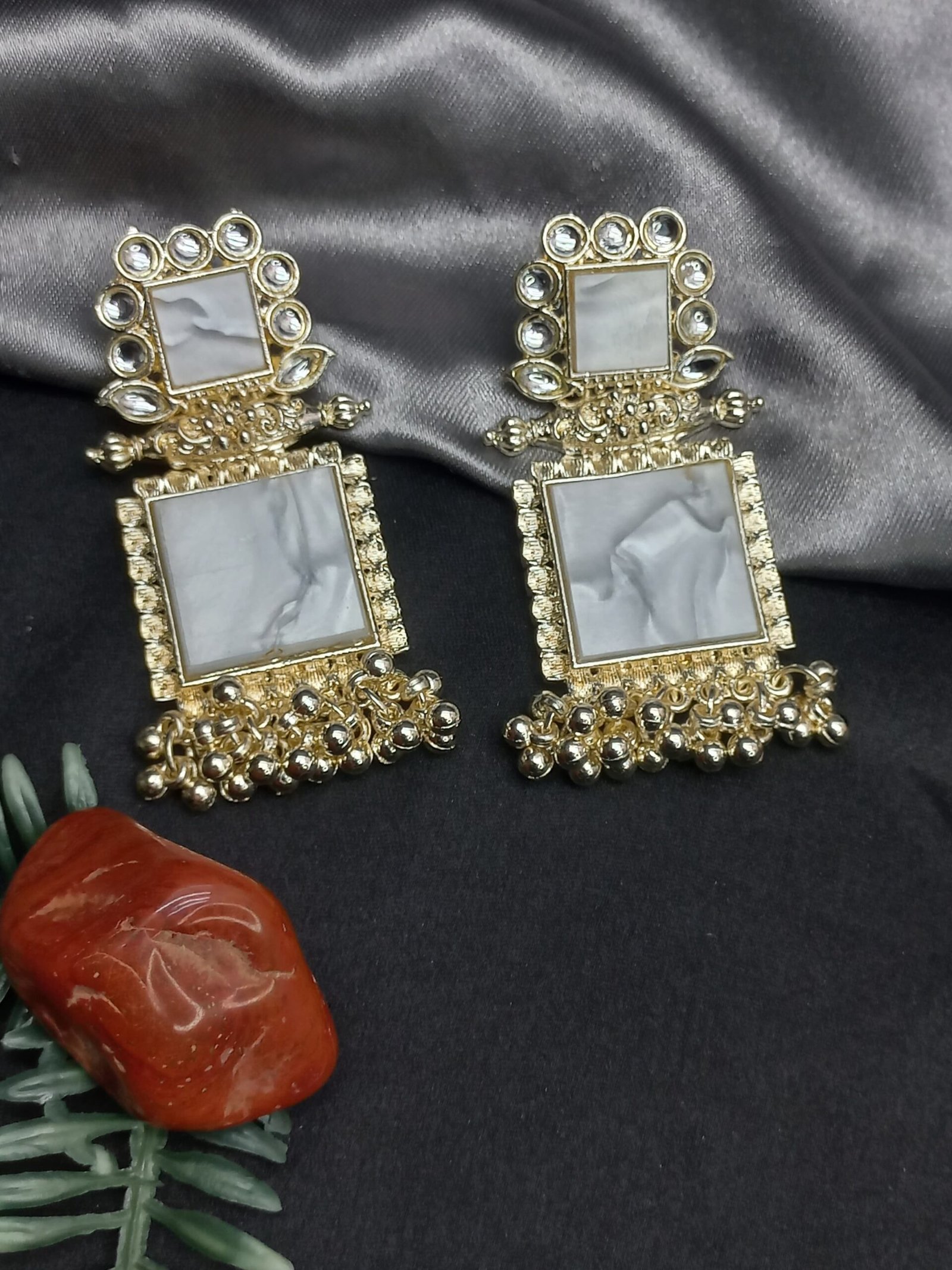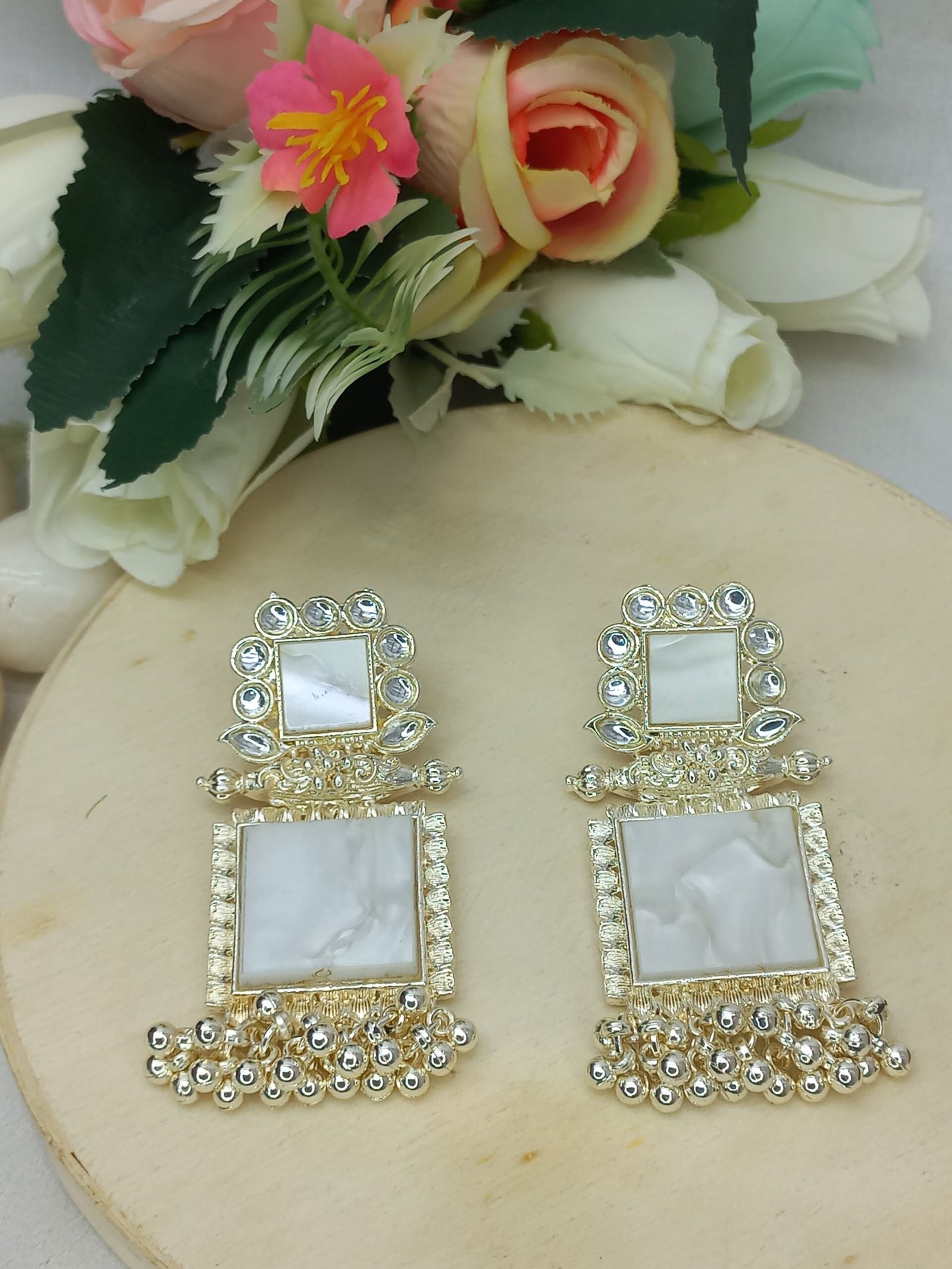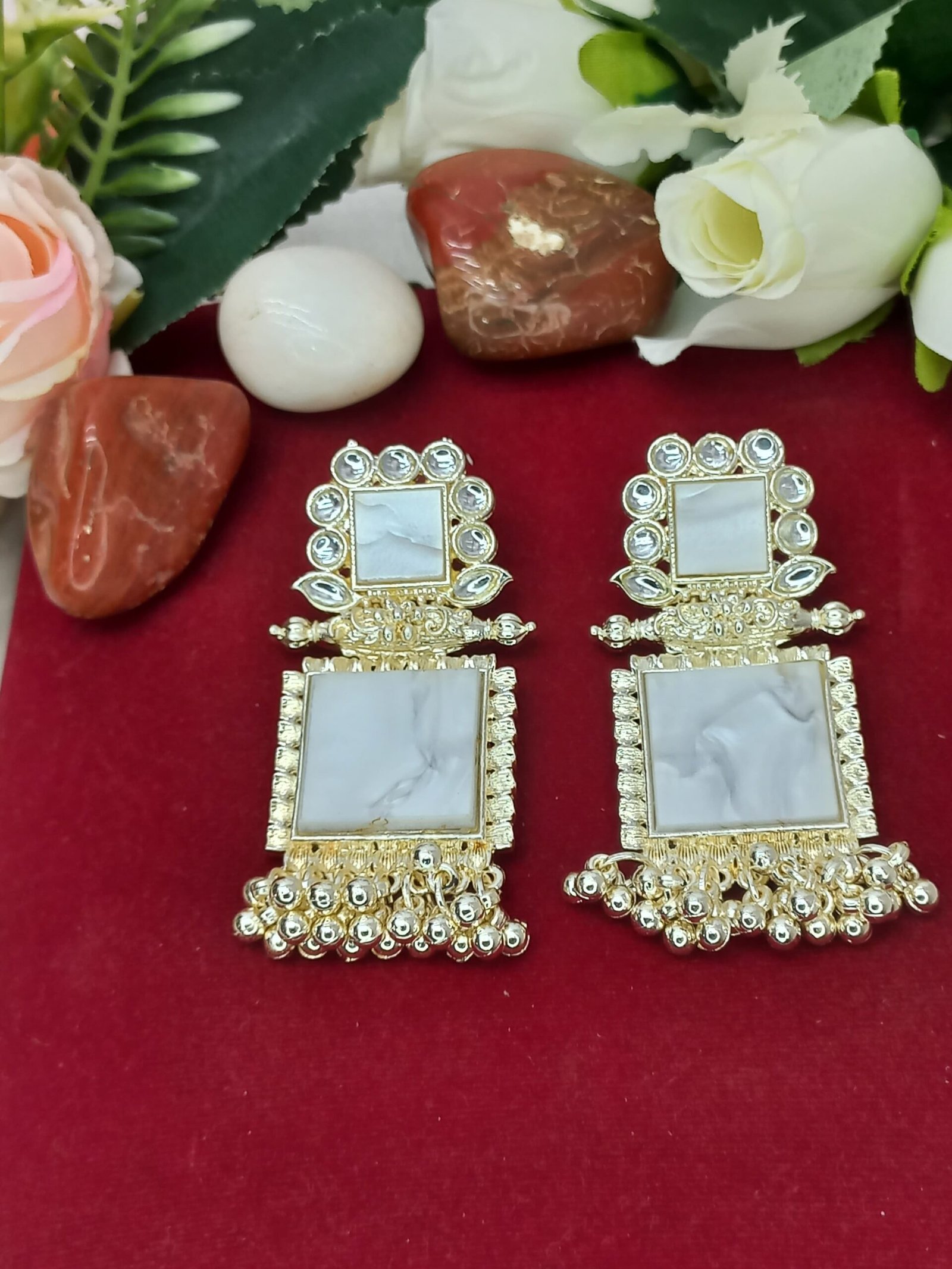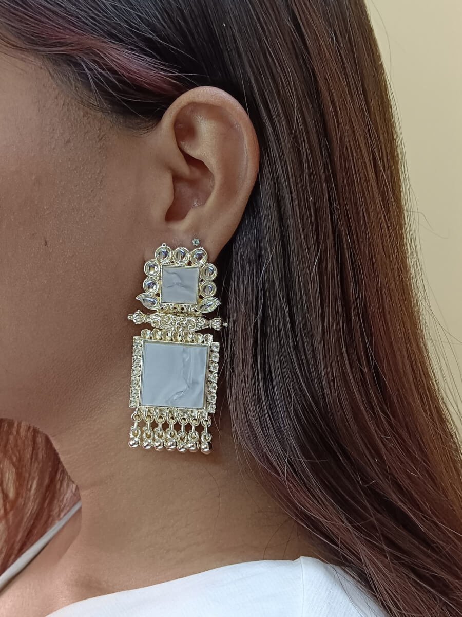 - PRODUCT DETAILS: Make a refined style statement with these NIPSTec handcrafted square drop earrings, designed for women who love jewelry that blends traditional Indian elegance with a modern edge. These earrings feature two square elements — the top embellished with imitation mirror stones that reflect light beautifully, and the bottom crafted from polished resin for a bold, contemporary look. The earrings are finished with clustered bead dangles that add movement and charm, all set in a rich gold-toned alloy base. These earrings are perfect for a wide range of occasions, from traditional events like weddings, sangeet, mehndi, and Diwali, to festive family gatherings and formal receptions. They also complement fusion and Indo-western outfits beautifully, making them a great choice for college festivals, cultural nights, or evening parties Whether you’re dressing up a saree or adding a statement piece to a modern gown or kurti, these earrings bring the right balance of sophistication and sparkle.