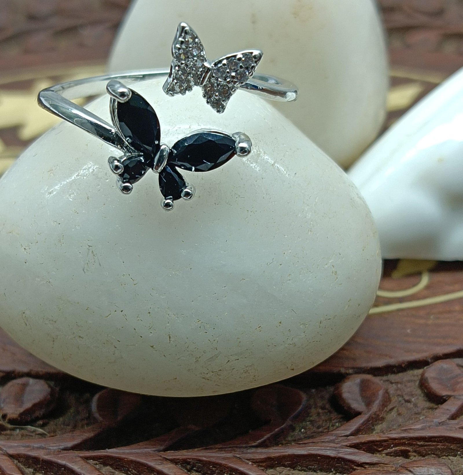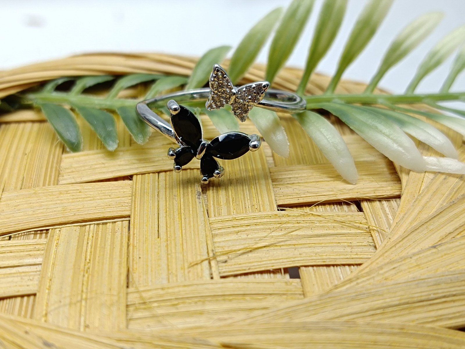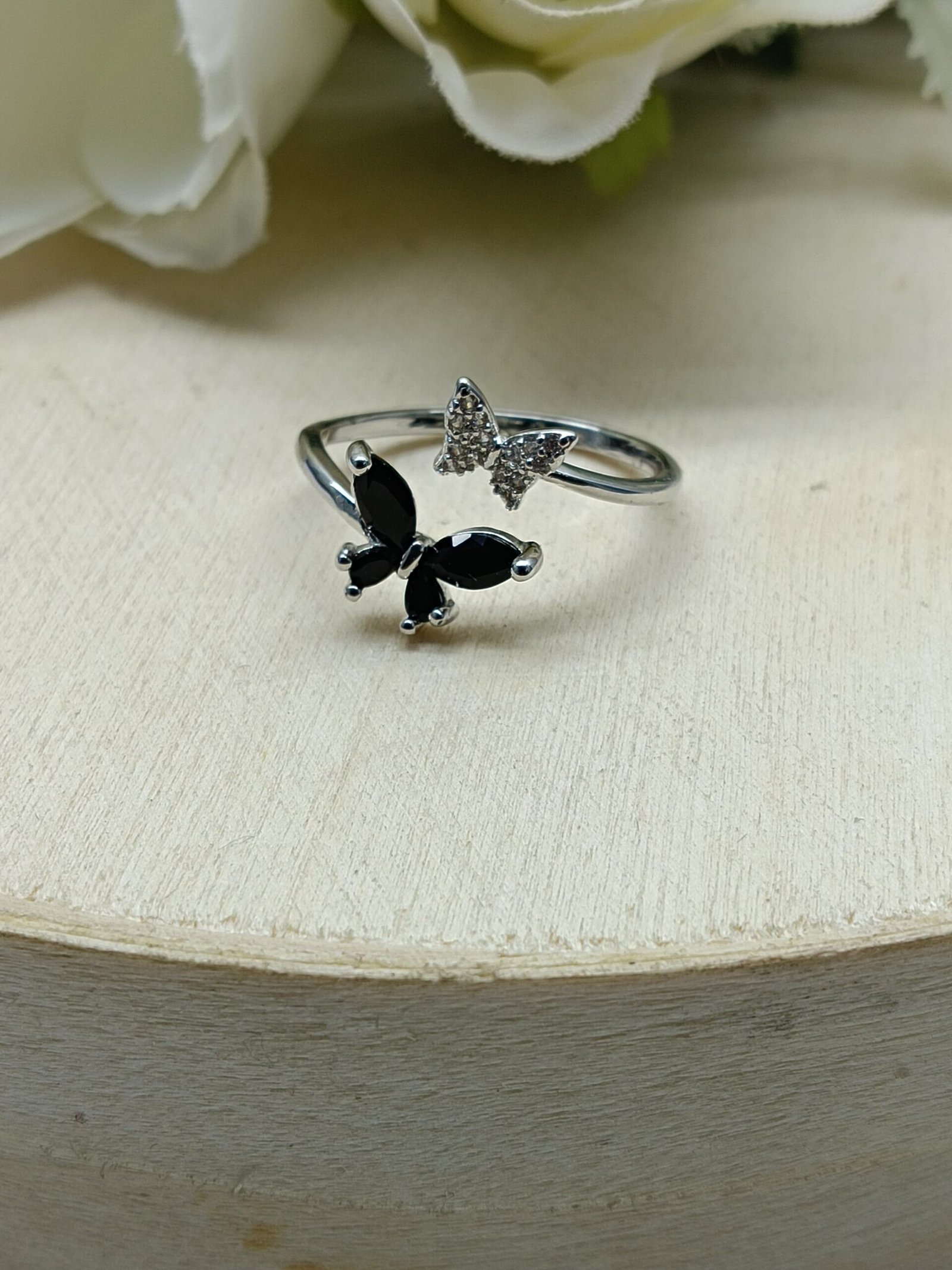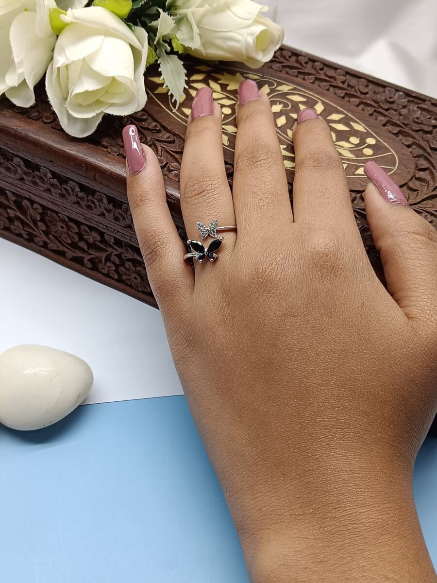 - PRODUCT DETAILS: Embrace bold elegance with this striking butterfly ring, thoughtfully crafted from silver-plated alloy. The design features a graceful butterfly with one wing adorned in tiny clear glass stones and the other highlighted with rich black gemstone-like accents. Black symbolizes strength, elegance, mystery, and transformation—making this ring a powerful expression of personal style and inner resilience. More than just a beautiful accessory, this ring serves as a meaningful reminder of self-discovery and growth. Its slender band ensures a comfortable fit, allowing the butterfly motif to remain the standout feature. Perfect for both special occasions and daily wear, this ring adds depth and distinction to any look.