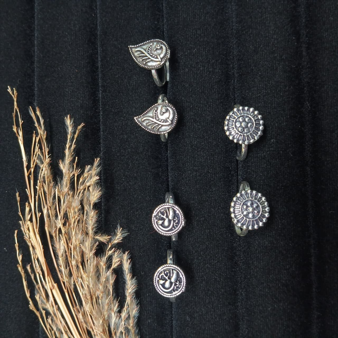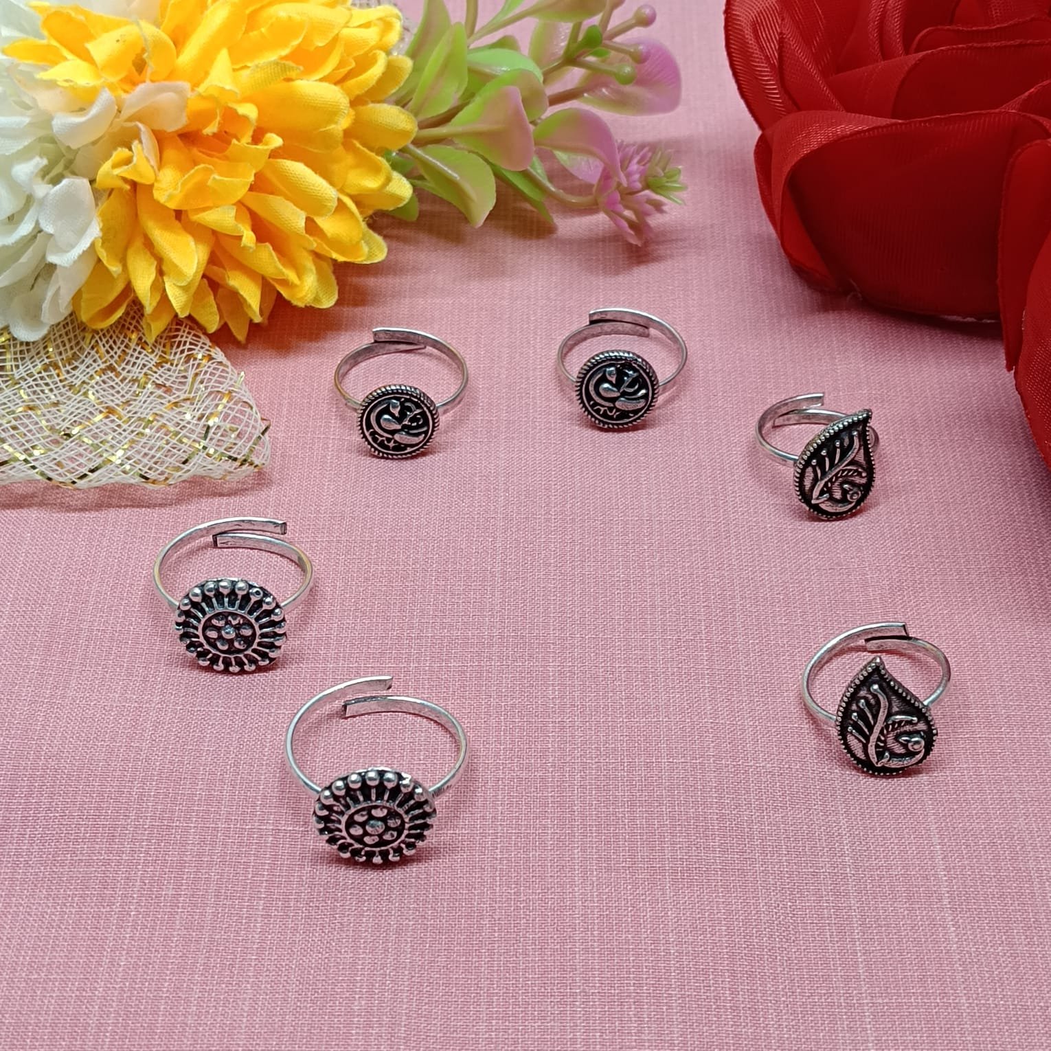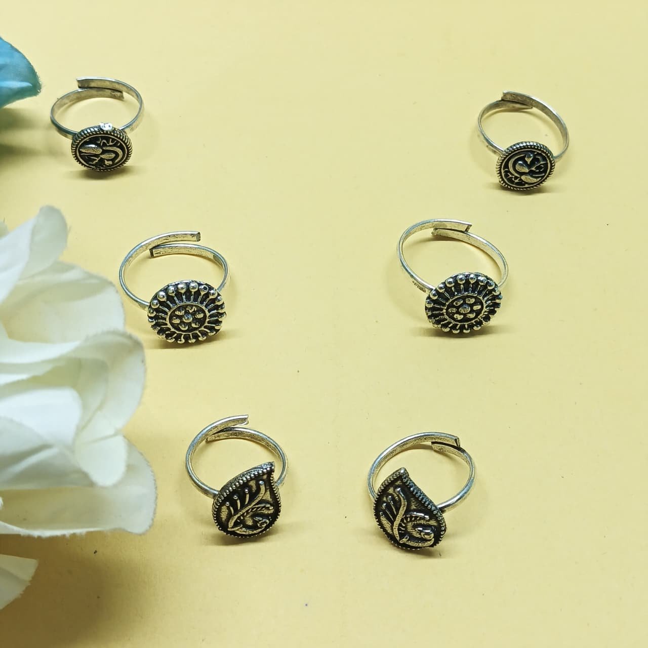 - PRODUCT DETAILS: This set of 3 German Silver toe rings is crafted from a durable alloy with a refined silver finish for a timeless look. Each ring showcases intricate detailing with circular and leaf-inspired motifs, highlighting traditional craftsmanship. Designed with adjustable open bands, these toe rings ensure a secure and comfortable fit for most sizes. Their lightweight build makes them easy to wear all day, whether for weddings, festive occasions, or as an elegant accessory with traditional and ethnic outfits.
