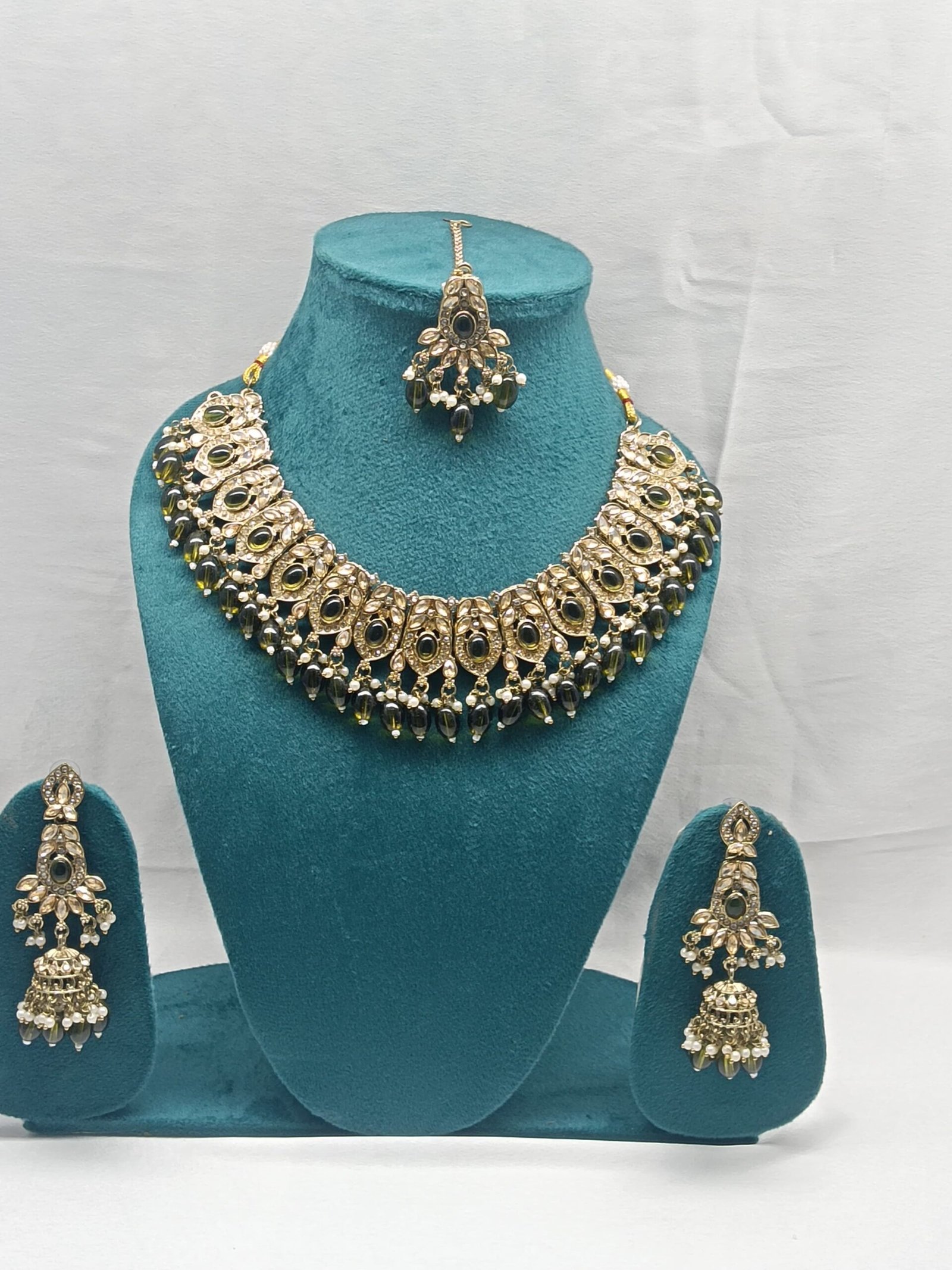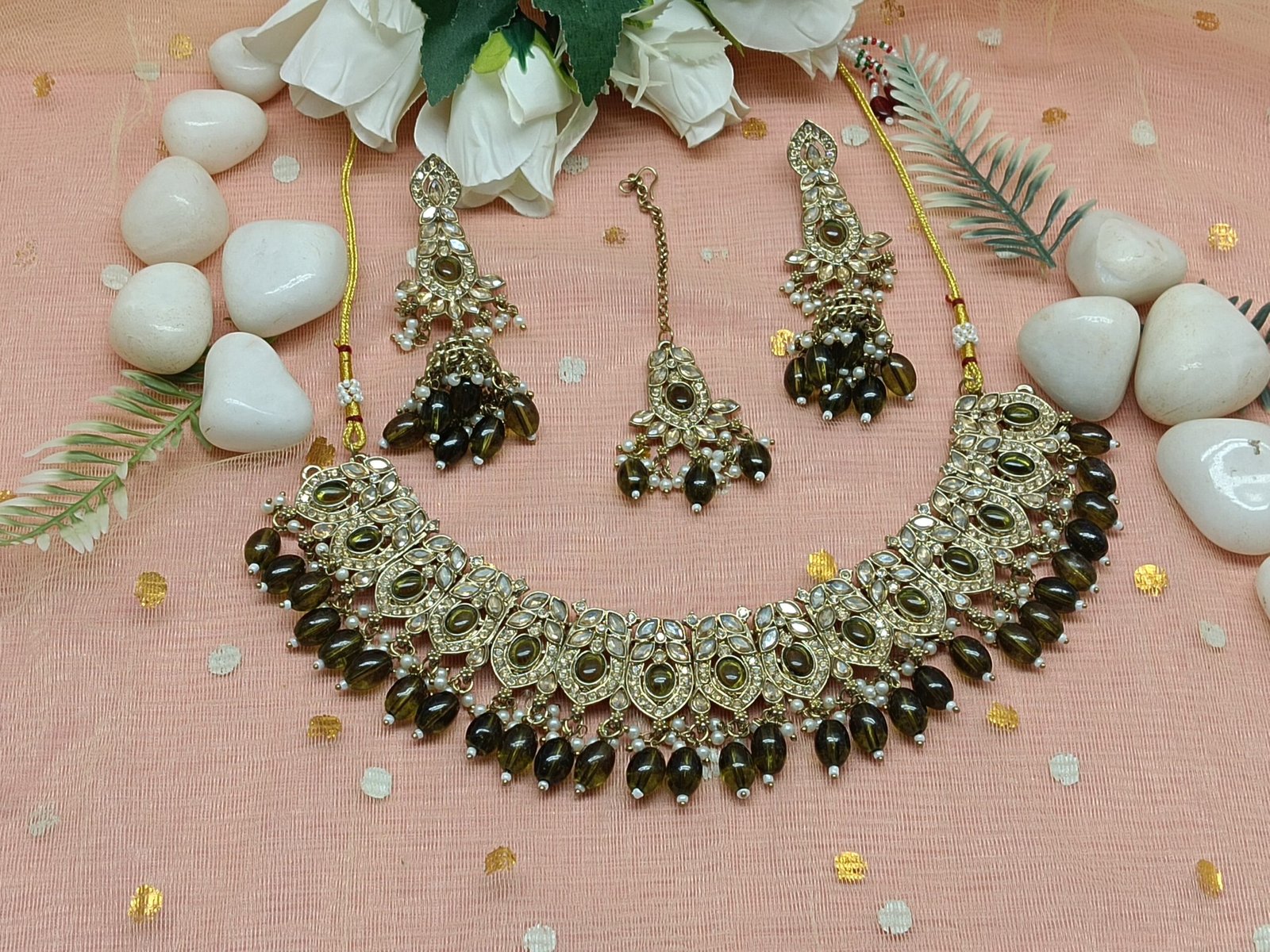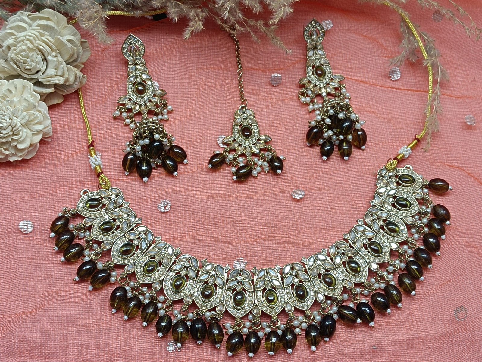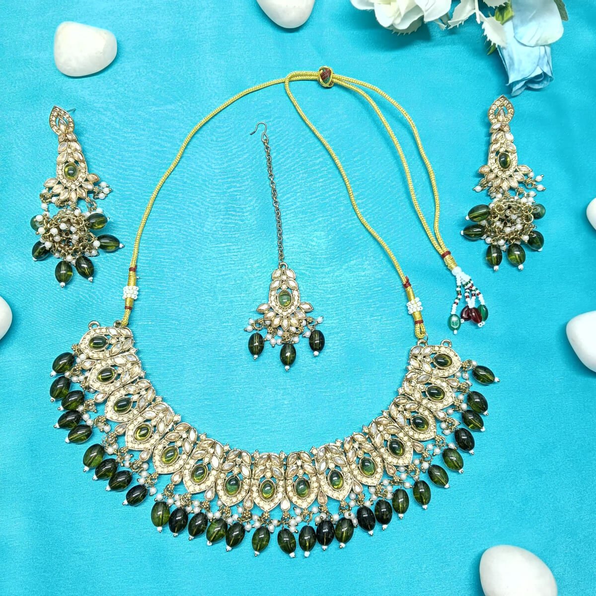 - PRODUCT DETAILS: Celebrate tradition with this exquisite Kundan Meenakari jewelry set, featuring a statement necklace, a maang tikka (head ornament), and a matching pair of earrings. Designed in an elegant blend of green and white stones, this set captures the richness of Indian craftsmanship with intricate patterns and artistic detailing.The broad choker-style necklace is crafted from a durable gold-tone metal base and showcases meticulous handwork with Kundan settings and Meenakari enamel accents. The earrings and tikka mirror the same intricate design, offering a coordinated and graceful look. This set is perfect for weddings, festive gatherings, or cultural celebrations, adding a regal charm to any ethnic ensemble.