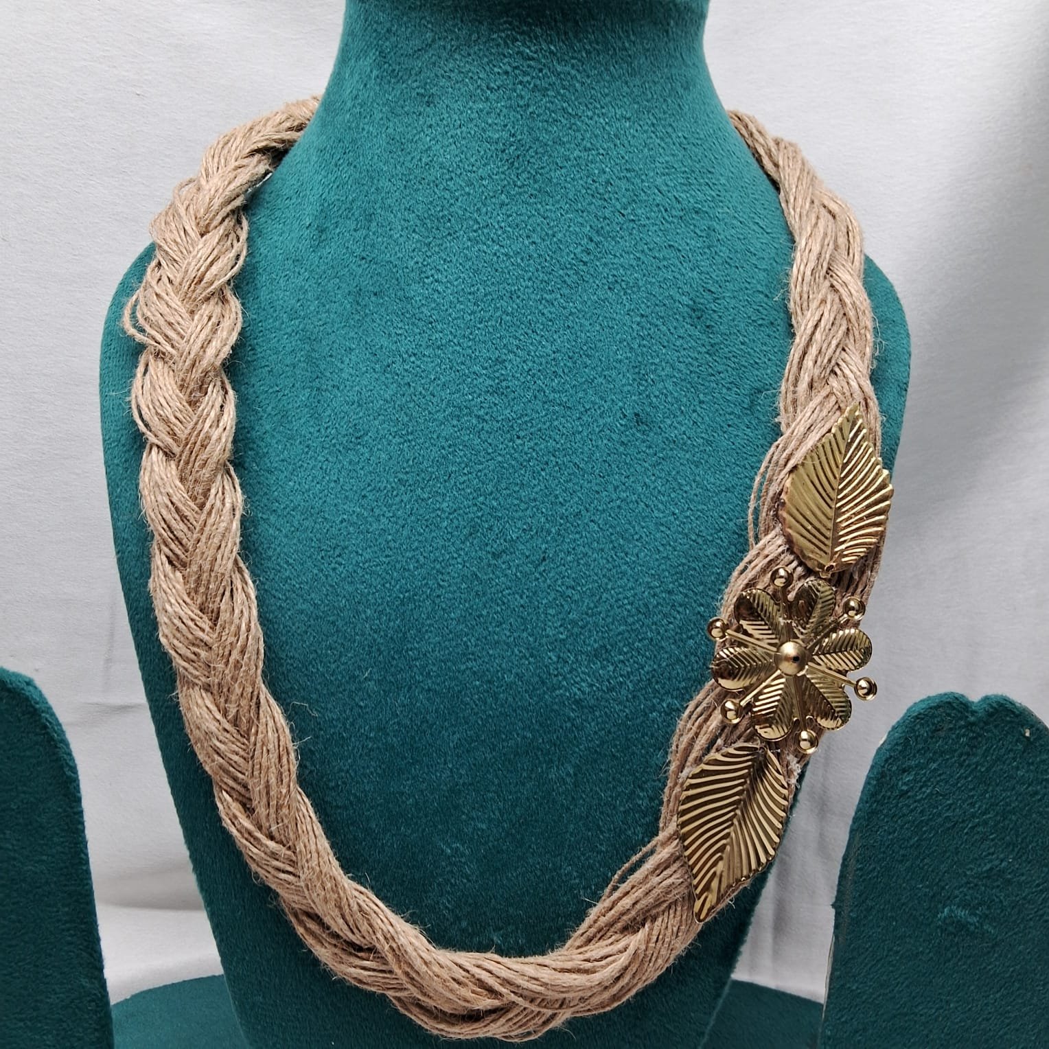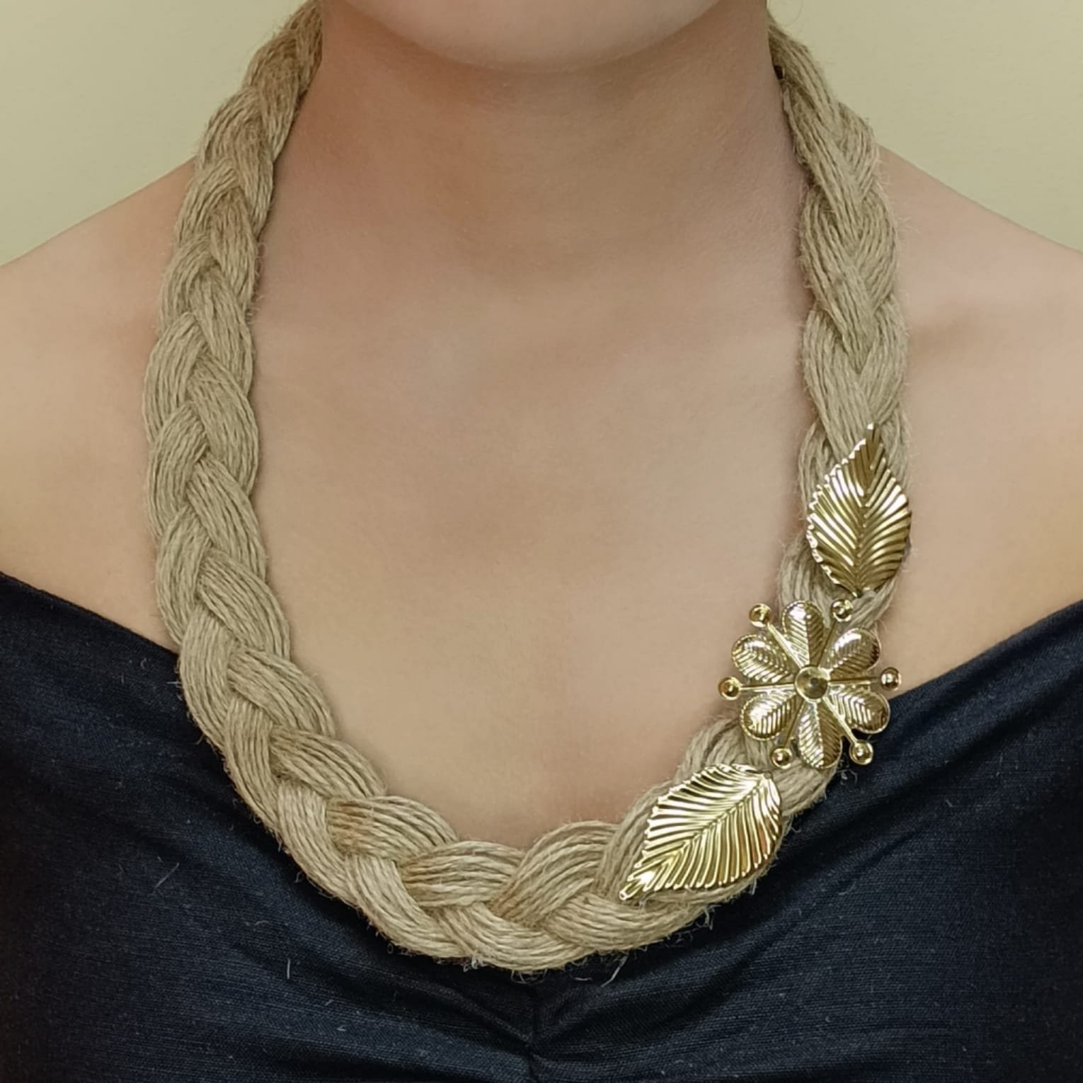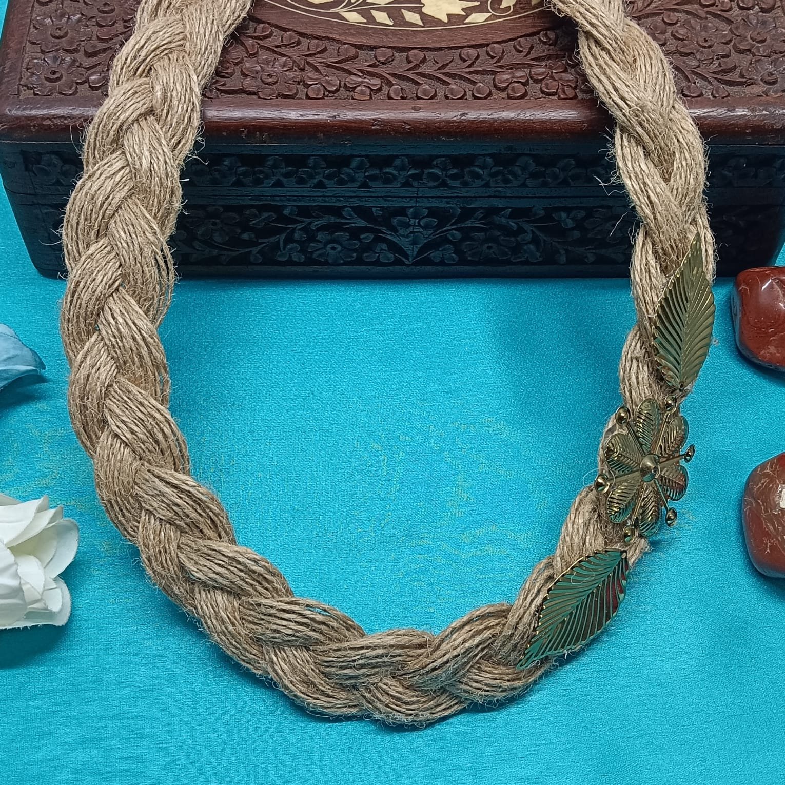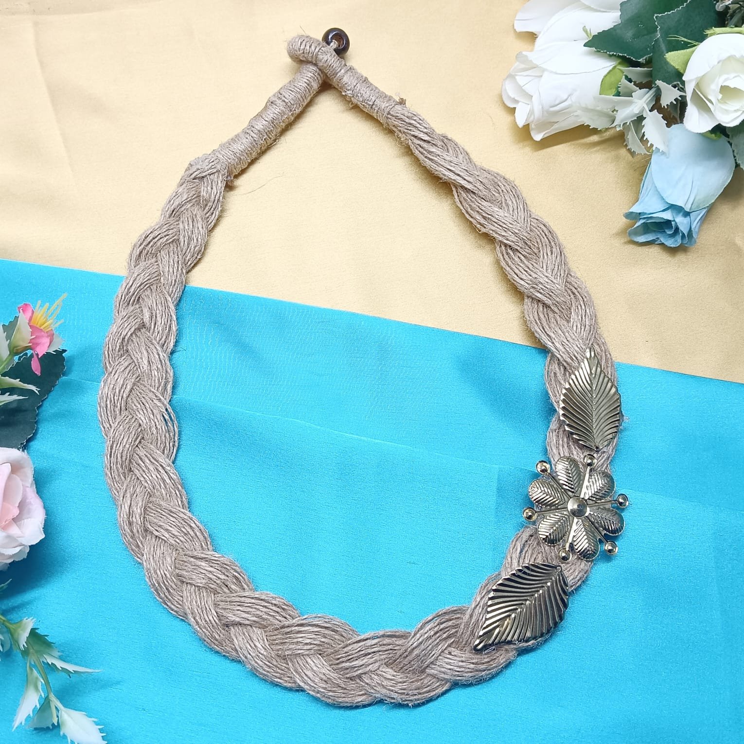 - PRODUCT DETAILS: Infuse natural elegance into your style with this beautifully handcrafted jute rope necklace. Woven from biodegradable, eco-conscious jute fibers, this piece combines rustic charm with artistic detail. The centerpiece features a delicate metallic motif—an intricately sculpted flower flanked by two graceful leaves—adding a striking bohemian flair to any outfit. Perfect for nature lovers and style seekers alike, this necklace is a lightweight, breathable accessory that complements both everyday wear and festive ensembles. Whether you’re dressing up for a casual gathering or a cultural celebration, this necklace adds a touch of sustainable sophistication to your look.