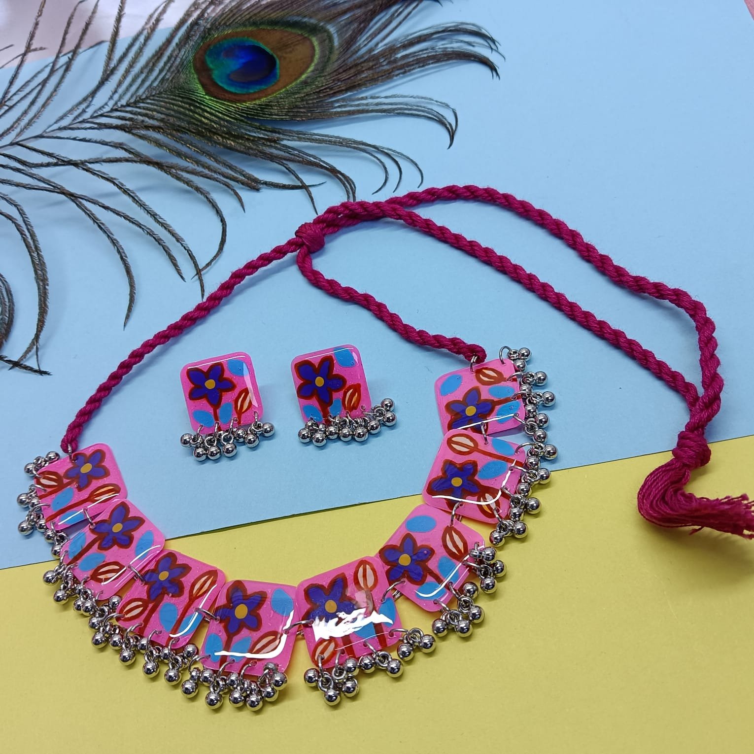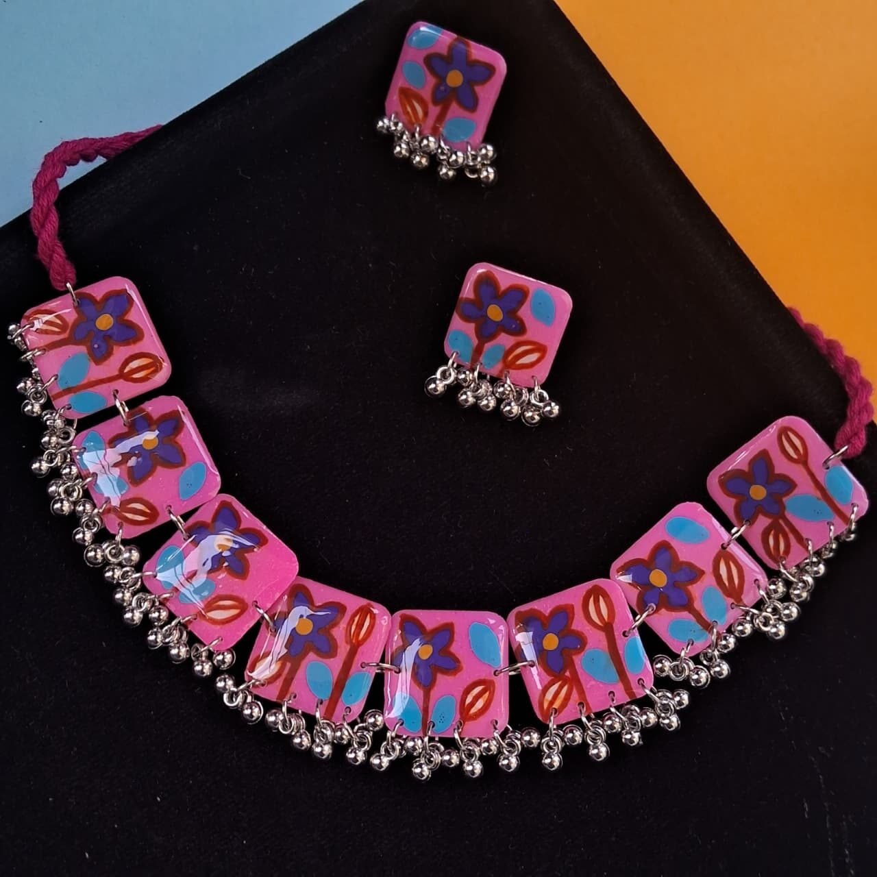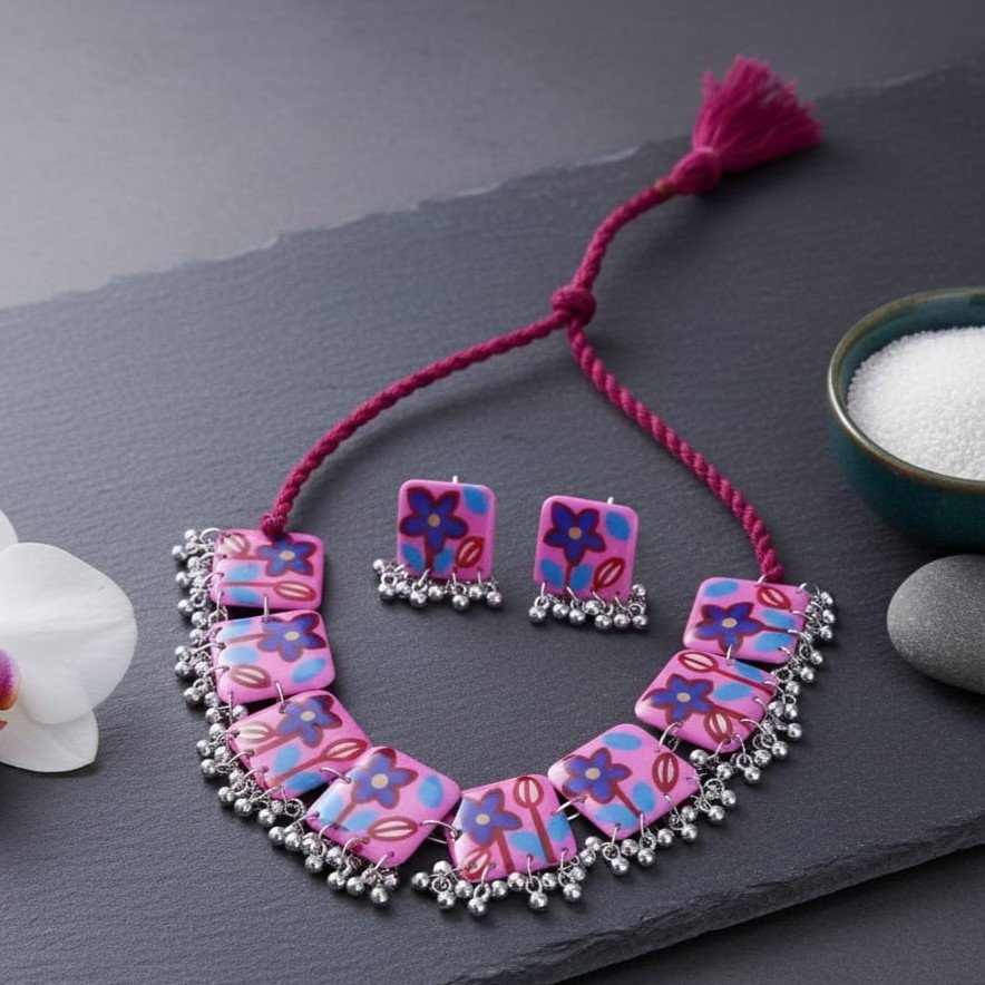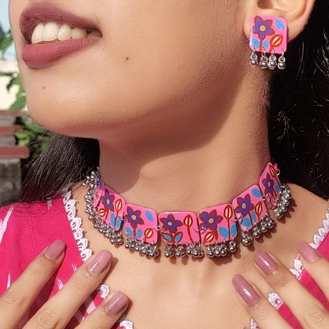 - PRODUCT DETAILS: This handmade resin choker necklace set features a vibrant pink base adorned with delicate hand-painted floral motifs in blue and purple. The choker is enhanced with traditional German silver ghungroo accents along the edges, adding movement and ethnic charm. Completing the set, the matching stud earrings are crafted with German silver ghungroos, creating a perfectly coordinated look. Lightweight yet eye-catching, this jewelry set beautifully blends artistry and tradition, making it ideal for weddings, festive occasions, and cultural celebrations.